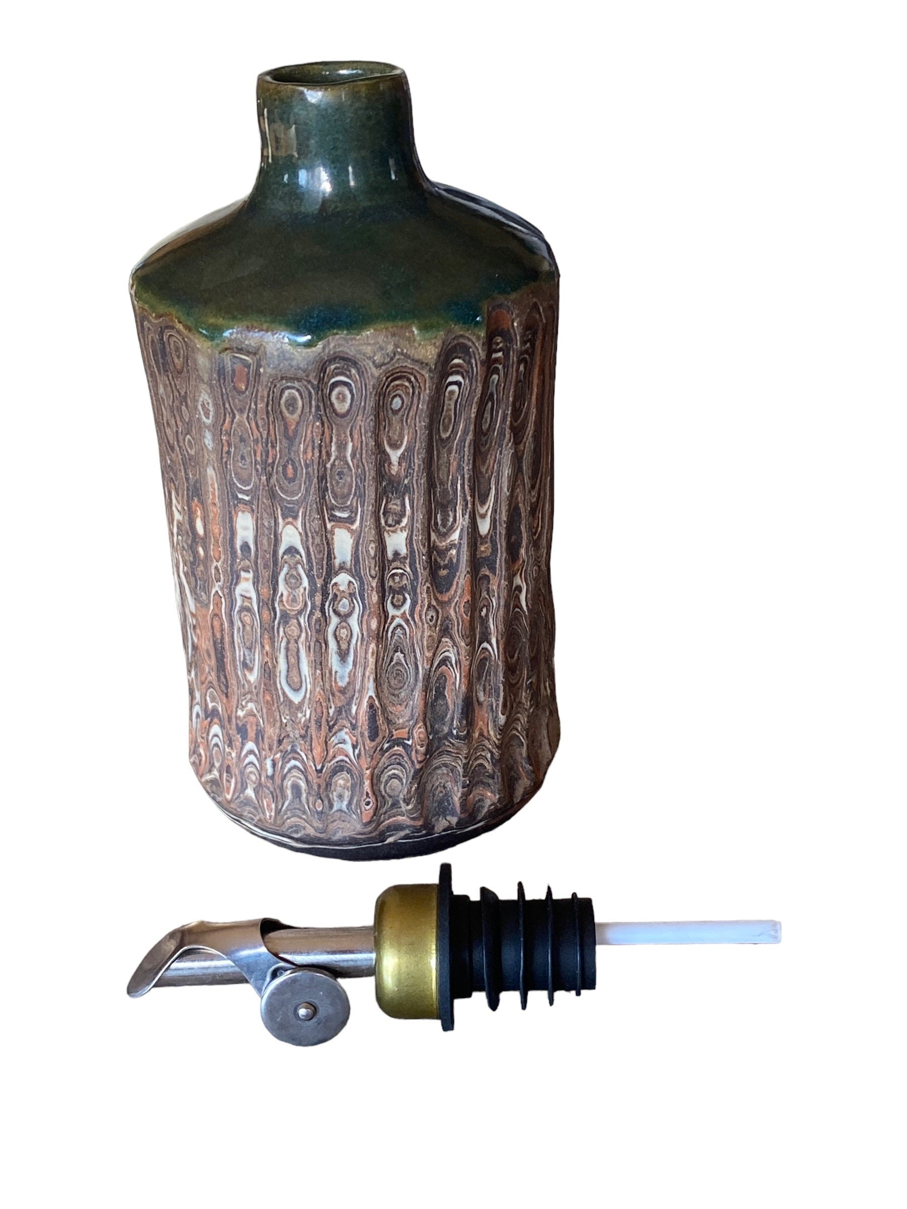 I created this oil bottle by hand on an electric pottery wheel from three colors of stoneware. At the leather hard stage, I fluted the bottle by carving into it. After a first firing, I applied a jade gloss glaze to the inside and top third of the bottle. I polished the exposed stoneware with diamond sand paper for a smooth finish.