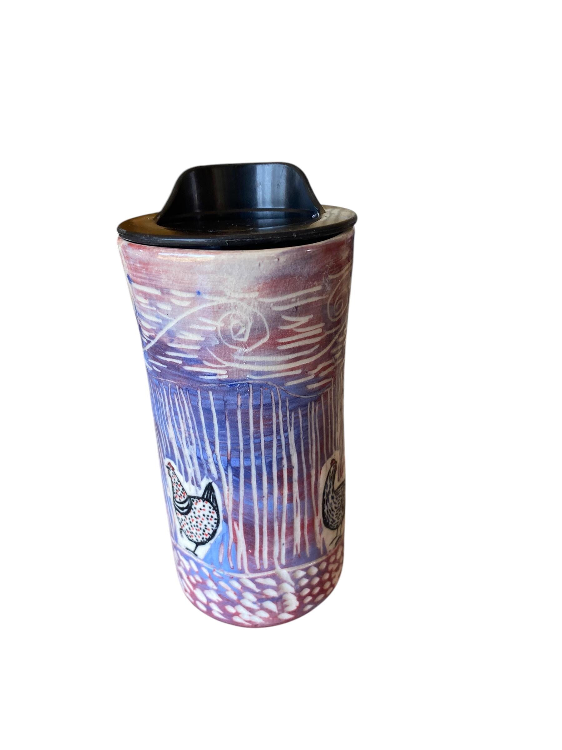 Artisan-Crafted Chicken Porcelain Travel Mug - 16oz Handmade Carved Pottery Commuter Cup