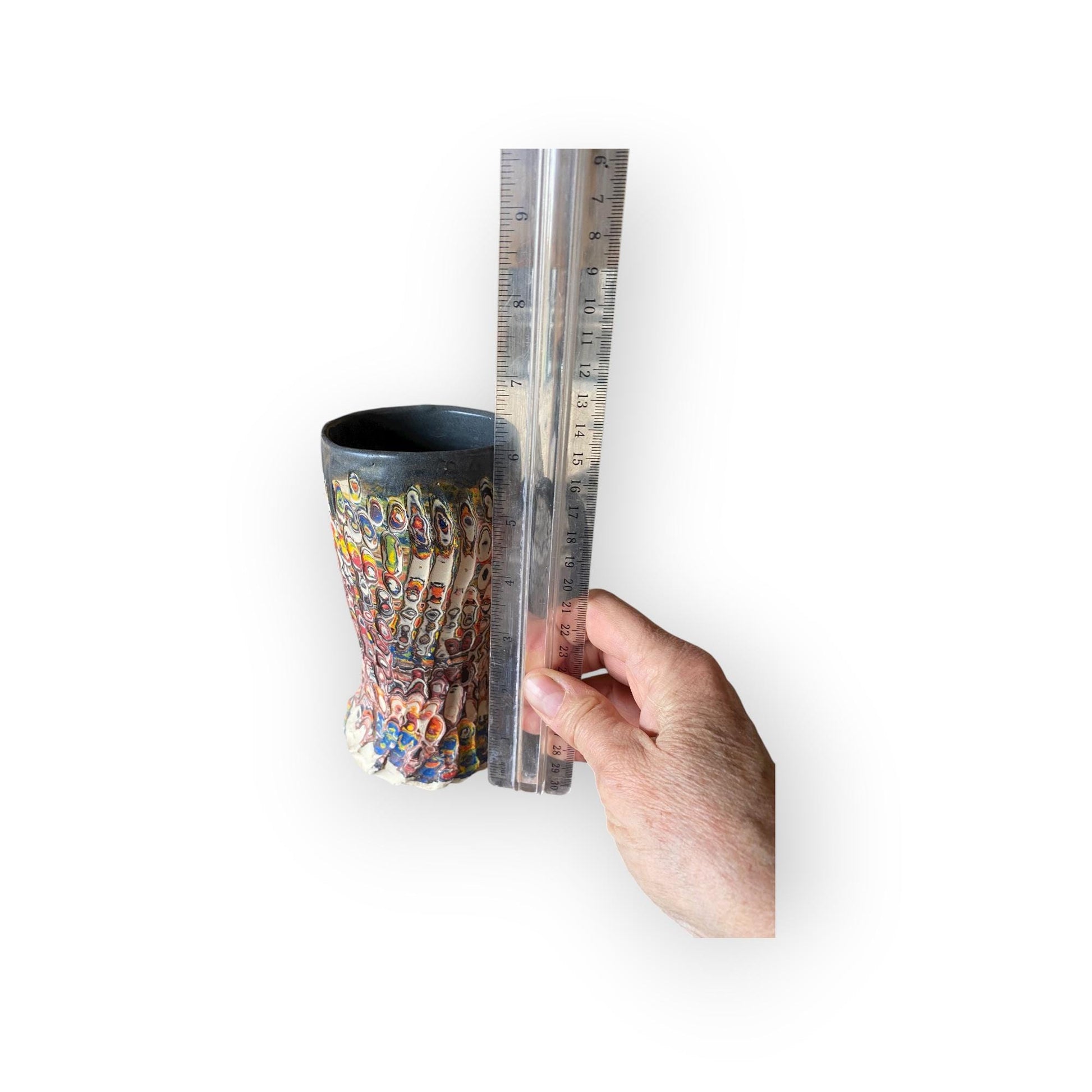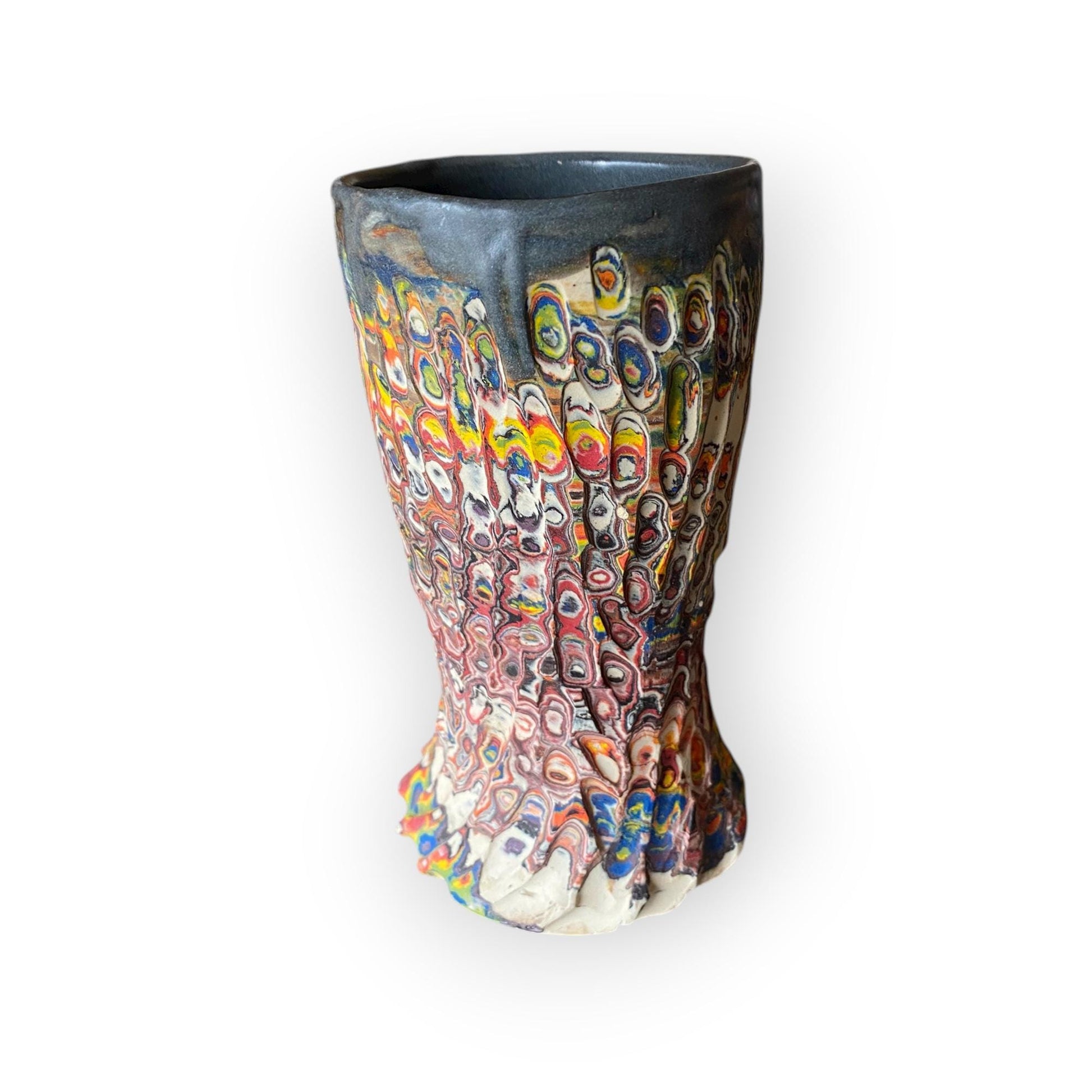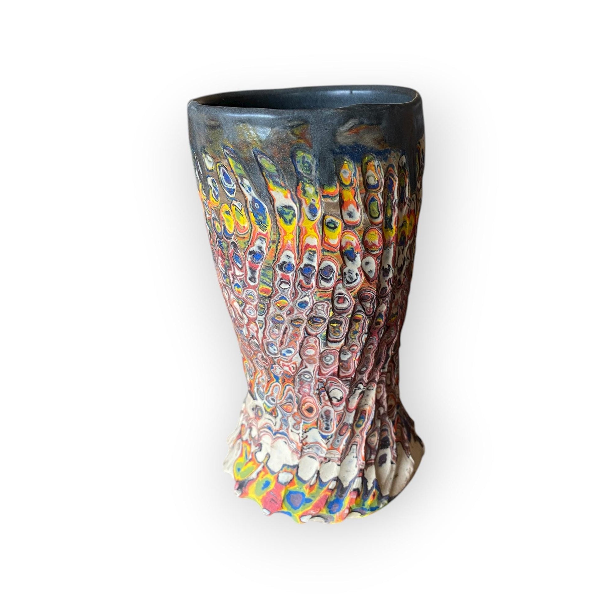 Enjoy your favorite coffee or tea in this handmade fluted porcelain mug, crafted with the Japanese Neriage technique. Layers of colored porcelain clay are wheel-thrown, carved, and sanded to reveal unique swirling patterns. The glazed interior and satin-smooth exterior highlight the clay's natural beauty. A stunning 16 oz artisan mug—perfect for ceramic art lovers, coffee enthusiasts, and collectors of Japanese-inspired pottery.