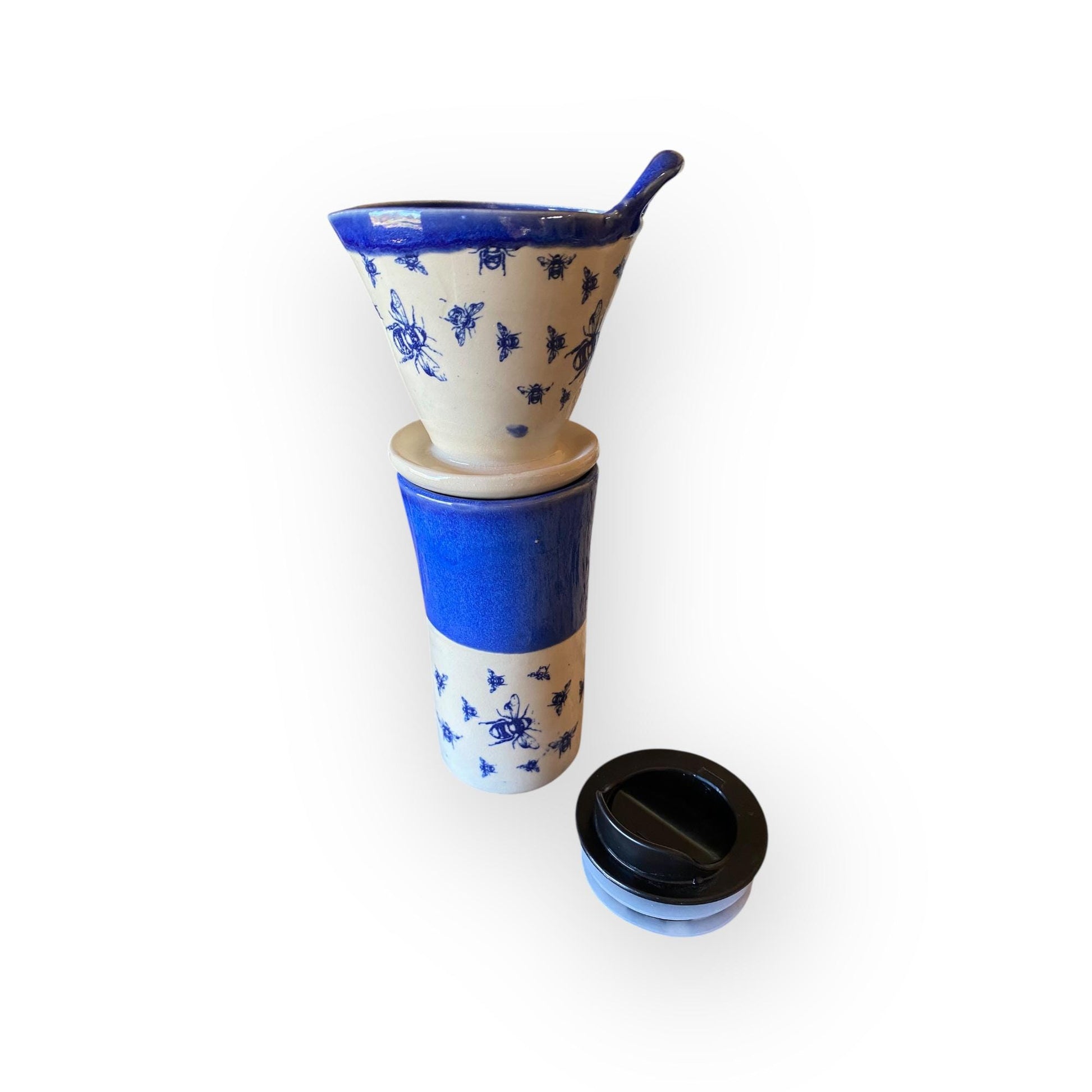Brew your coffee in style with this bee-themed pottery pour-over, handmade on an electric pottery wheel from durable porcelain clay. Finished with blue and clear glazes, each piece is unique. Designed to fit a standard #6 cone filter, this artisan pour-over coffee set is perfect for coffee lovers and handmade pottery enthusiasts. Makes a thoughtful gift for home baristas or anyone who enjoys a beautifully crafted morning ritual.