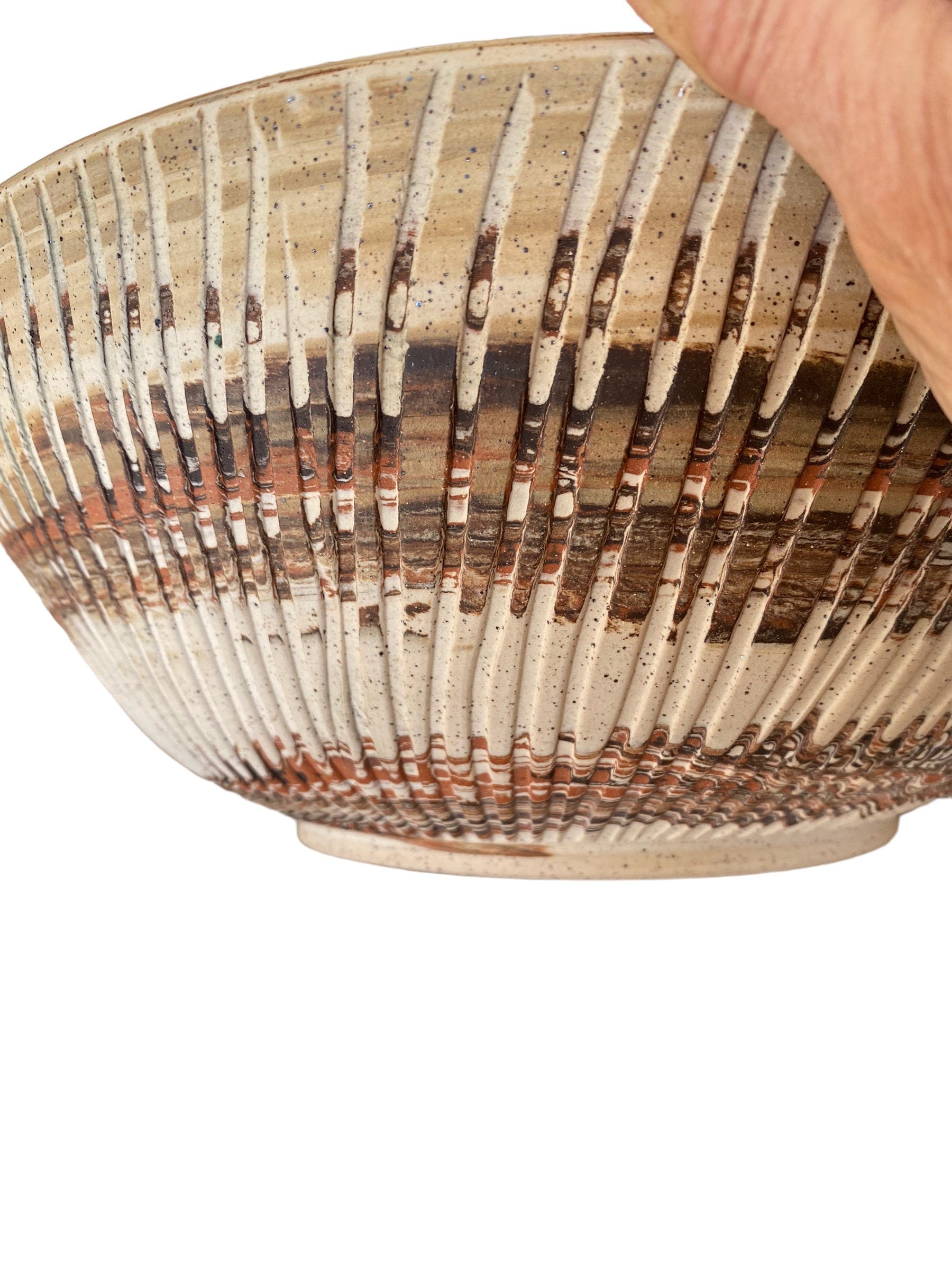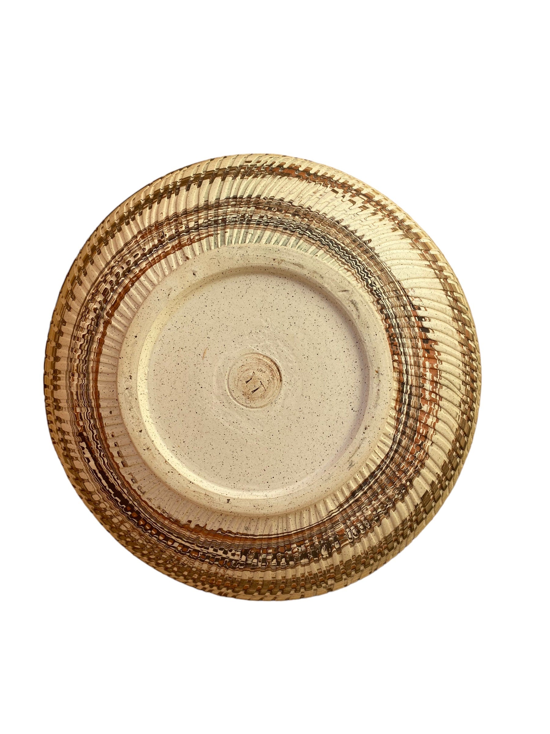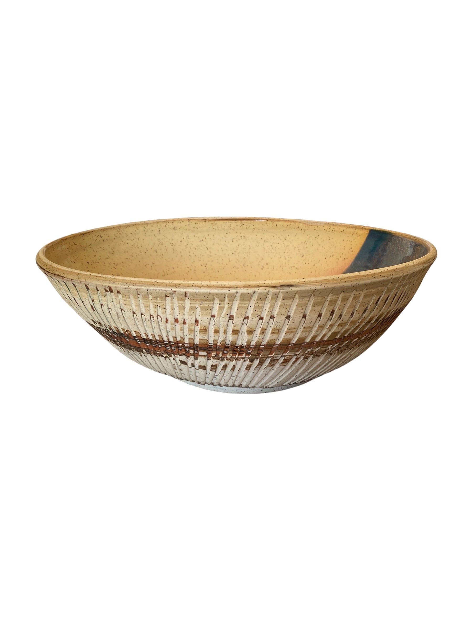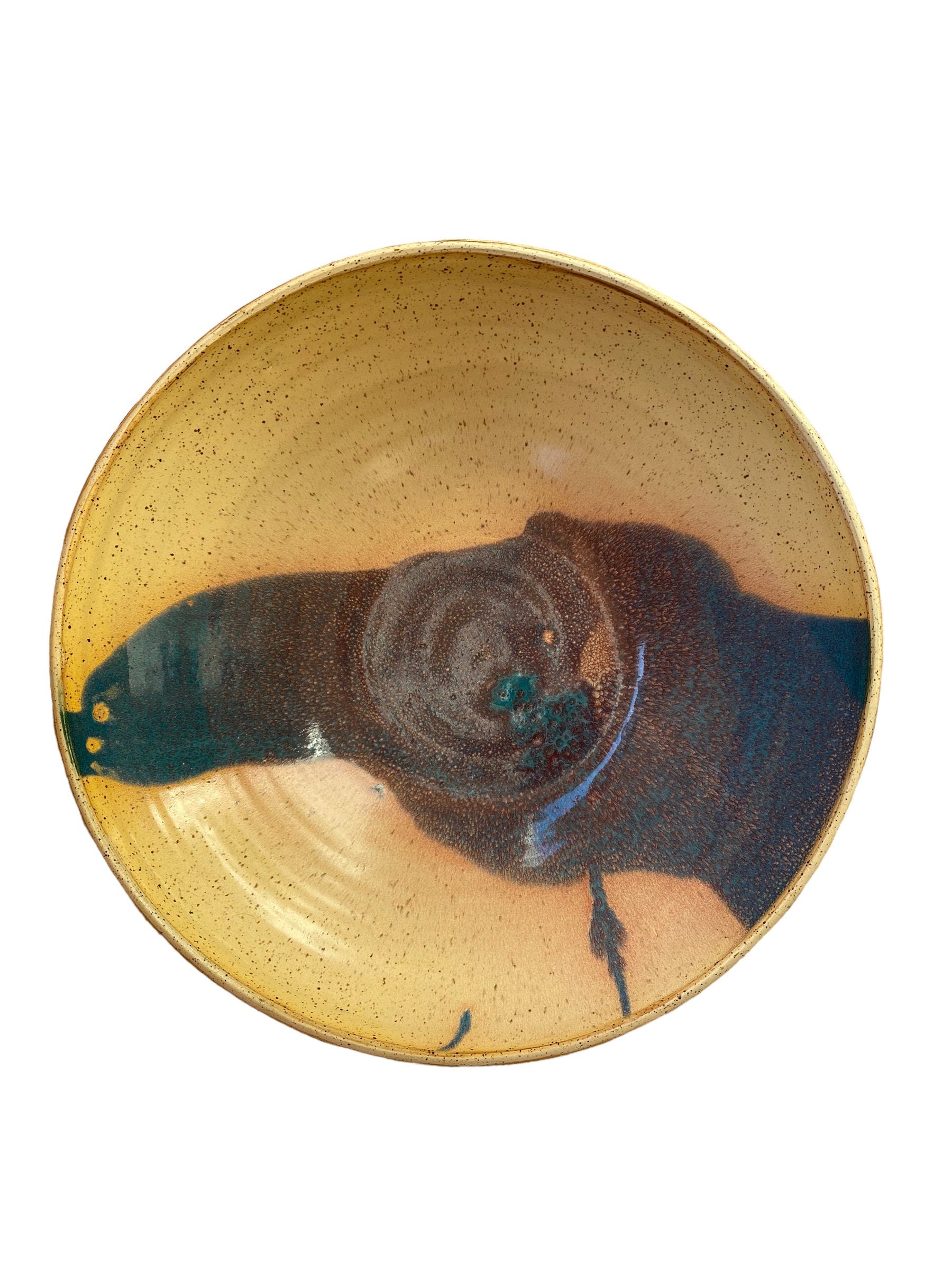 ake your family gatherings extra special with our Handmade Agateware Pottery Bowl, designed to be the centerpiece of your table. Crafted from three colors of stoneware clay and meticulously hand-carved, this bowl is not only functional but also a stunning piece of art. After the initial firing, it's adorned with a butter color and turquoise glaze, adding a touch of elegance to its unique design. For a flawless finish, the bowl is wet-sanded with diamond sandpaper, ensuring a smooth and tactile surface. Elevate your serving experience and add a touch of sophistication to your home with this exquisite handmade piece