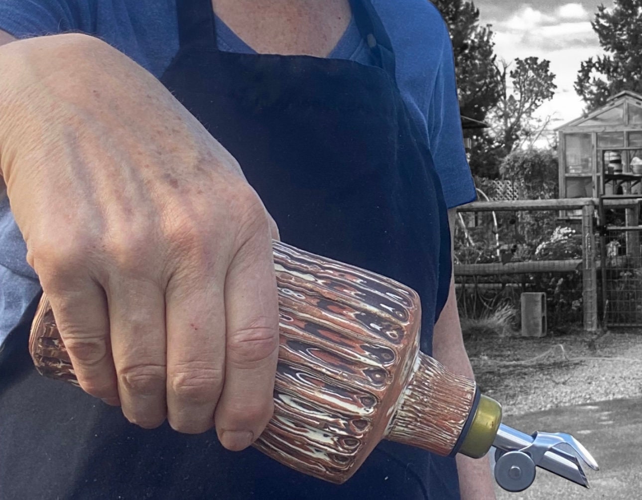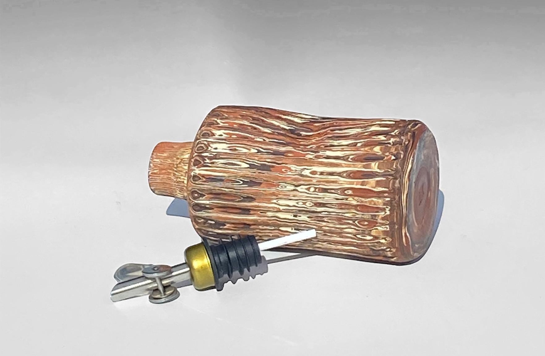 I made this bottle with the cook in mind. I created the bottle by throwing layered colored clays together. When it was fairly wet, I carved through the layers to expose the design below. I then used my hand to make a handle hold by pressing in the wet clay. After firing a green glaze was applied to the interior to make it food safe. After the glaze firing, I sanded the exterior with diamond sand paper. This makes the exteriors extremely touchable.