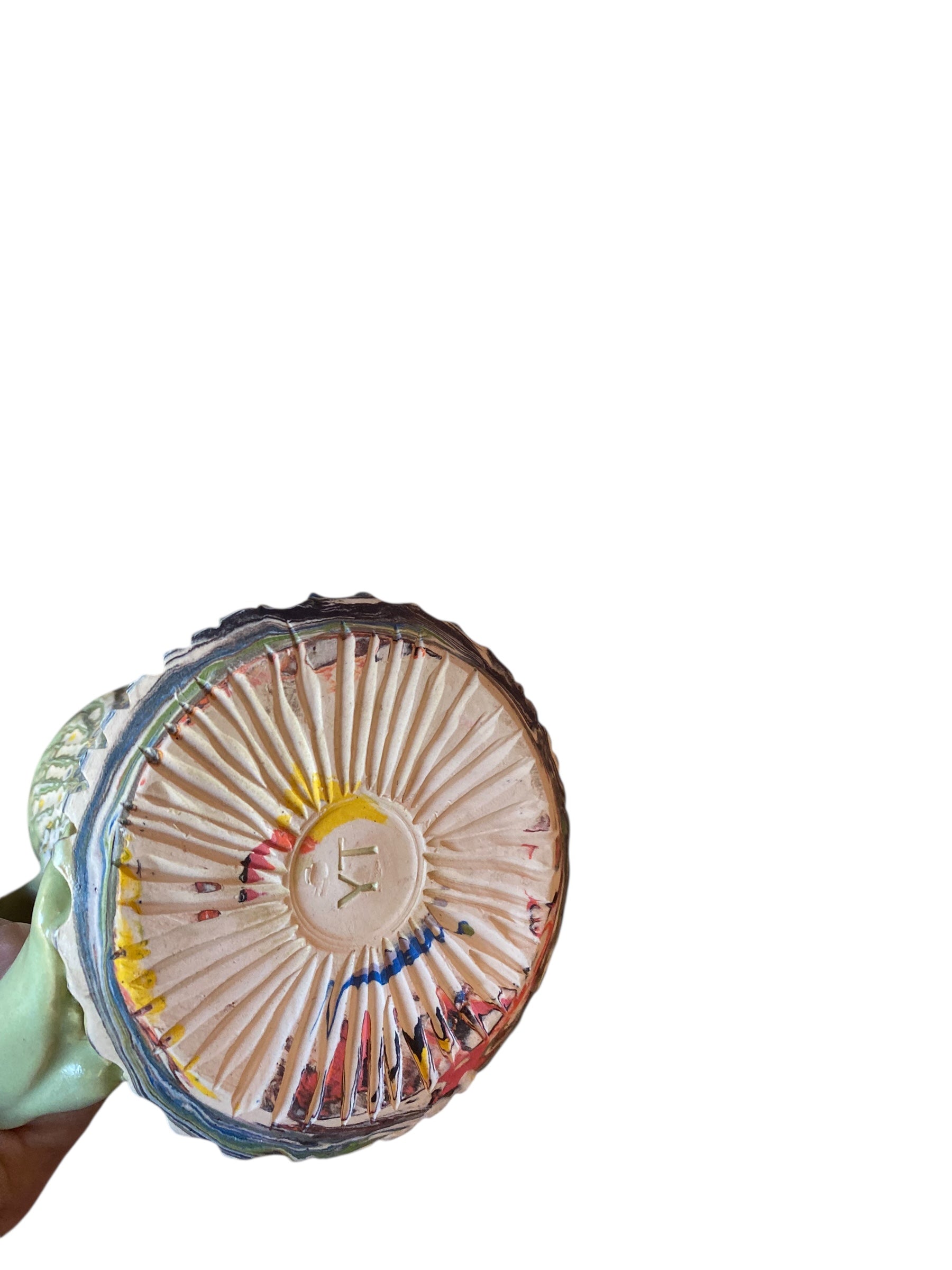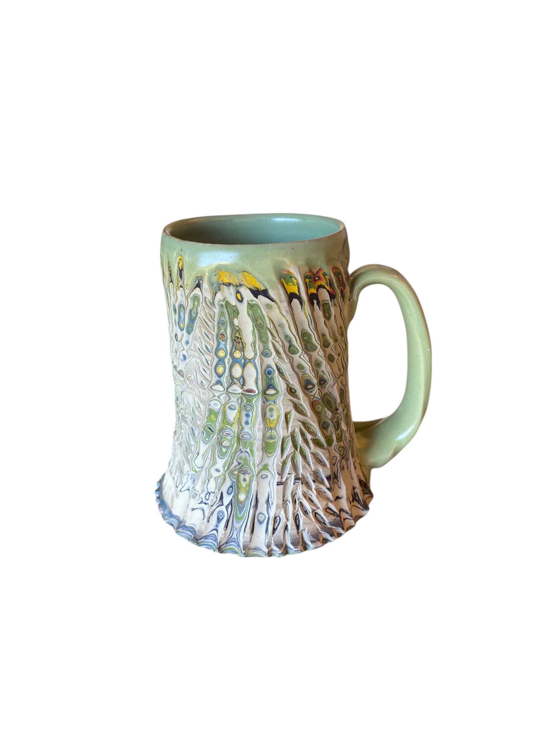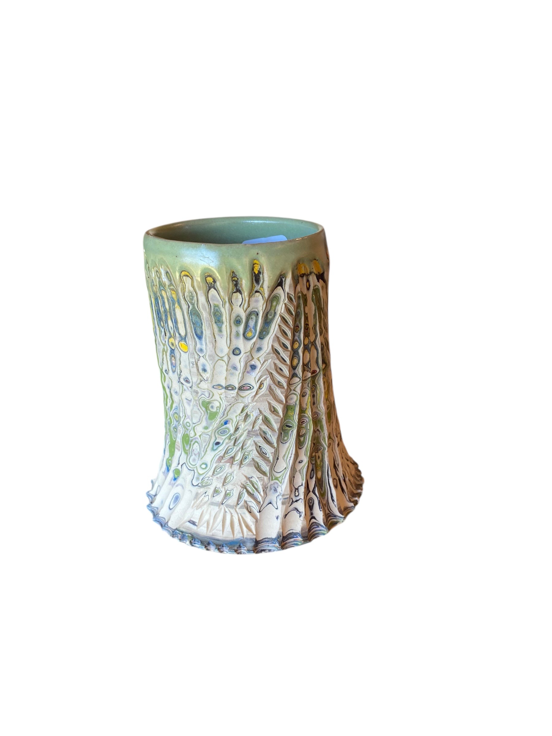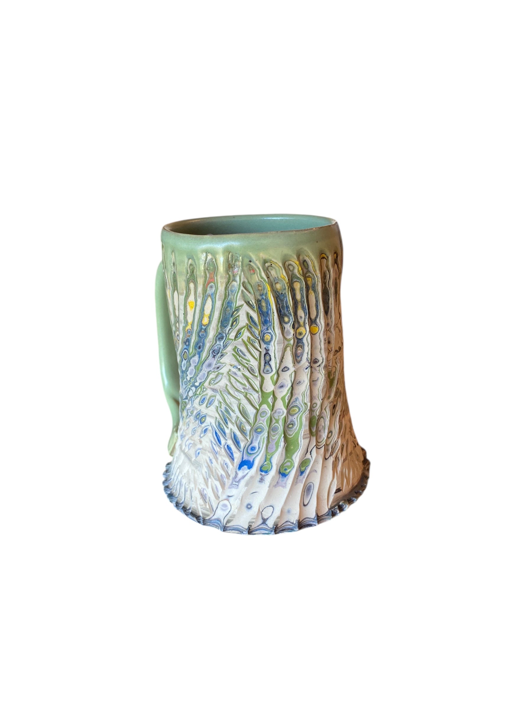 Experience the artistry of handcrafted ceramics with this Fluted Porcelain Mug, meticulously made using the traditional Japanese Neriage technique. Layers of colored clays are laminated and thrown on a pottery wheel, creating swirling patterns that are completely unique to each piece. Every mug is hand-carved against the grain to reveal intricate, organic designs, offering a stunning glimpse into the layered clays beneath.