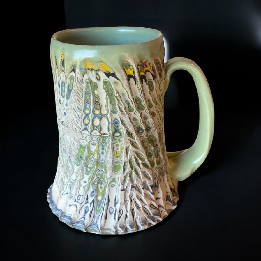 Fluted Porcelain Mug – Swirled Colored Clays with Japanese Neriage, Hand-Carved, Satin-Smooth Unglazed Pottery