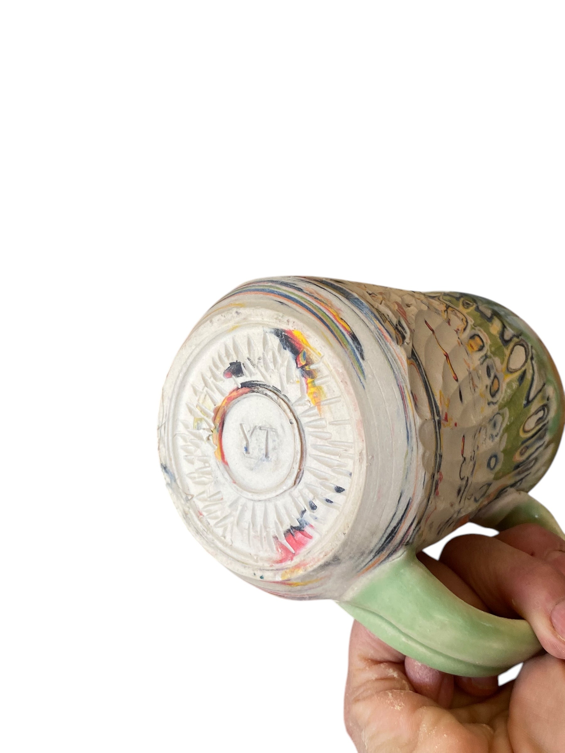 Experience the artistry of handcrafted ceramics with this Fluted Porcelain Mug, meticulously made using the traditional Japanese Neriage technique. Layers of colored clays are laminated and thrown on a pottery wheel, creating swirling patterns that are completely unique to each piece. Every mug is hand-carved against the grain to reveal intricate, organic designs, offering a stunning glimpse into the layered clays beneath.