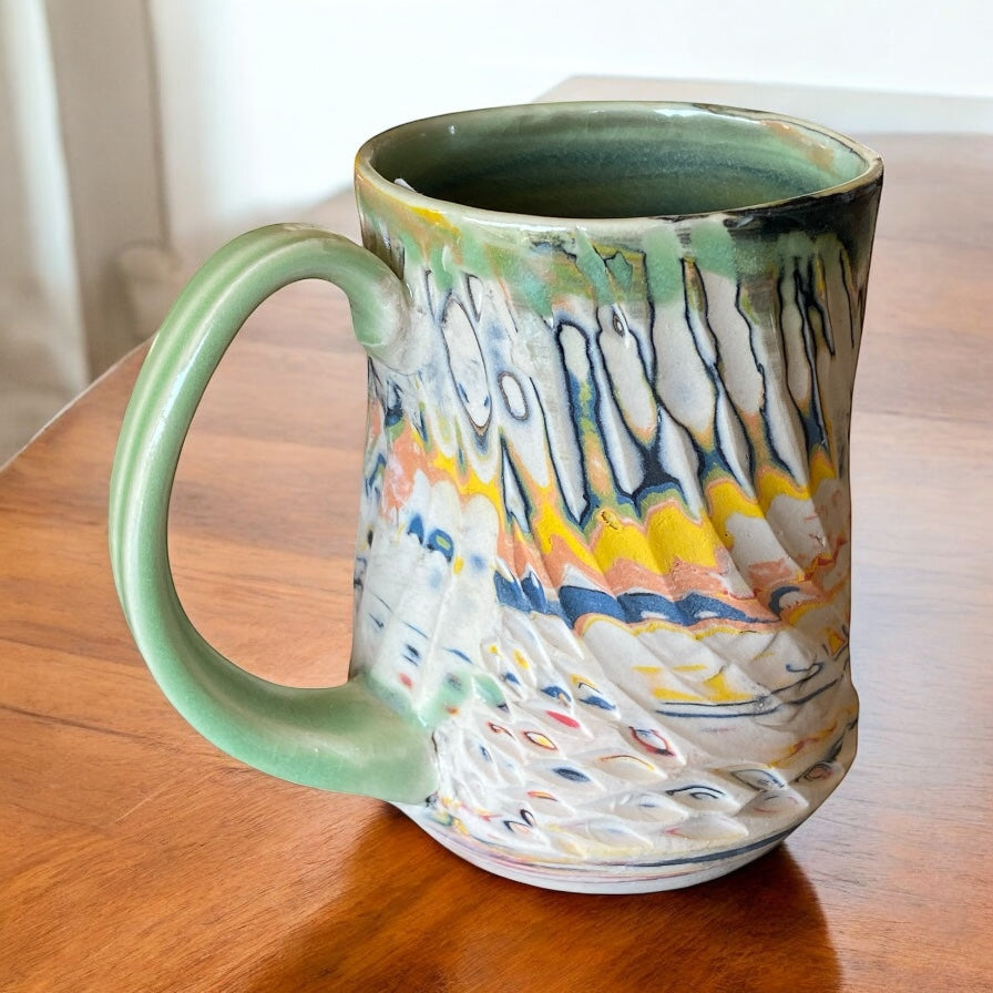 Fluted Porcelain Mug – Swirled Colored Clays with Japanese Neriage, Hand-Carved, Satin-Smooth Unglazed Pottery