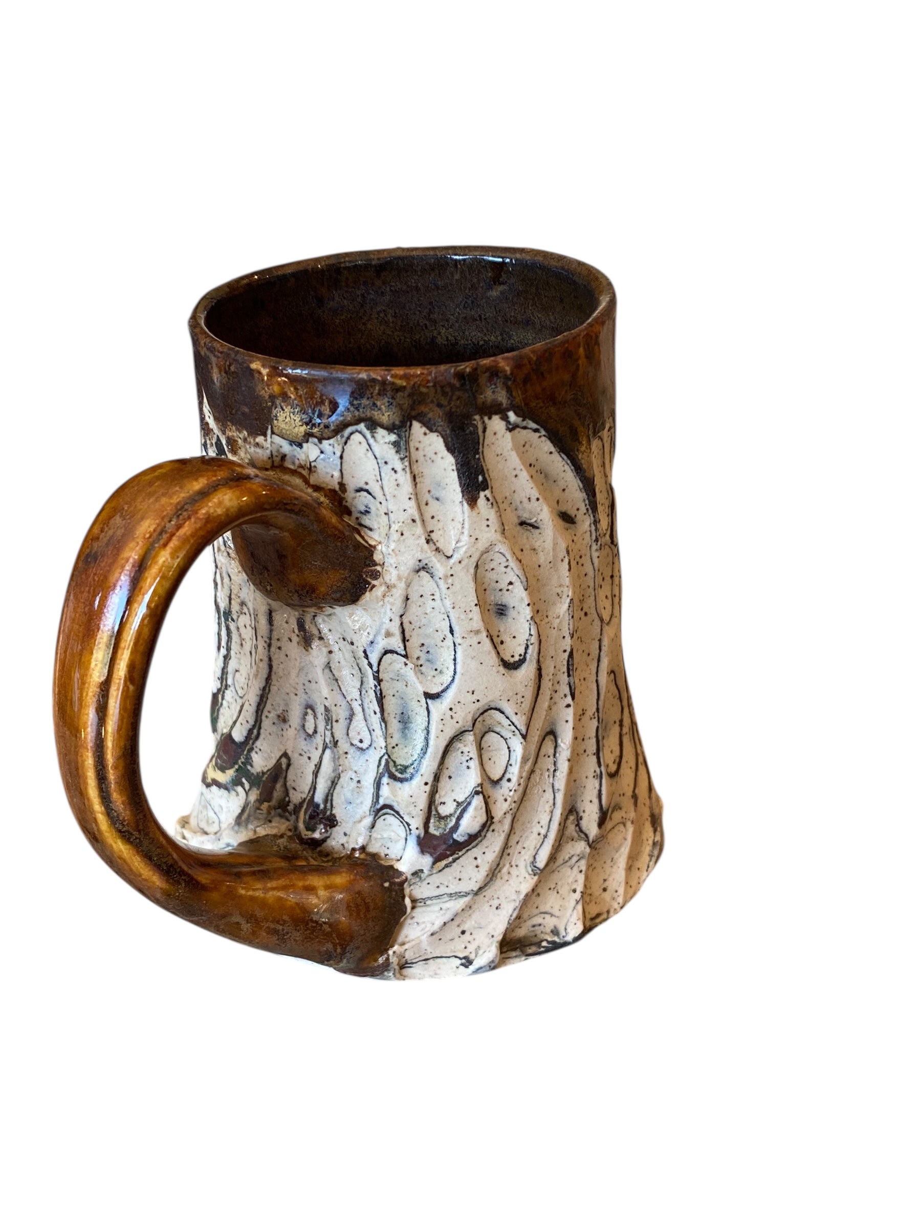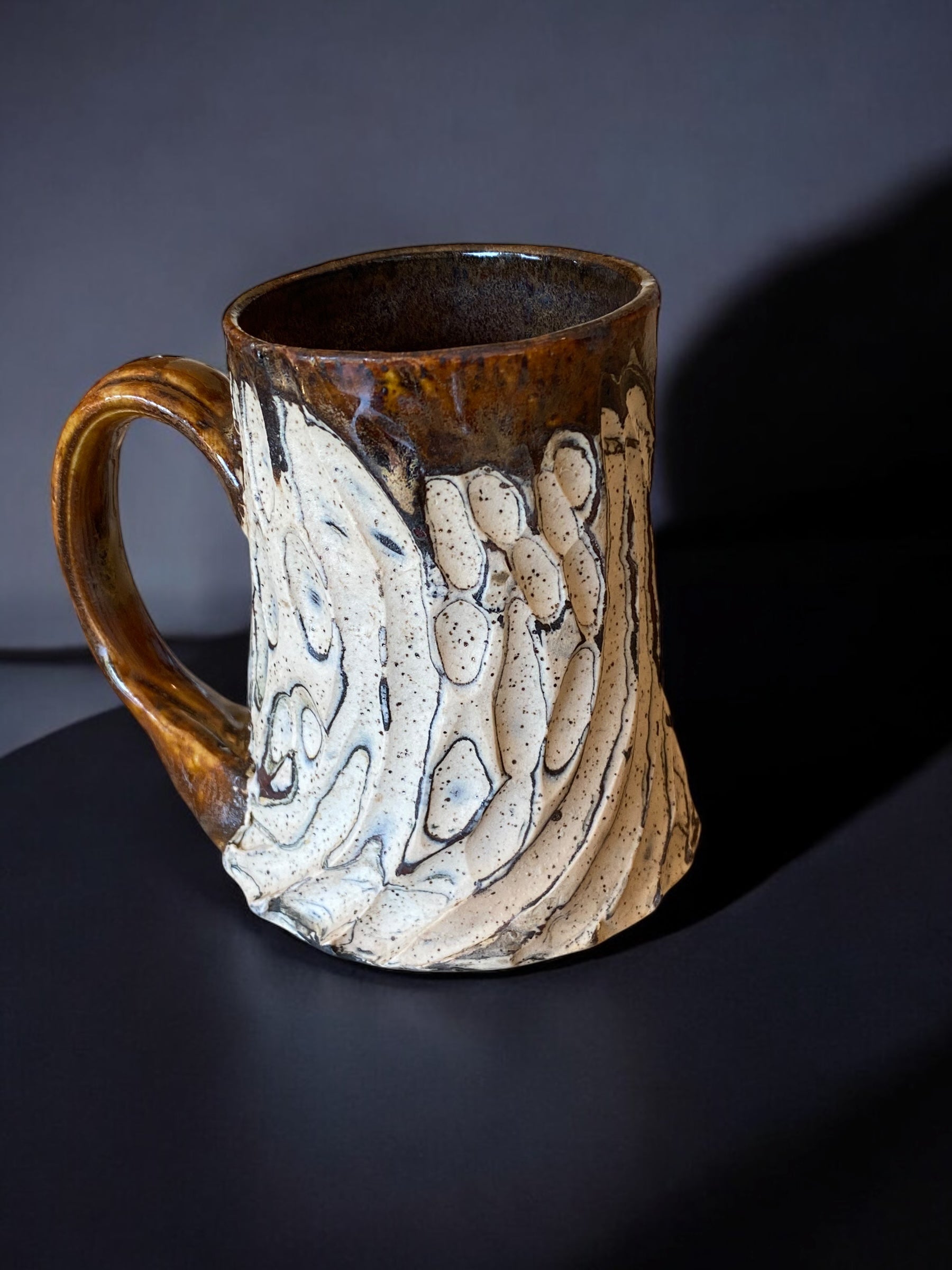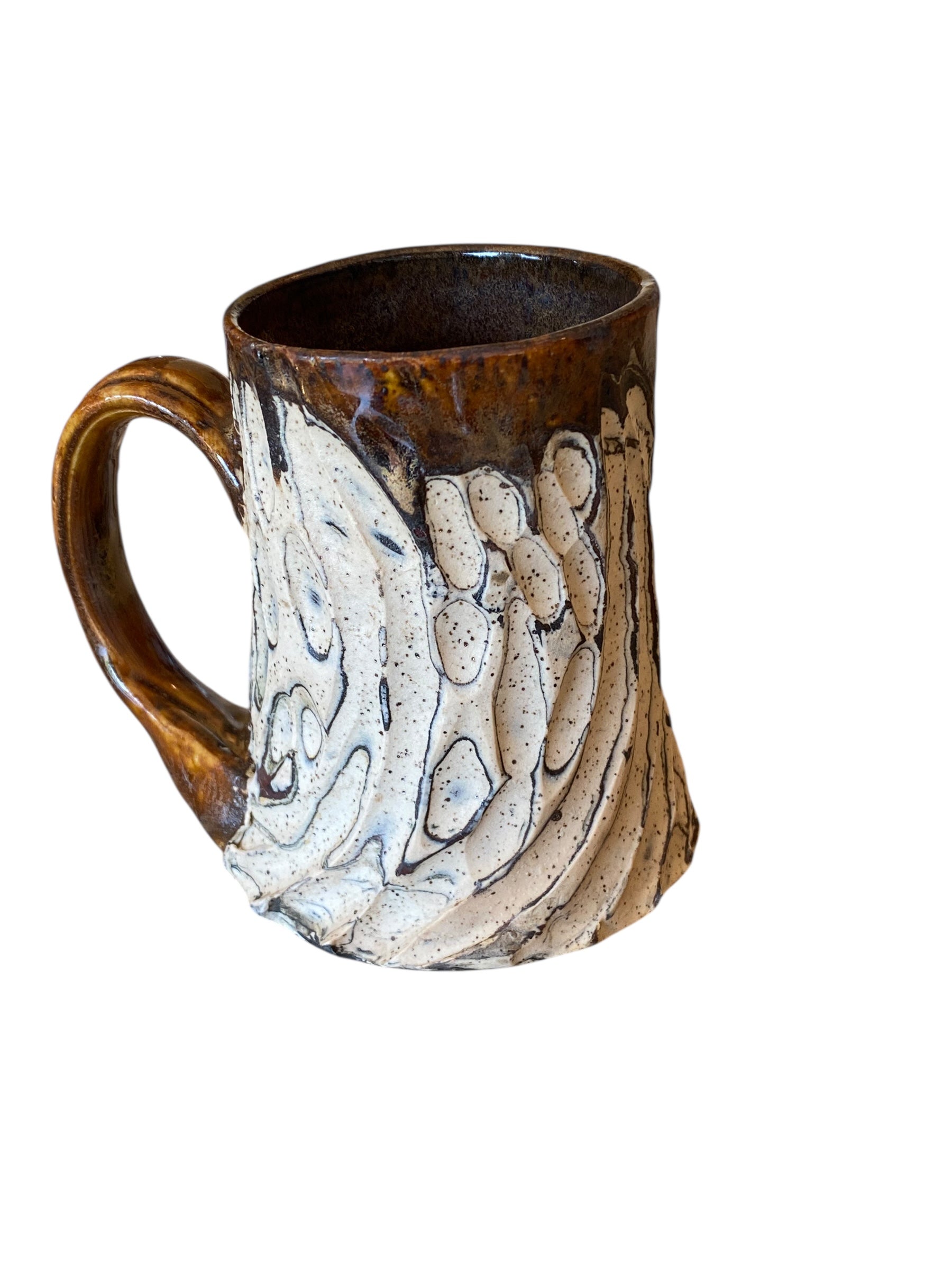 Experience the artistry of handcrafted ceramics with this Fluted Porcelain Mug, meticulously made using the traditional Japanese Neriage technique. Layers of colored clays are laminated and thrown on a pottery wheel, creating swirling patterns that are completely unique to each piece. Every mug is hand-carved against the grain to reveal intricate, organic designs, offering a stunning glimpse into the layered clays beneath.