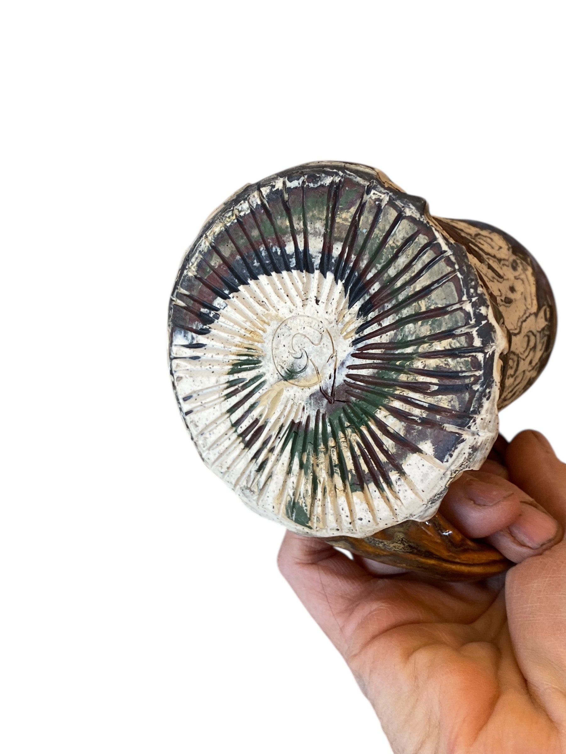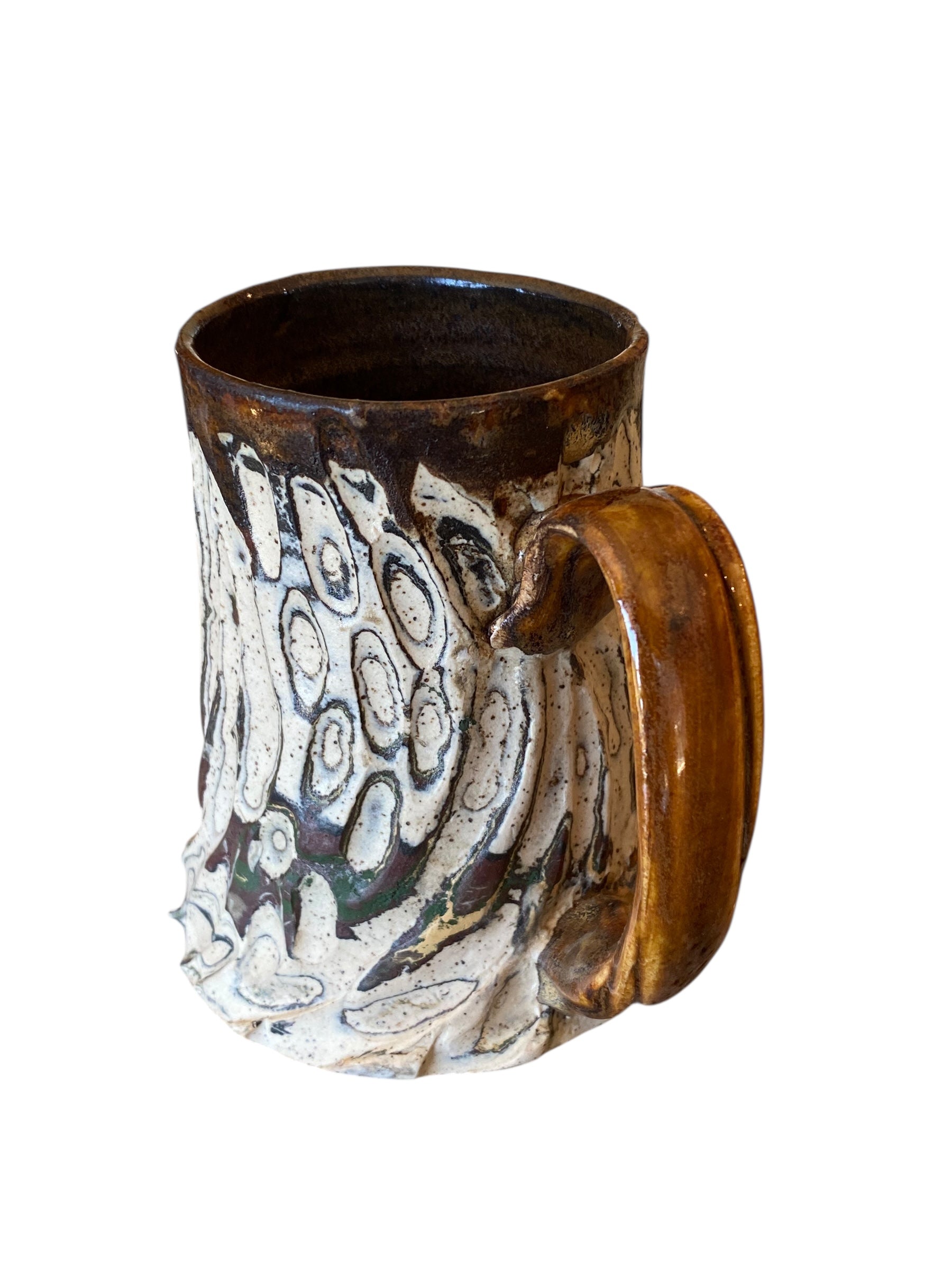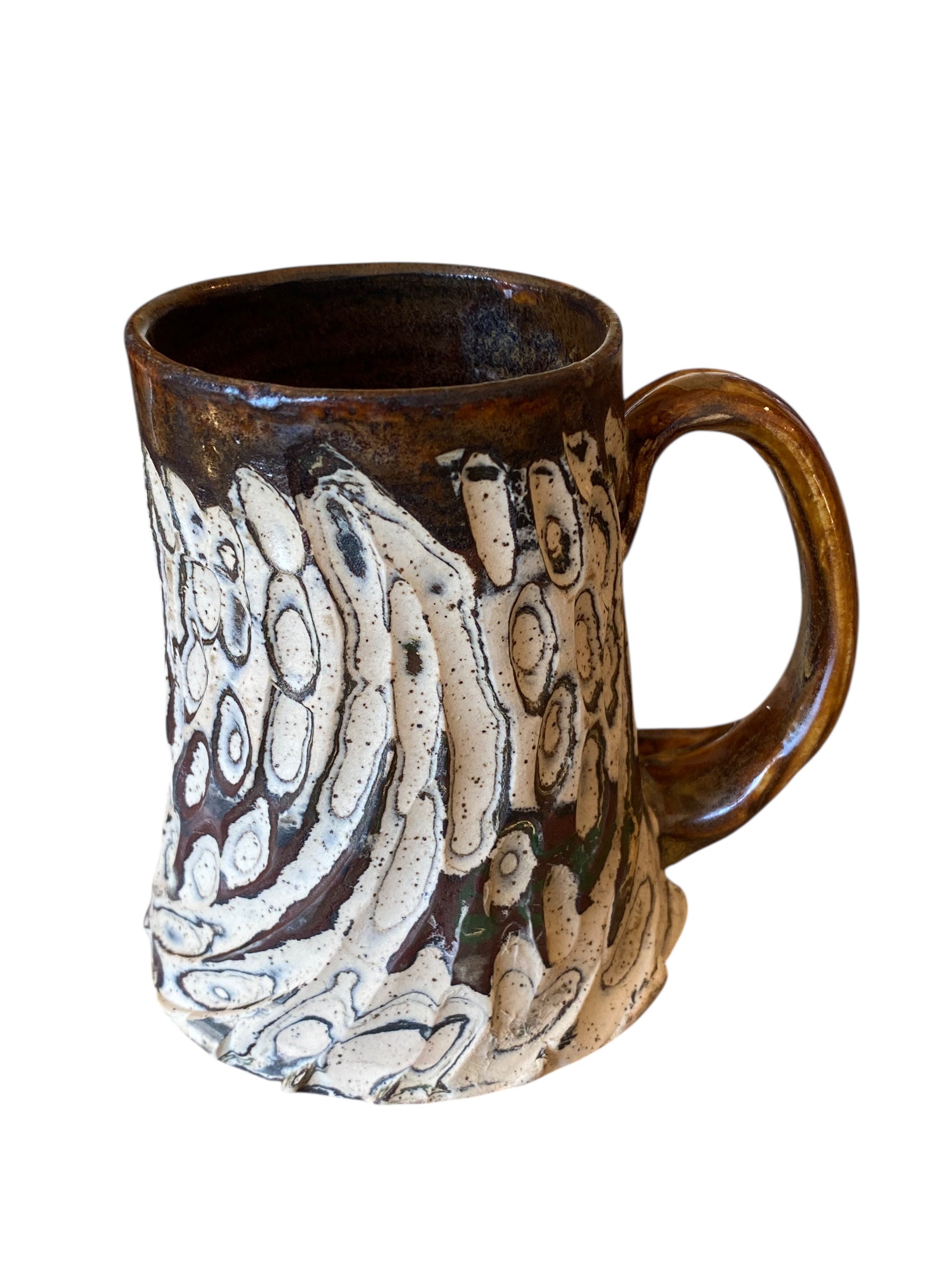 Experience the artistry of handcrafted ceramics with this Fluted Porcelain Mug, meticulously made using the traditional Japanese Neriage technique. Layers of colored clays are laminated and thrown on a pottery wheel, creating swirling patterns that are completely unique to each piece. Every mug is hand-carved against the grain to reveal intricate, organic designs, offering a stunning glimpse into the layered clays beneath.