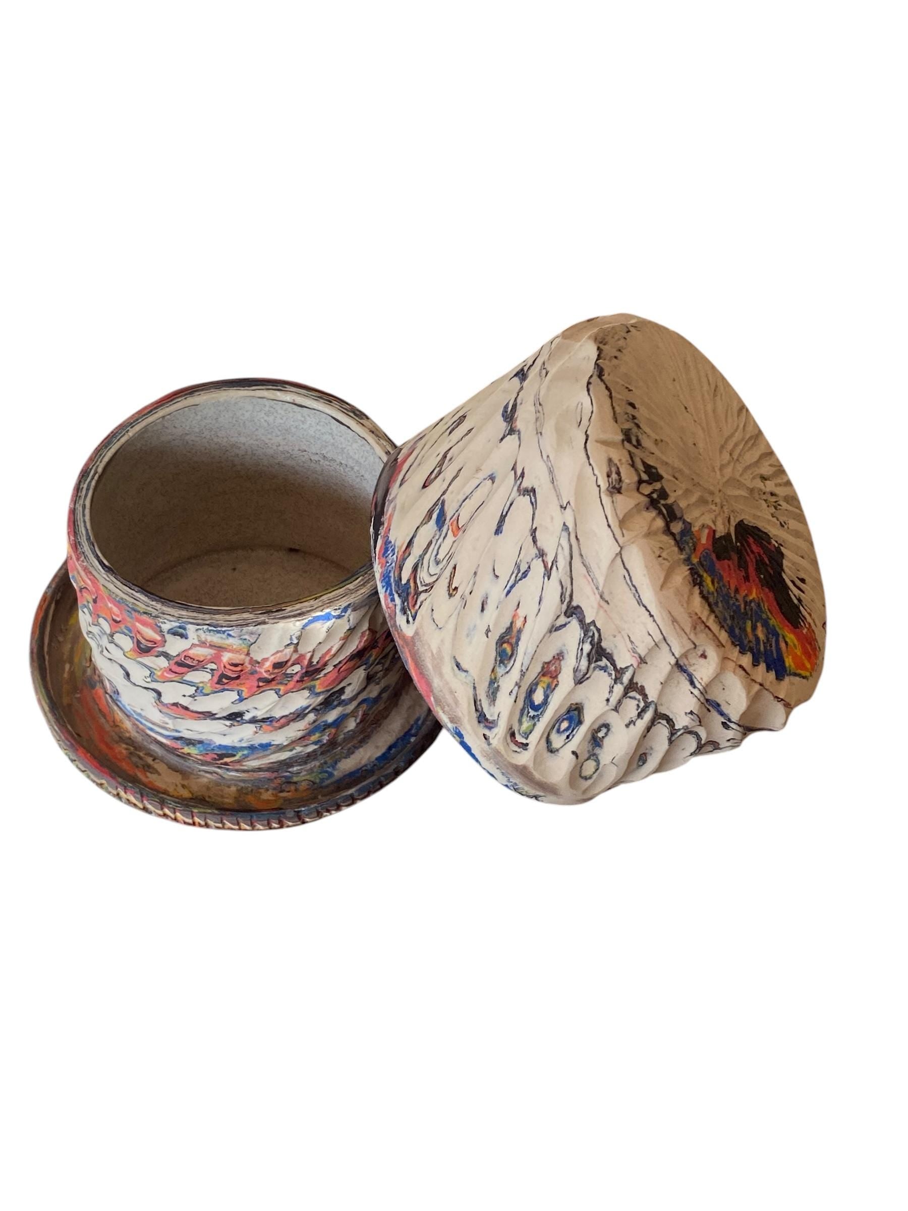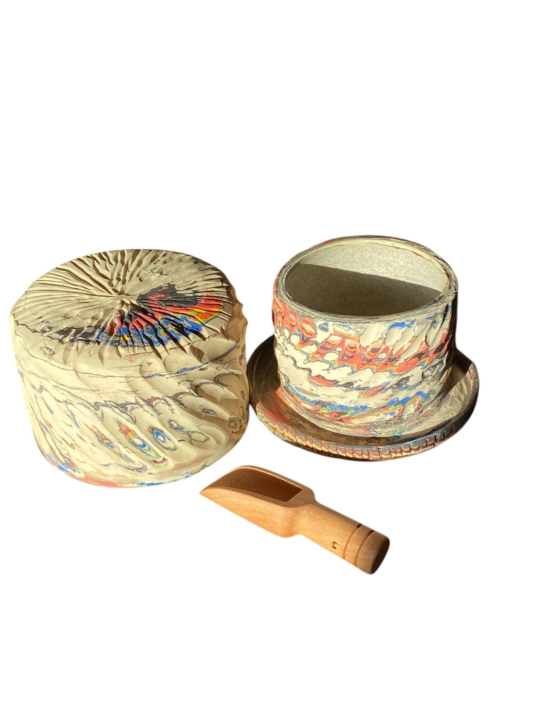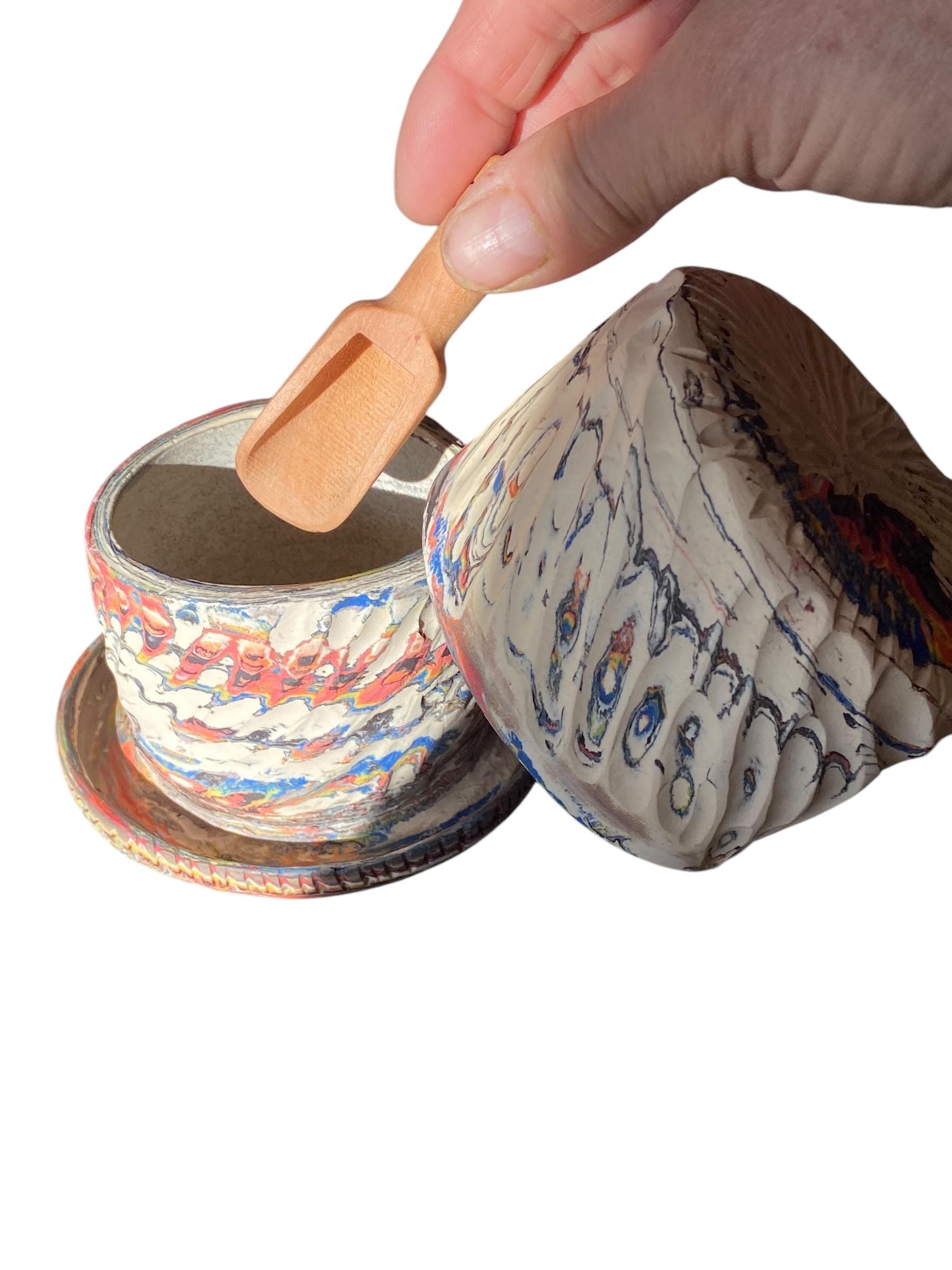 Experience the artistry of handcrafted ceramics with this Fluted Porcelain Salt Jar, meticulously made using the traditional Japanese Neriage technique. Layers of colored clays are laminated and thrown on a pottery wheel, creating swirling patterns unique to each piece. Every mug is hand-carved against the grain to reveal intricate, organic designs, offering a stunning glimpse into the layered clays beneath.