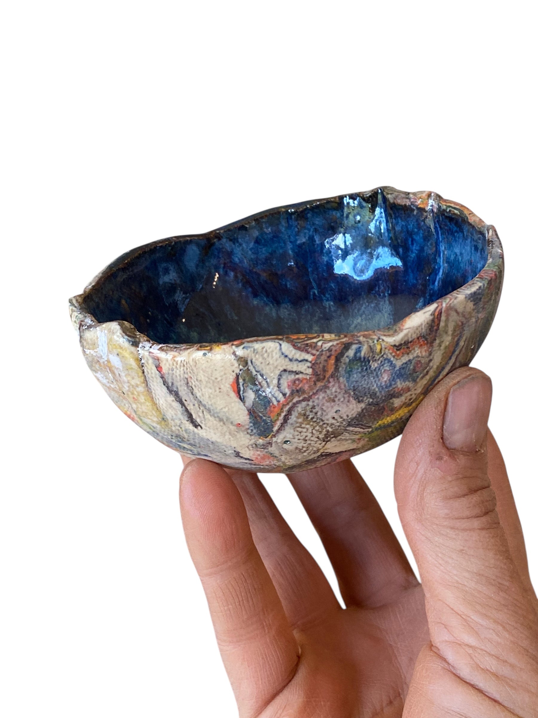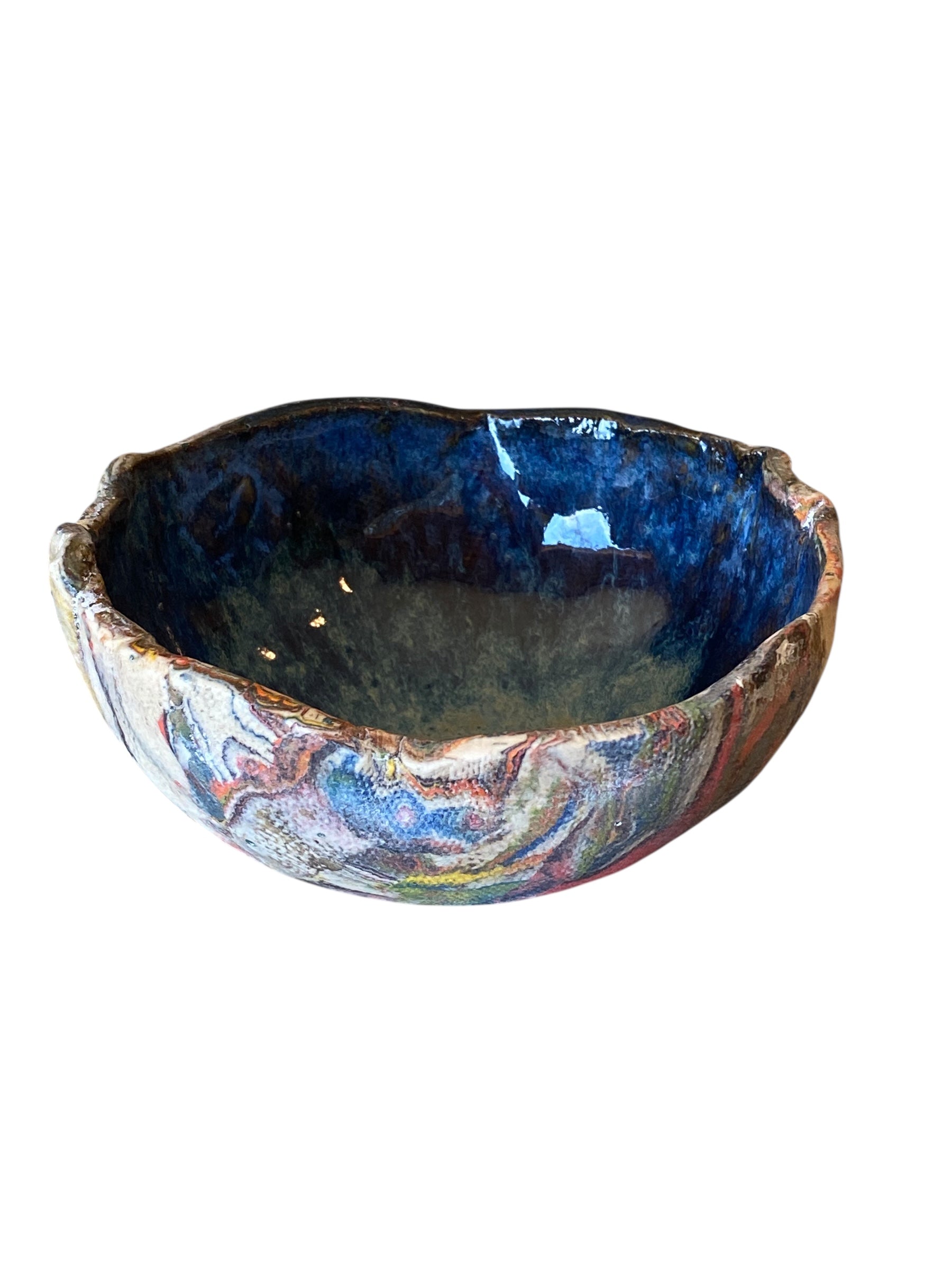 Handbuilt Neriage Porcelain Prep Bowl – Multicolored Marbled Clay with Blue Glazed Interior