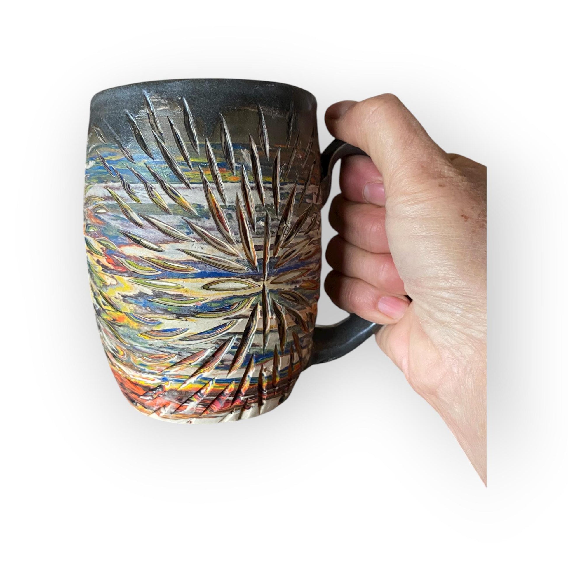 Enjoy your favorite coffee, tea, or hot chocolate in this handmade agateware mug, wheel-thrown from layered stoneware clay in shades of turquoise, blue, and white. Each 17-oz ceramic mug is individually crafted and carved by hand to reveal mesmerizing natural patterns that showcase the beauty of the clay. With its smooth finish, comfortable handle, and unique marbled design, this artisan pottery mug adds a touch of functional art to your daily coffee routine. A thoughtful gift for coffee lovers, tea drinkers, and ceramic enthusiasts alike.