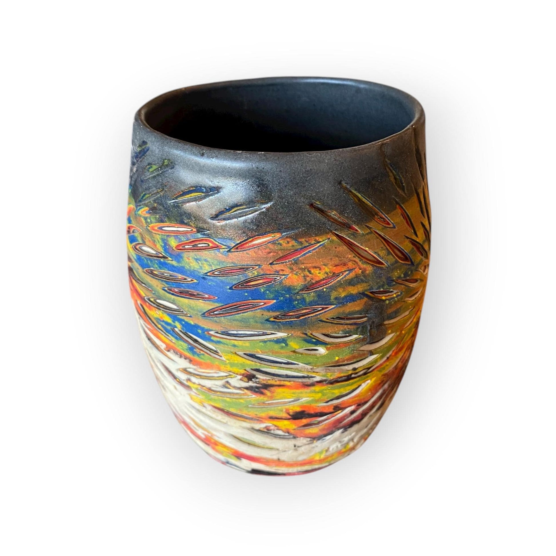 Enjoy your favorite coffee, tea, or hot chocolate in this handmade agateware mug, wheel-thrown from layered stoneware clay in shades of turquoise, blue, and white. Each 17-oz ceramic mug is individually crafted and carved by hand to reveal mesmerizing natural patterns that showcase the beauty of the clay. With its smooth finish, comfortable handle, and unique marbled design, this artisan pottery mug adds a touch of functional art to your daily coffee routine. A thoughtful gift for coffee lovers, tea drinkers, and ceramic enthusiasts alike.