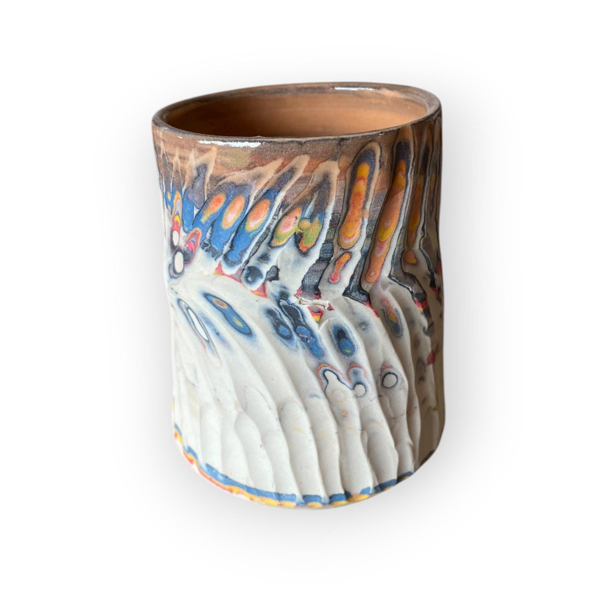 Handcrafted Agateware Stoneware Travel Mug: Fluted Pottery Coffee Cup with Peach Accents (C-29)