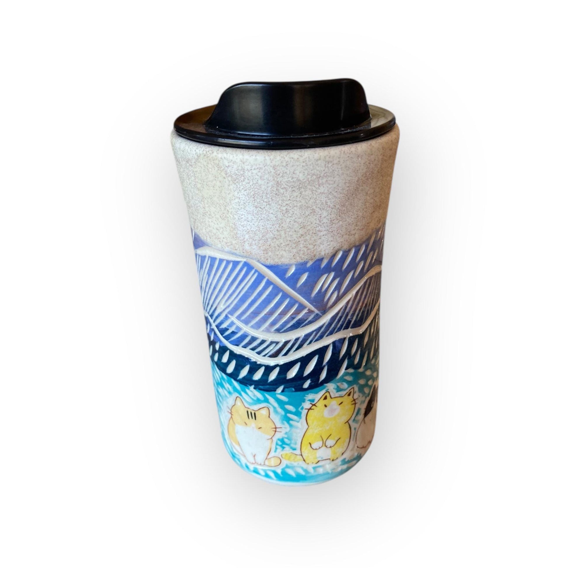 Handcrafted Cat Travel Mug – 16 oz Porcelain Sgraffito Stoneware Coffee Cup | Carved Ceramic Mug for Commuters & Cat Lovers