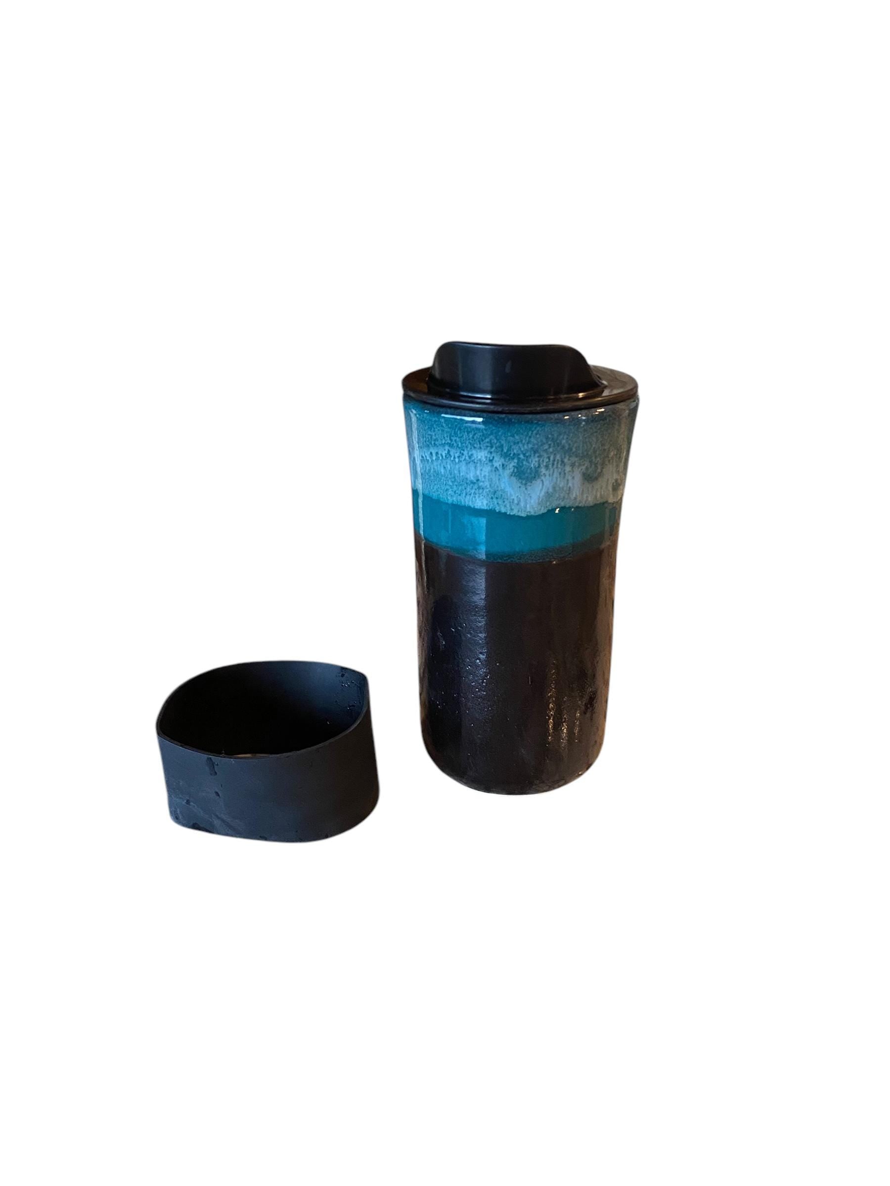 Enjoy your favorite drinks on the go with this 16-ounce handmade porcelain travel mug, finished in a striking turquoise and black glaze. Each mug is wheel-thrown from durable porcelain clay, making it both functional and beautiful—perfect for coffee or tea lovers.