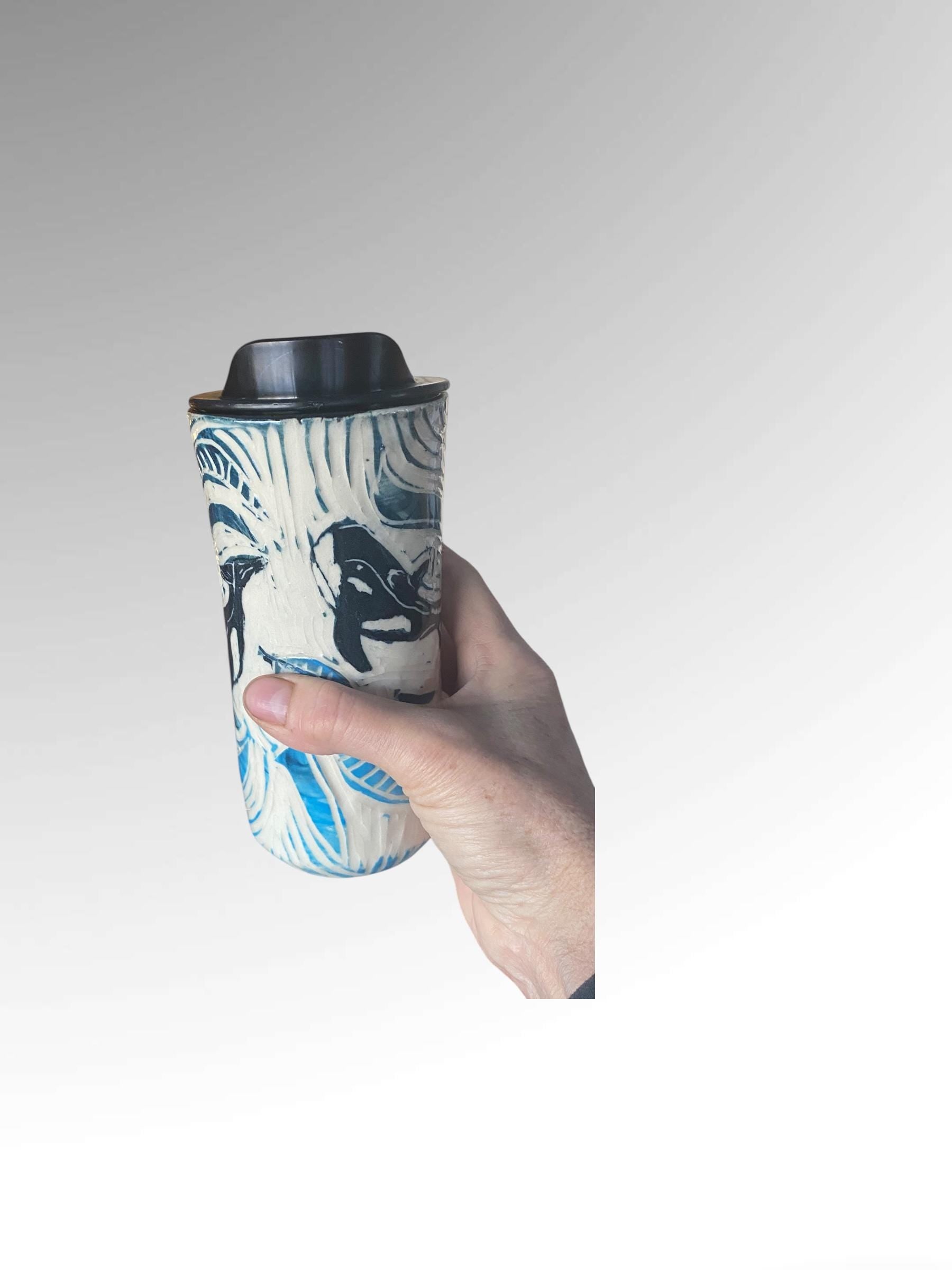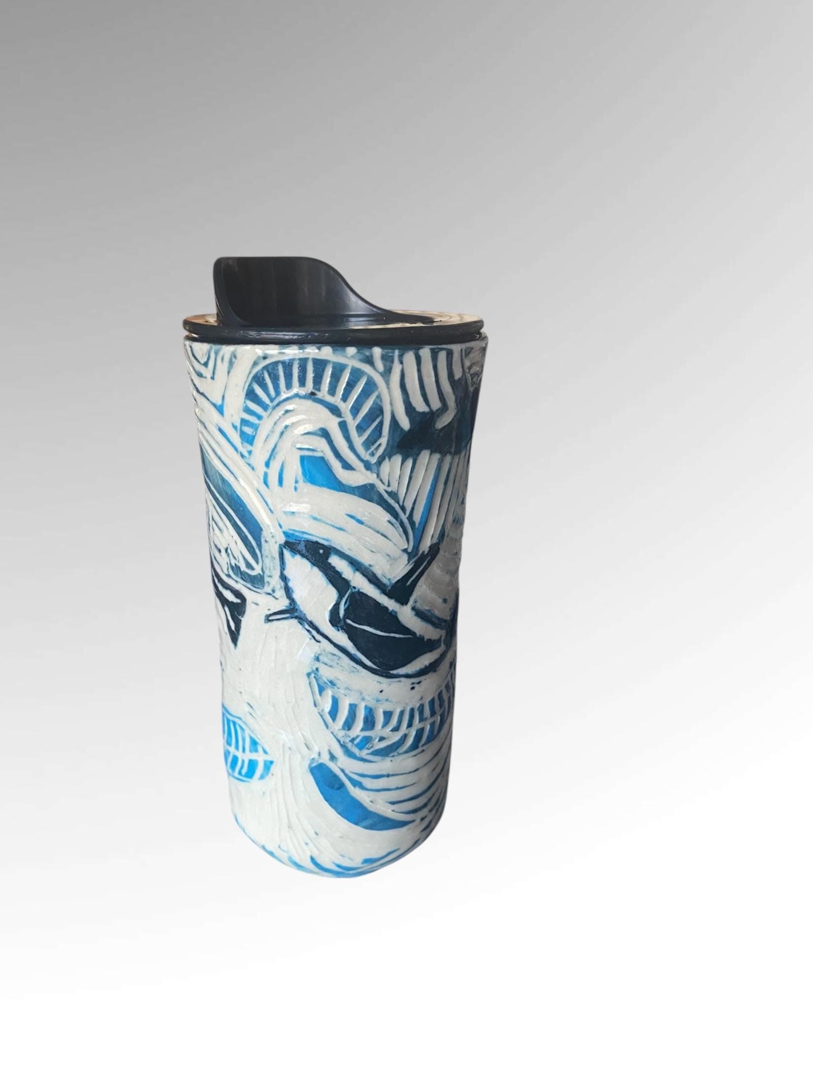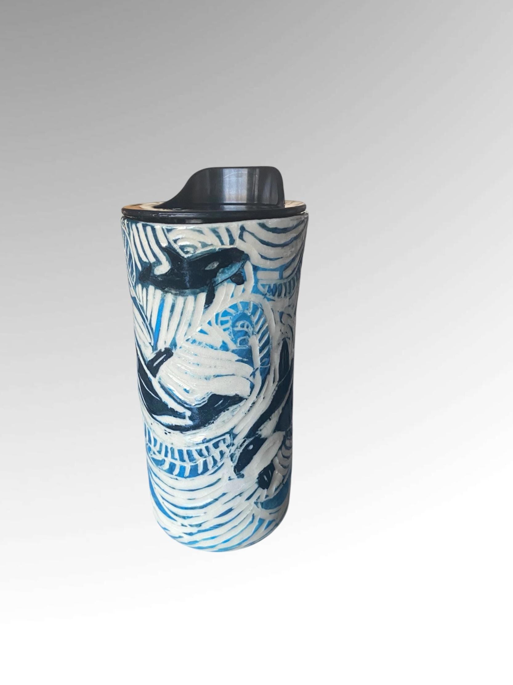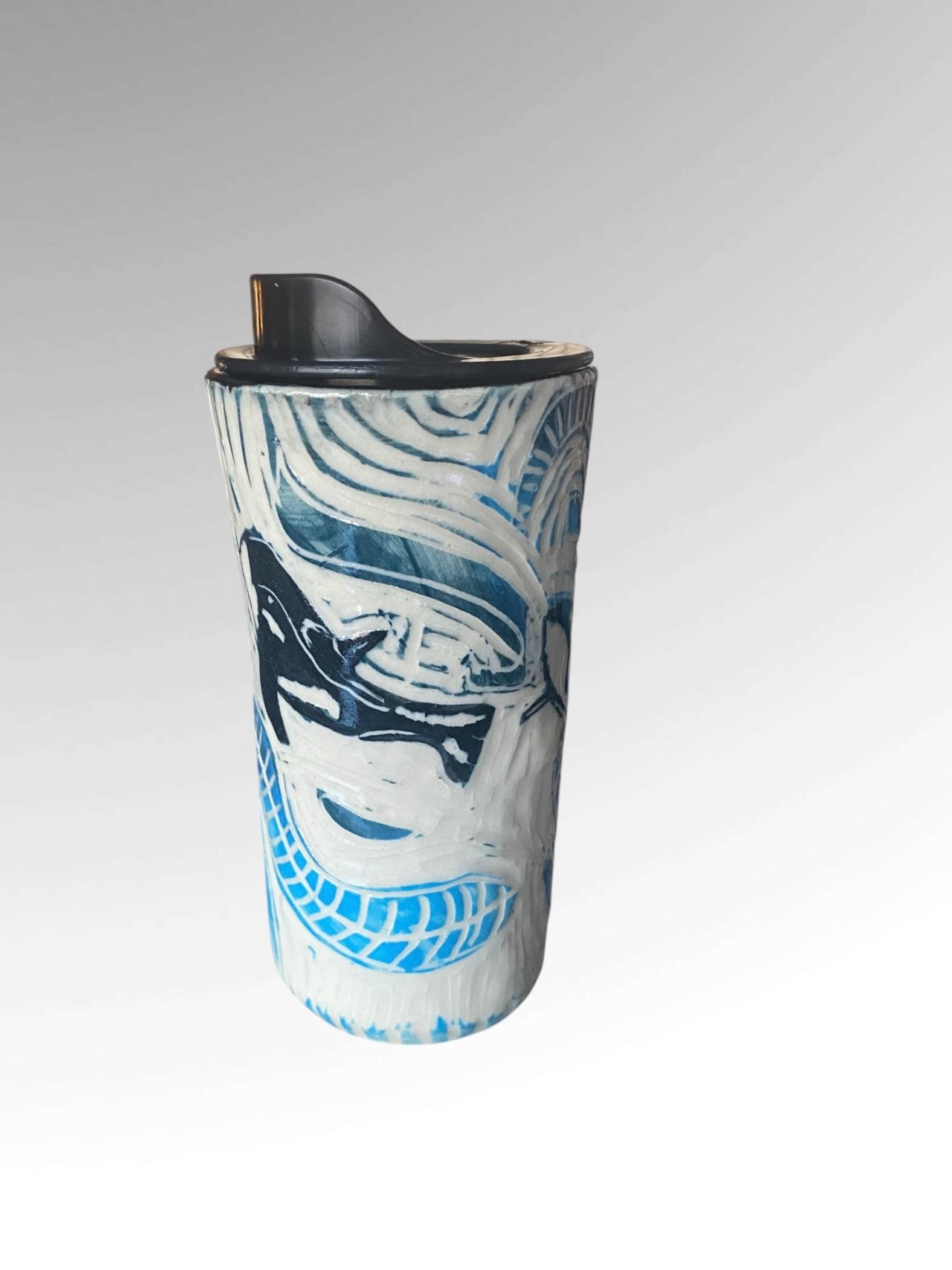 This 16-ounce hand-carved orca-themed mug is hand-finished with a clear glaze. The mug is hand-thrown from a porcelain clay. The locking-BPA-free lid prevents spills, and the mug easily fits in a car cup holder. This is the perfect gift for your coffee or tea lover.