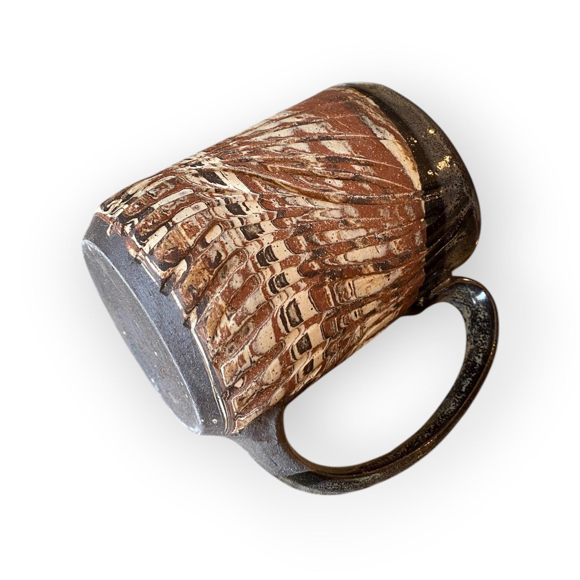 This handmade agateware coffee mug is a perfect blend of artistry and function. Crafted from layered stoneware, it features a smooth, soft cinnamon satin glaze that enhances its natural patterns. Holding 14 ounces, this mug is ideal for your morning coffee, afternoon tea, or any warm beverage of your choice. The unique agateware design, combined with its comfortable shape, makes this piece a standout in any mug collection. A great gift for pottery lovers or anyone who appreciates handcrafted, one-of-a-kind creations.