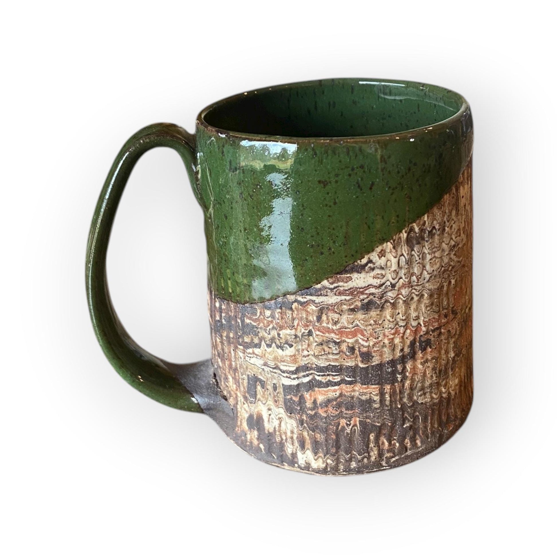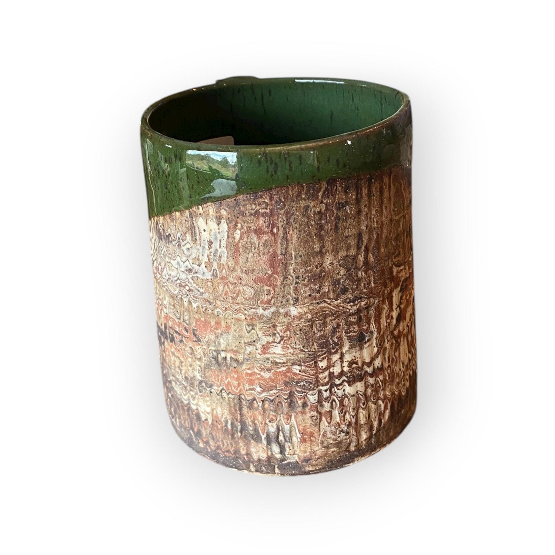 This handmade agateware coffee mug is a perfect blend of artistry and function. Crafted from layered stoneware, it features a smooth, copper satin glaze that enhances its natural patterns. Holding 14 ounces, this mug is ideal for your morning coffee, afternoon tea, or any warm beverage. The unique agateware design, combined with its comfortable shape, makes this piece a standout in any mug collection. An excellent gift for pottery lovers or anyone who appreciates handcrafted, one-of-a-kind creations.