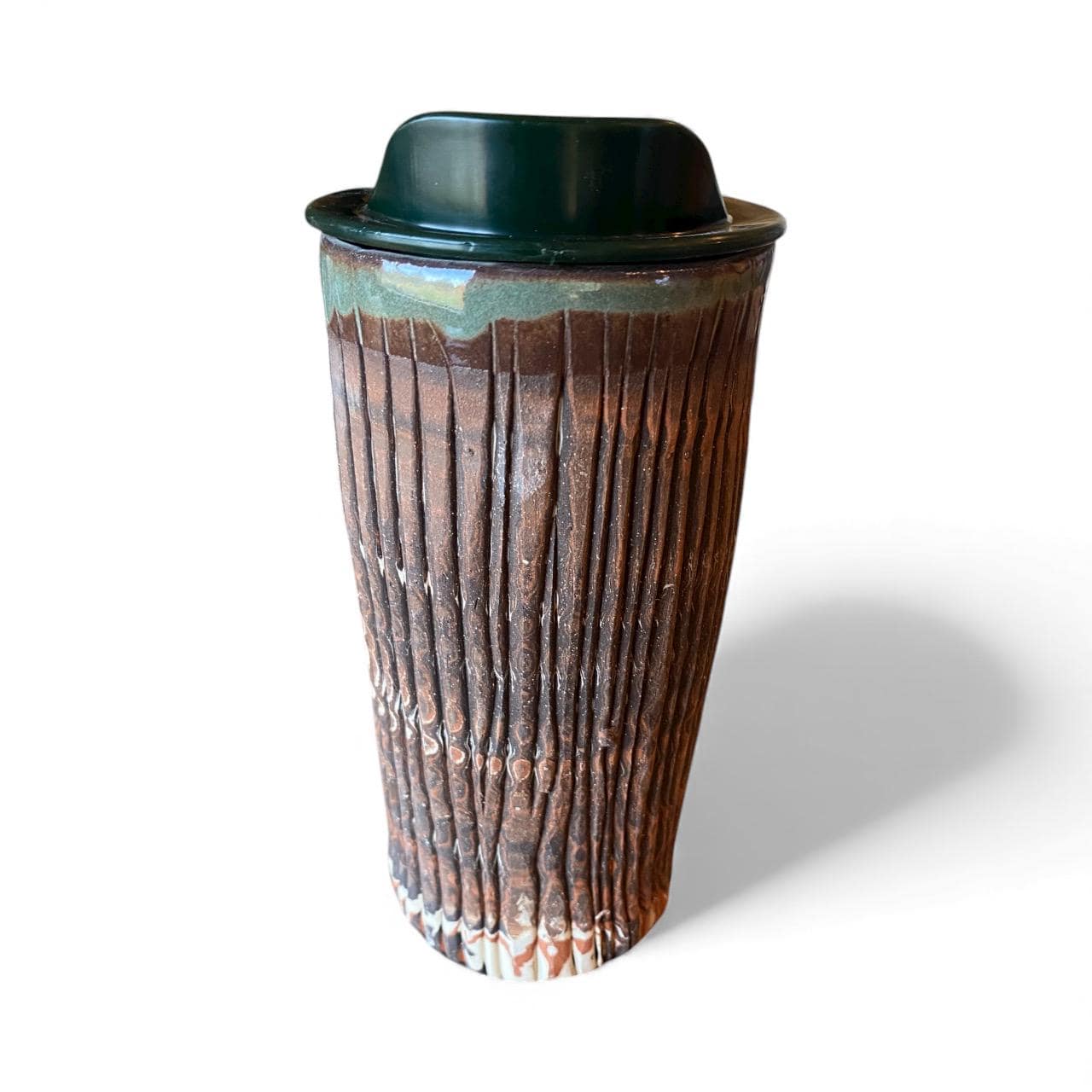 Experience the colors of the Southwest with this 16-ounce Handmade Agateware Stoneware Travel Mug. Each mug is wheel-thrown, heavily fluted, and crafted from three layers of colored stoneware clay, then finished with a reactive cinnamon glaze that reveals rich, natural variations reminiscent of desert canyons and layered rock formations.