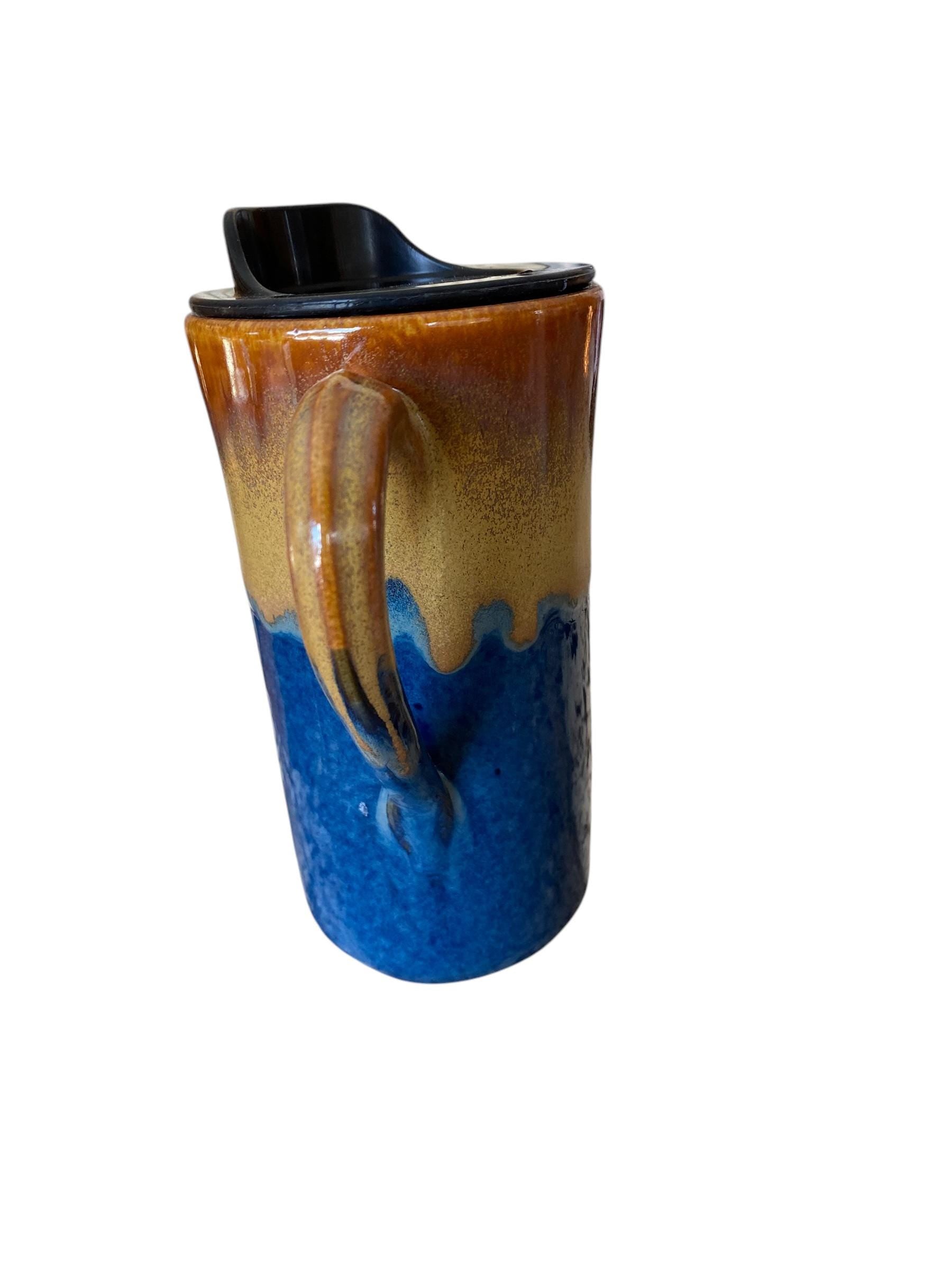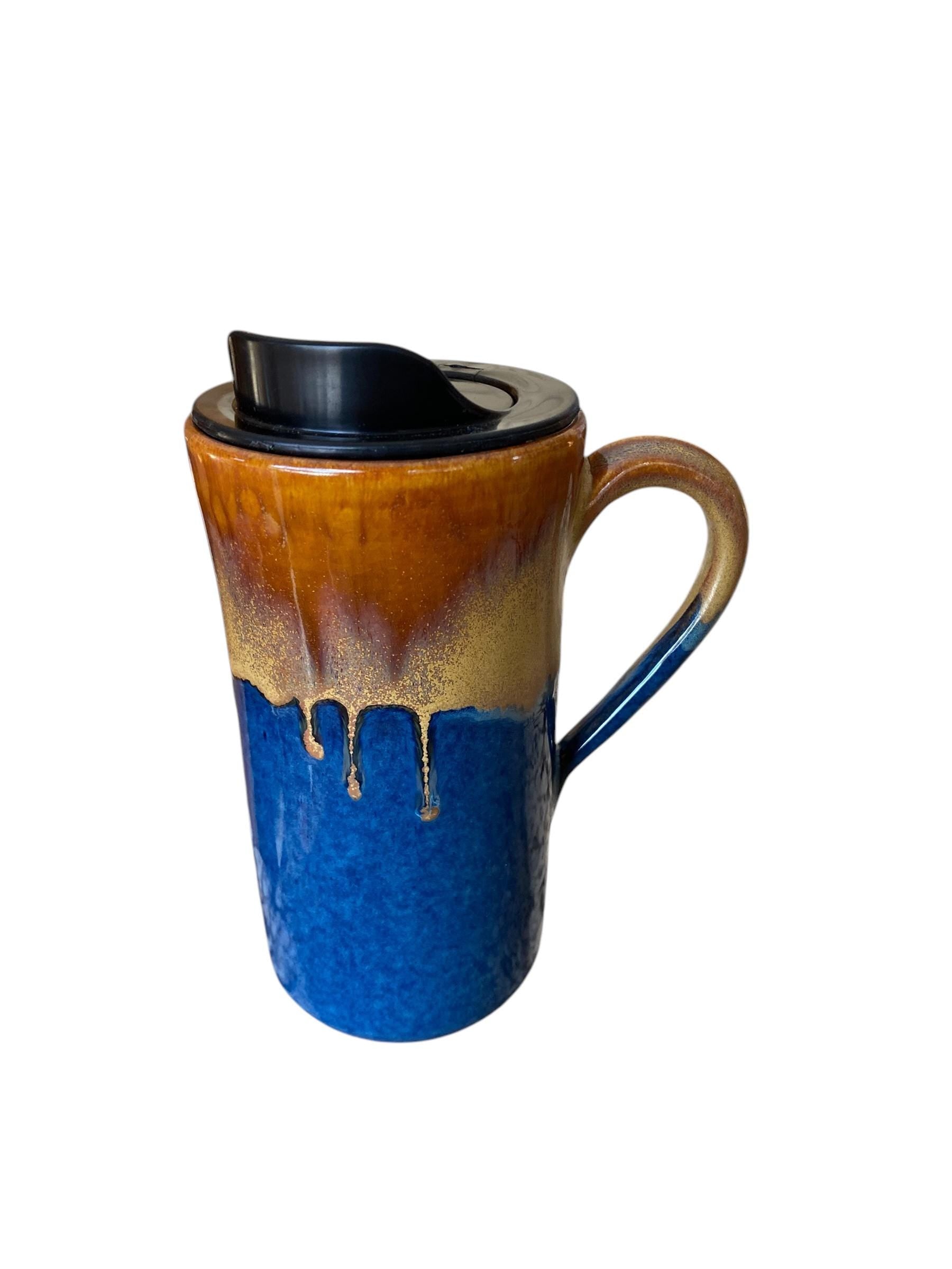 This 16-ounce Caramel and Blue porcelain travel mug is hand-finished with a reactive Caramel and Blue glaze. The mug is hand-thrown from a porcelain clay. The locking BPA-free lid prevents spills, and the mug easily fits in a car cup holder. This is the perfect gift for your coffee or tea lover.
