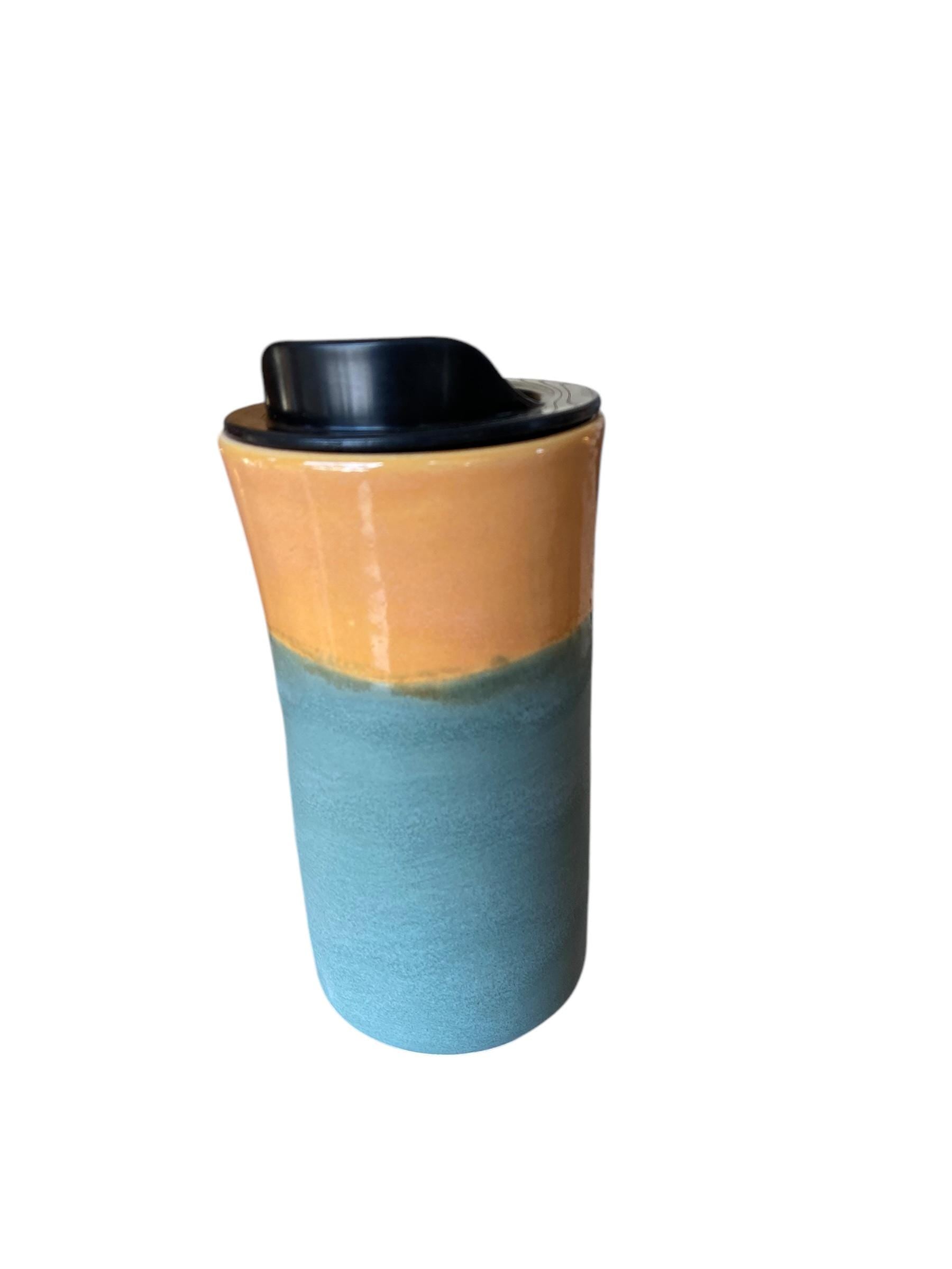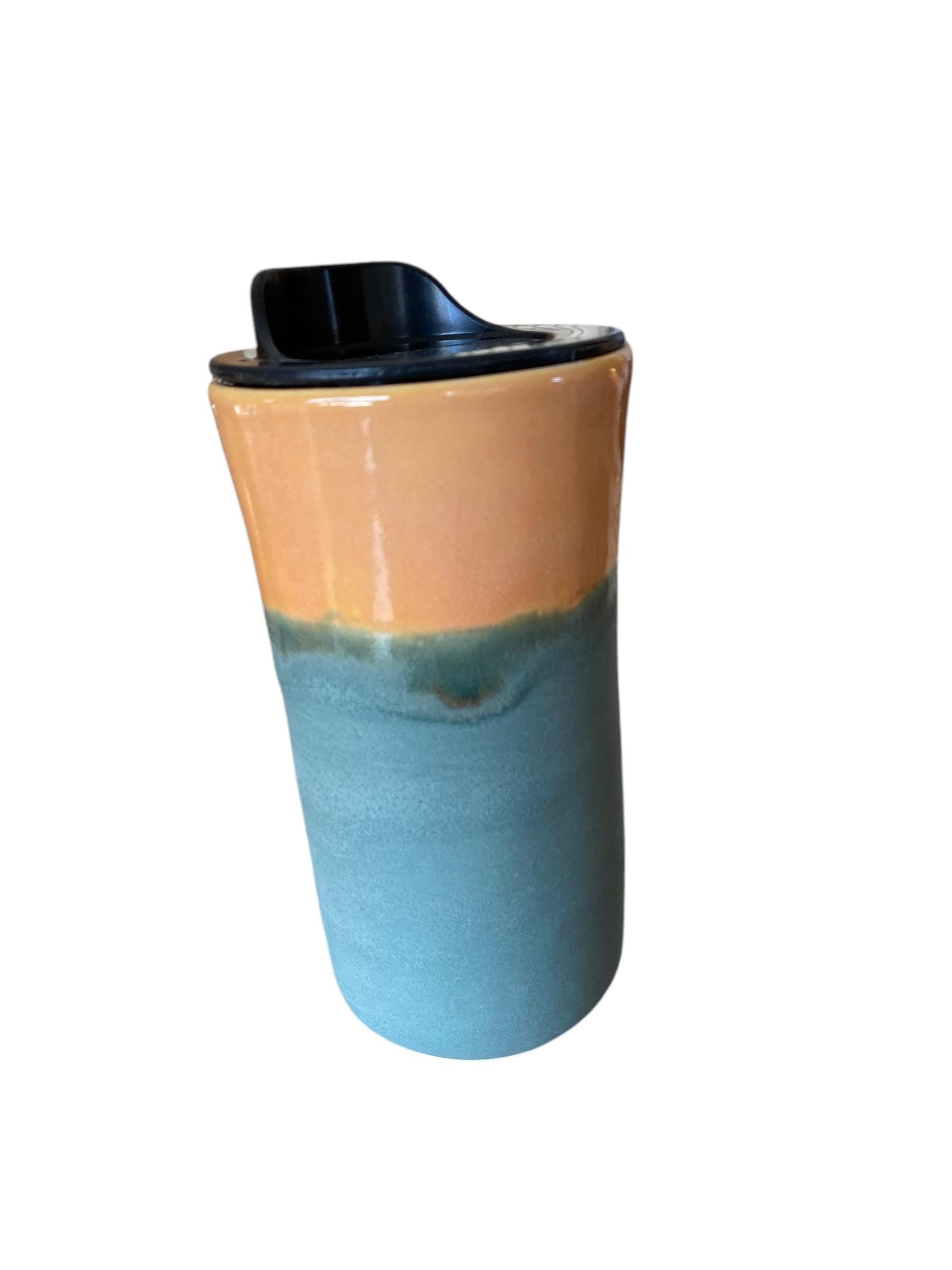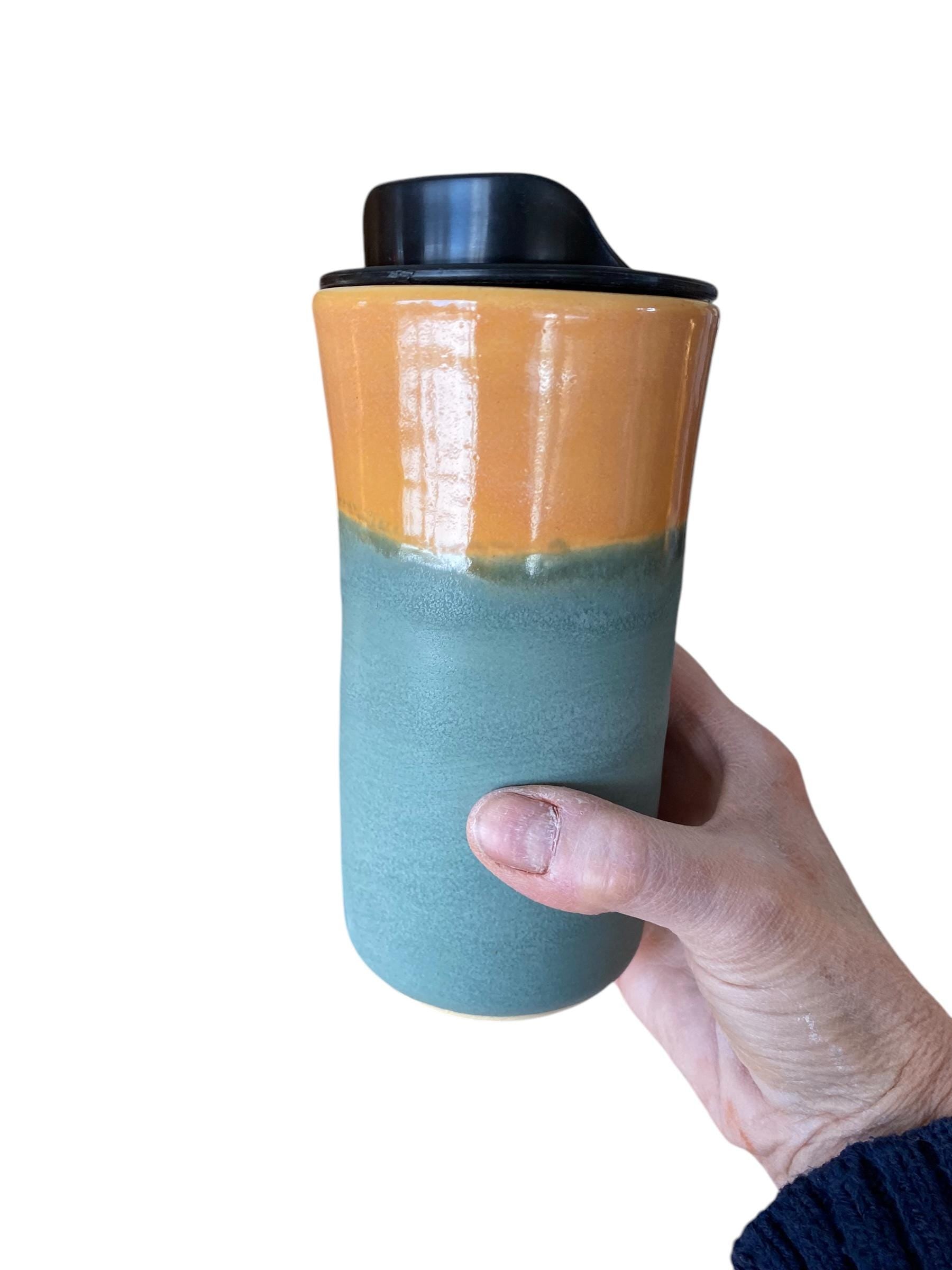 This 16-ounce Caramel Dusty Green porcelain travel mug is hand-finished with a reactive Caramel Dusty Green glaze. The mug is hand-thrown from a porcelain clay. The locking BPA-free lid prevents spills, and the mug easily fits in a car cup holder. This is the perfect gift for your coffee or tea lover.