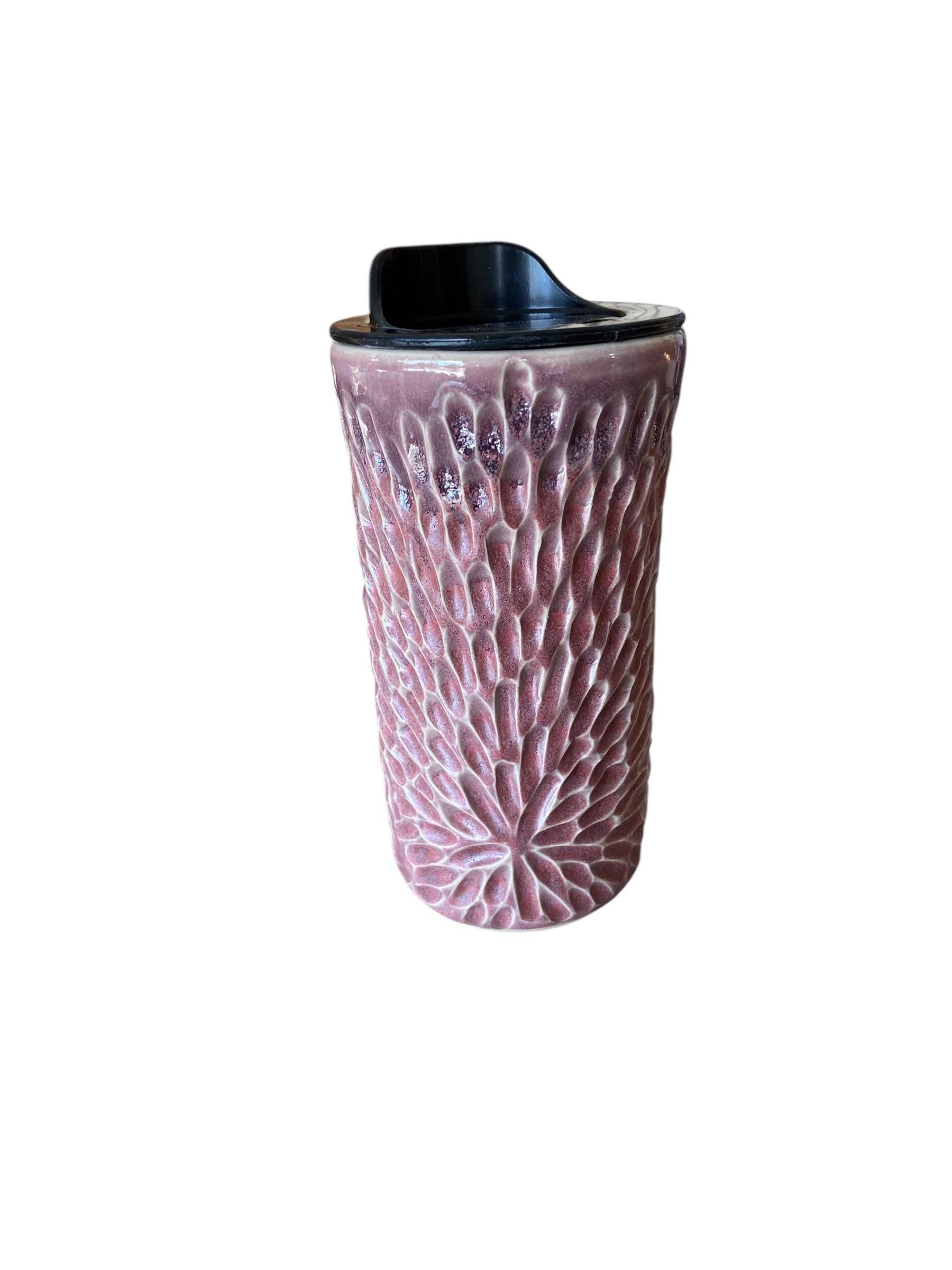 This 16-ounce Carved Merlot porcelain travel mug is hand-finished with a hand-carved design and Merlot glaze. The mug is hand-thrown from a porcelain clay. The locking BPA-free lid prevents spills, and the mug easily fits in a car cup holder. This is the perfect gift for your coffee or tea lover.