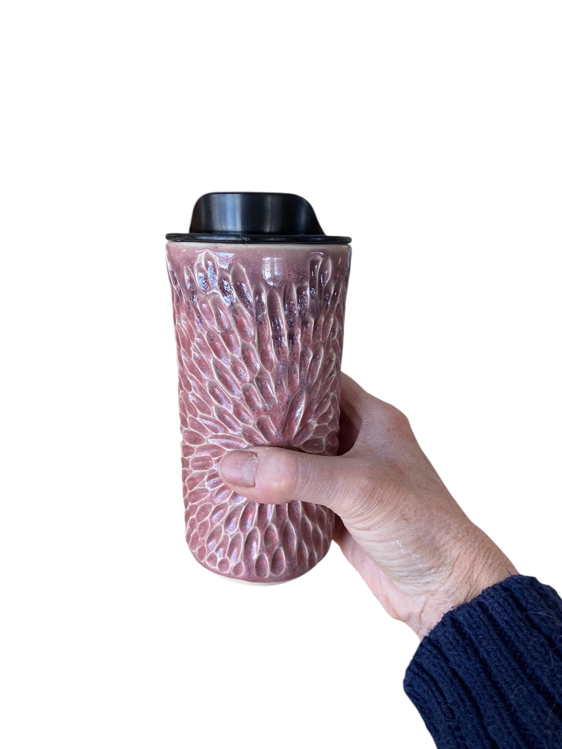 Handmade Hand Carved Merlot Travel Mug - Porcelain - Travel Coffee Cup - Travel Mug - Pottery Mug - Coffee Mug
