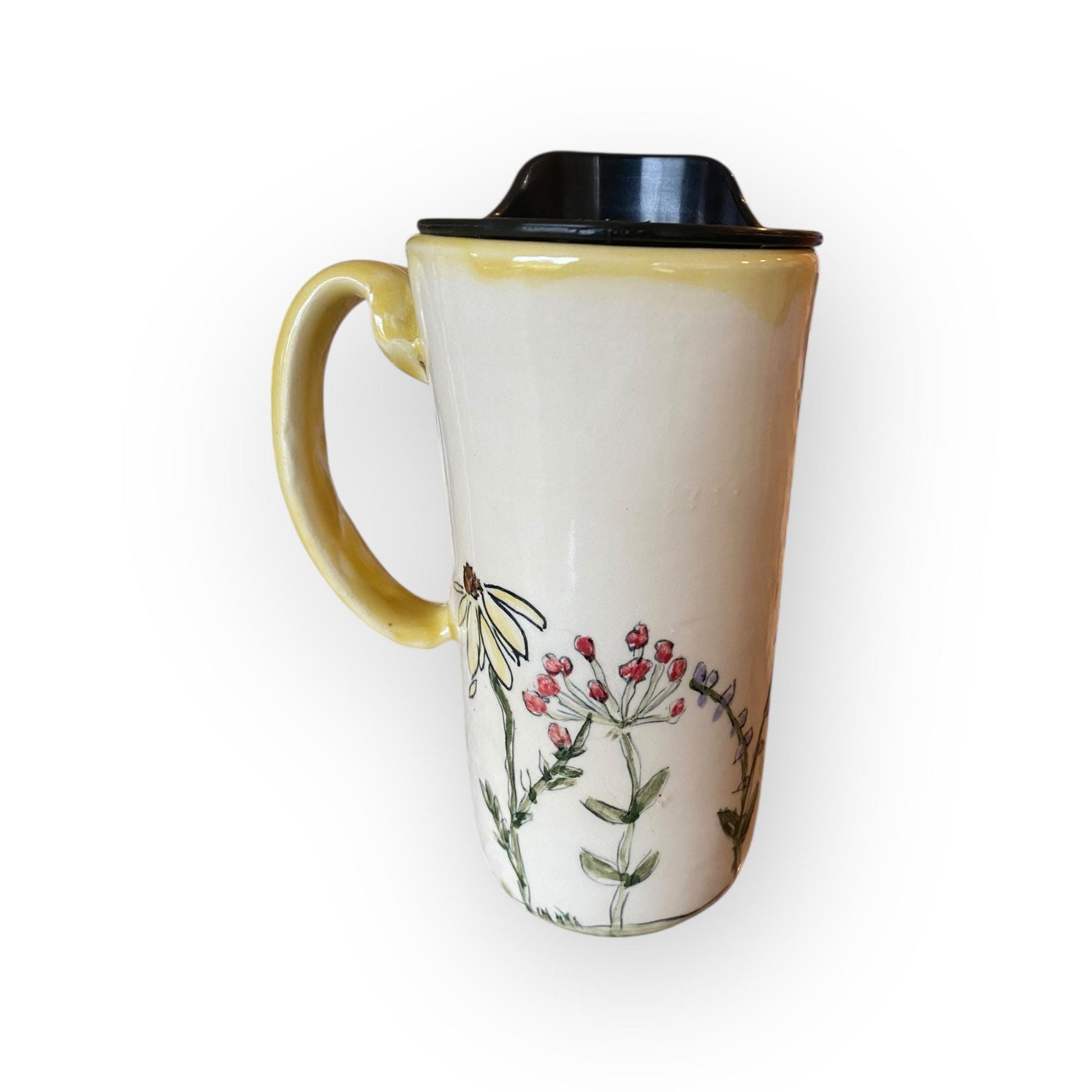 This 16 ounce stoneware mug is hand painted with a cat enjoying summer flowers. Each mug is unique and one of a kind. The interior glaze color enhances the art. This is the perfect gift for the coffee or tea lover in your life.