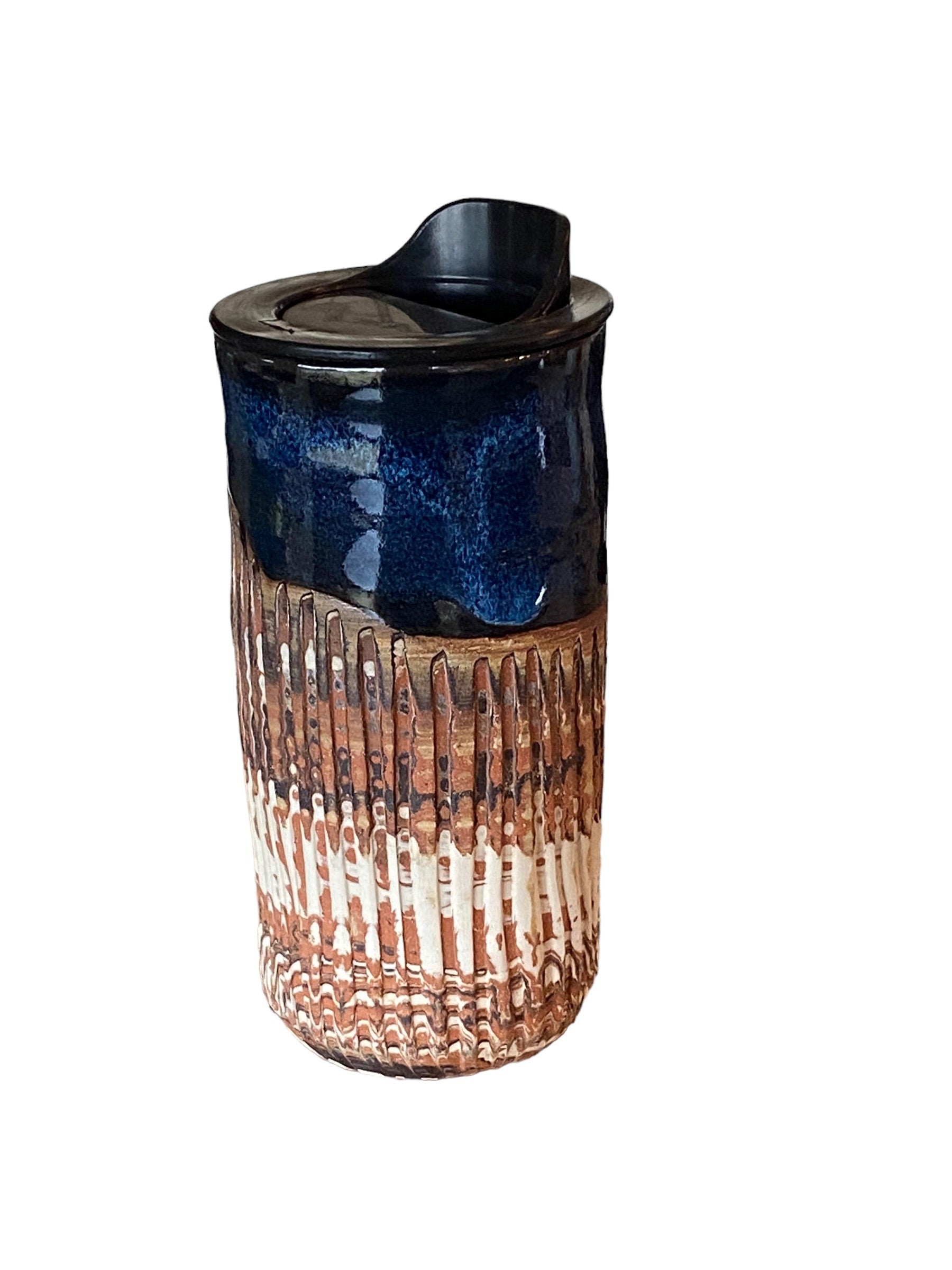 Handmade Heavily Fluted Agateware Travel Mug with Sapphire Blue Glaze - Includes Locking Lid and Sleeve for Stylish and Secure Travel