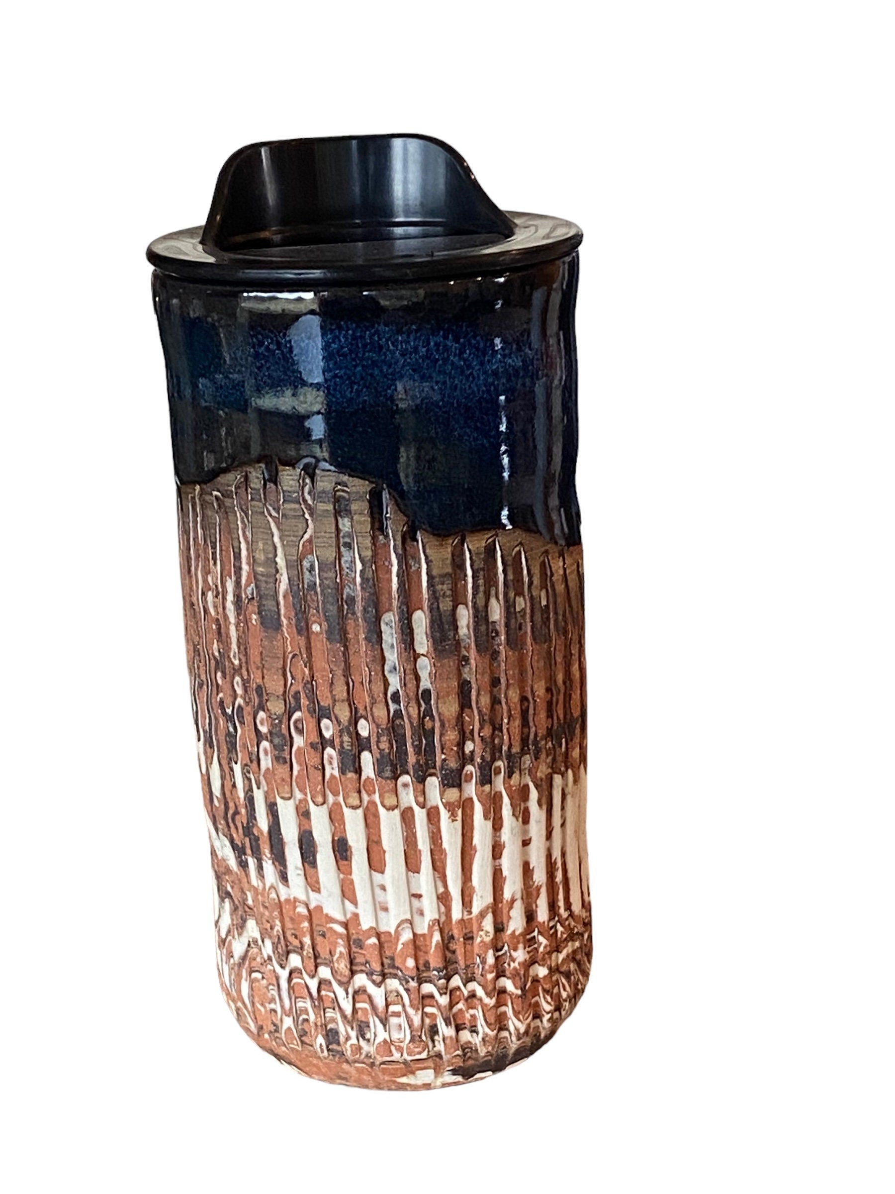 My Handmade Heavily Fluted Agateware 16 Ounce Travel Mug with Sapphire Blue Glaze combines artistry and functionality for your on-the-go adventures. Crafted with care from three colors of stoneware clay and adorned with a captivating sapphire blue glaze, this travel mug boasts a unique heavily fluted design that adds texture and elegance to your daily routine. Complete with a locking lid and sleeve, it's the perfect companion for enjoying your favorite beverages wherever life takes you.