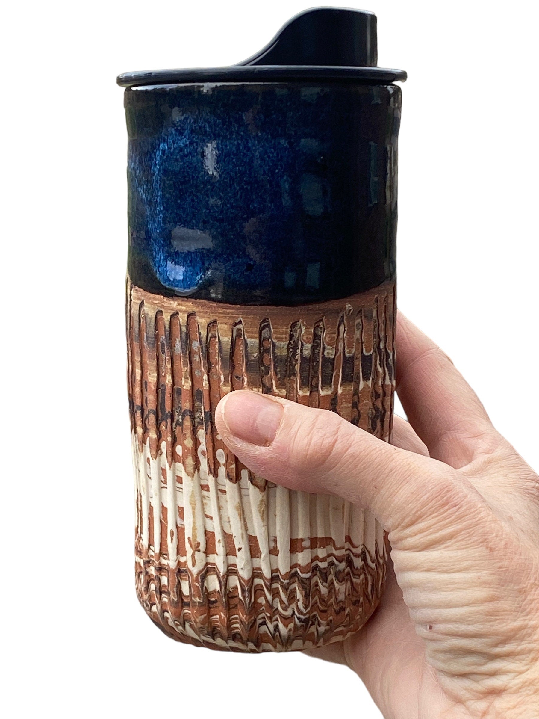 Elevate your on-the-go beverage experience with our Handmade Heavily Fluted Agateware 16 Ounce Travel Mug with Sapphire Blue Glaze. With its unique design, vibrant color, and practical features, it's the perfect accessory for adding style and sophistication to your daily travels.