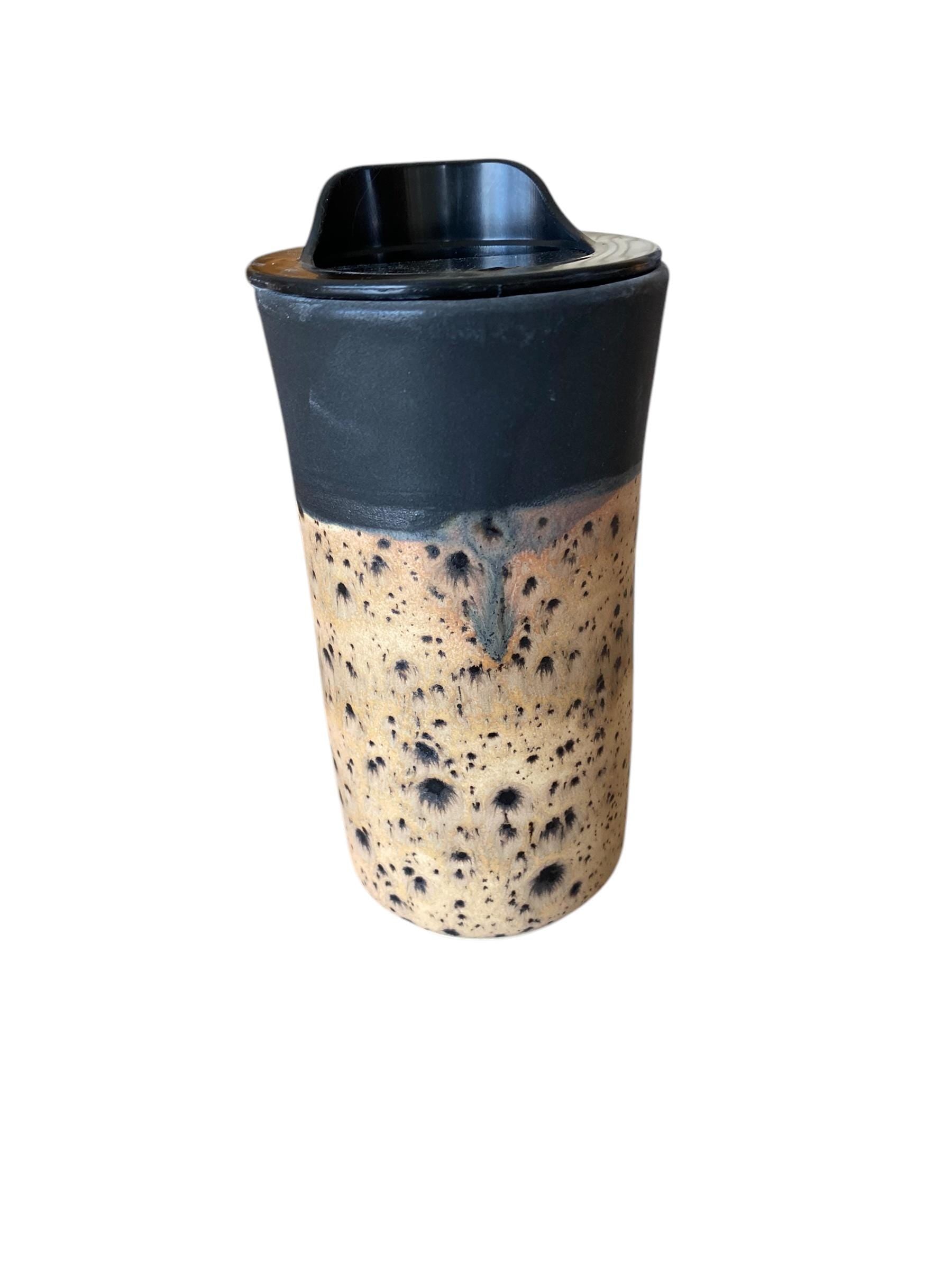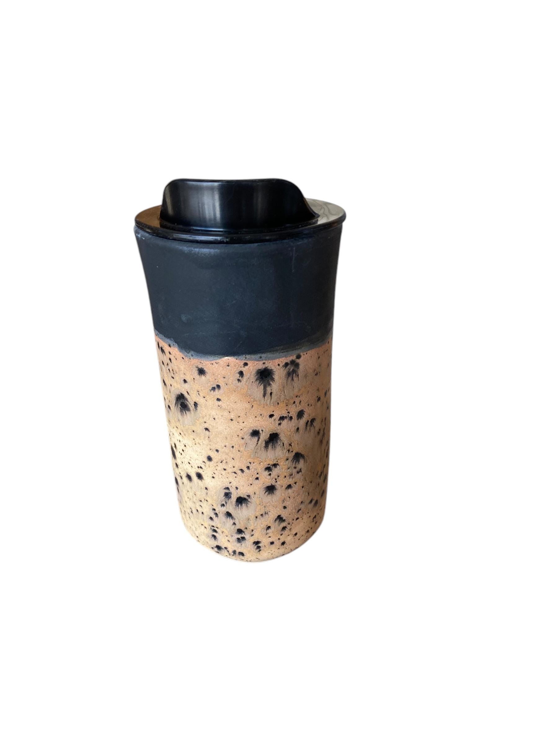 This 16-ounce Matte Black and Spotted Rust porcelain travel mug is hand-finished with a reactive Matte Black and Spotted Rust glaze. The mug is hand-thrown from a porcelain clay. The locking BPA-free lid prevents spills, and the mug easily fits in a car cup holder. This is the perfect gift for your coffee or tea lover.
