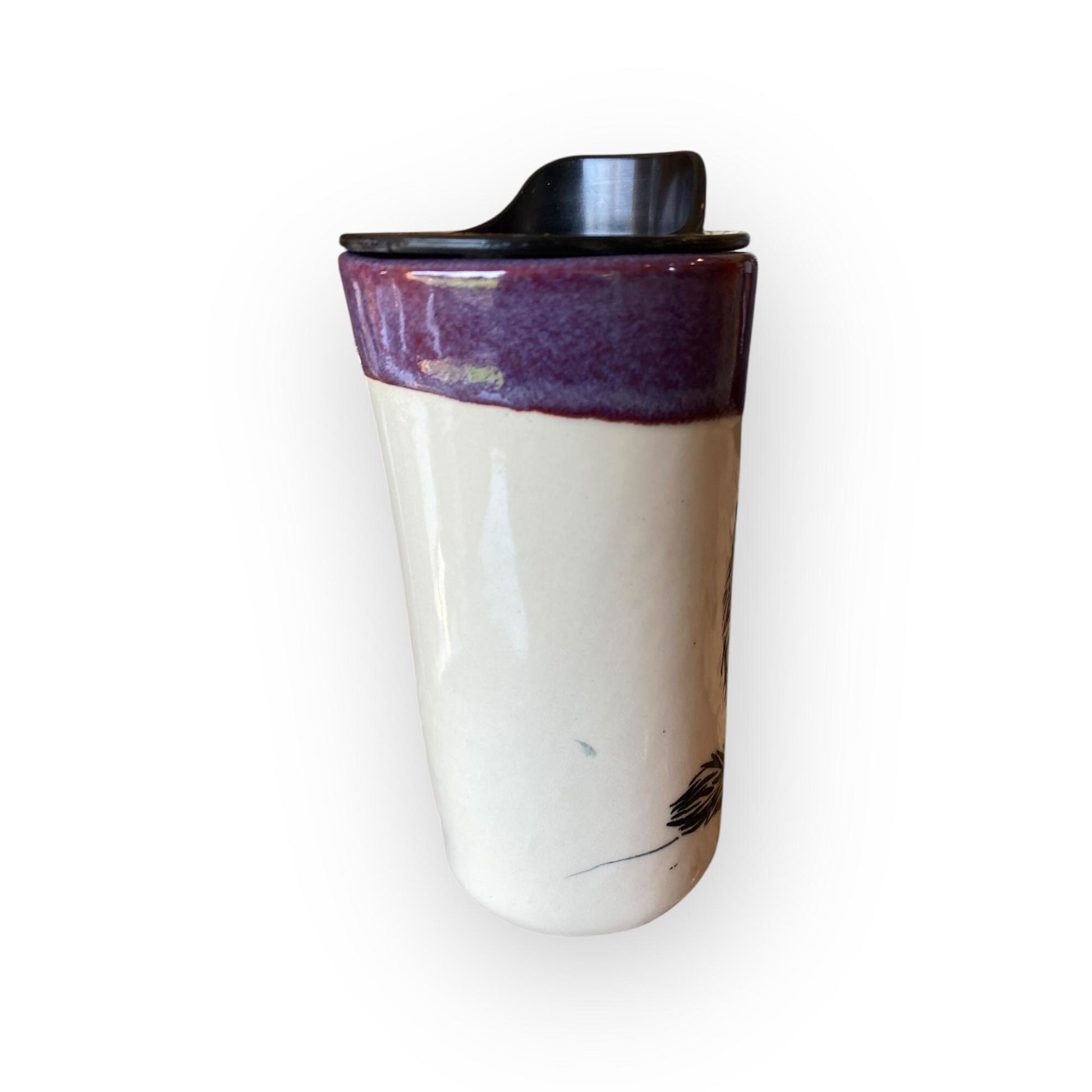 This 16-ounce silk-screened cat-themed mug is hand-finished with a clear glaze, with the interior and top lip glazed with a bright purple. The mug is hand-made from porcelain clay. The locking BPA-free lid prevents spills, and the mug easily fits in a car cup holder. This is the perfect gift for your coffee or tea lover.