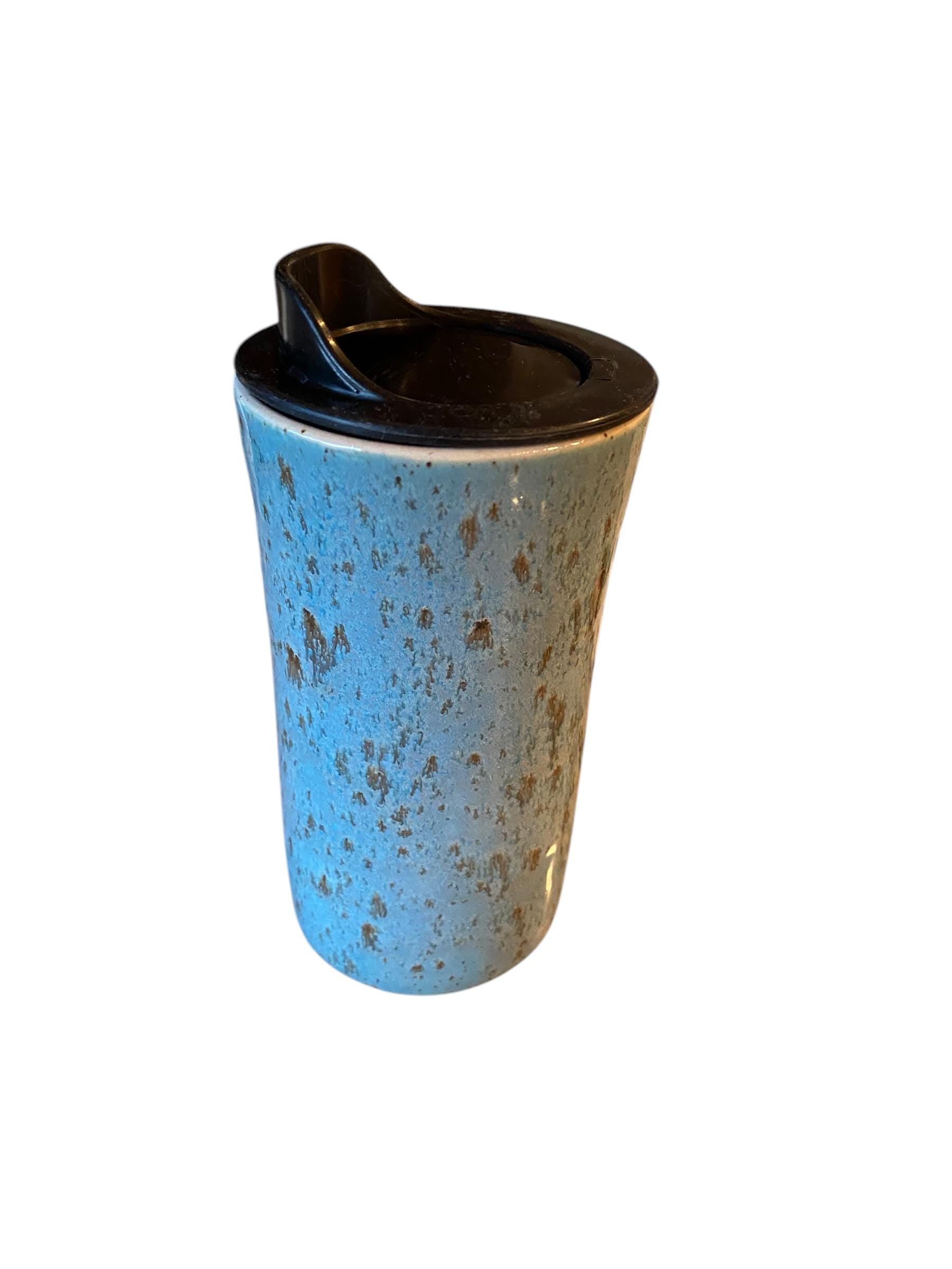 This 16-ounce travel mug has been glazed in colors that resemble a robin's egg. The mug is hand-thrown from a porcelain clay. The locking lid prevents spills and the mug easily fits in a car cup holder. This is the perfect gift for the person on the go.