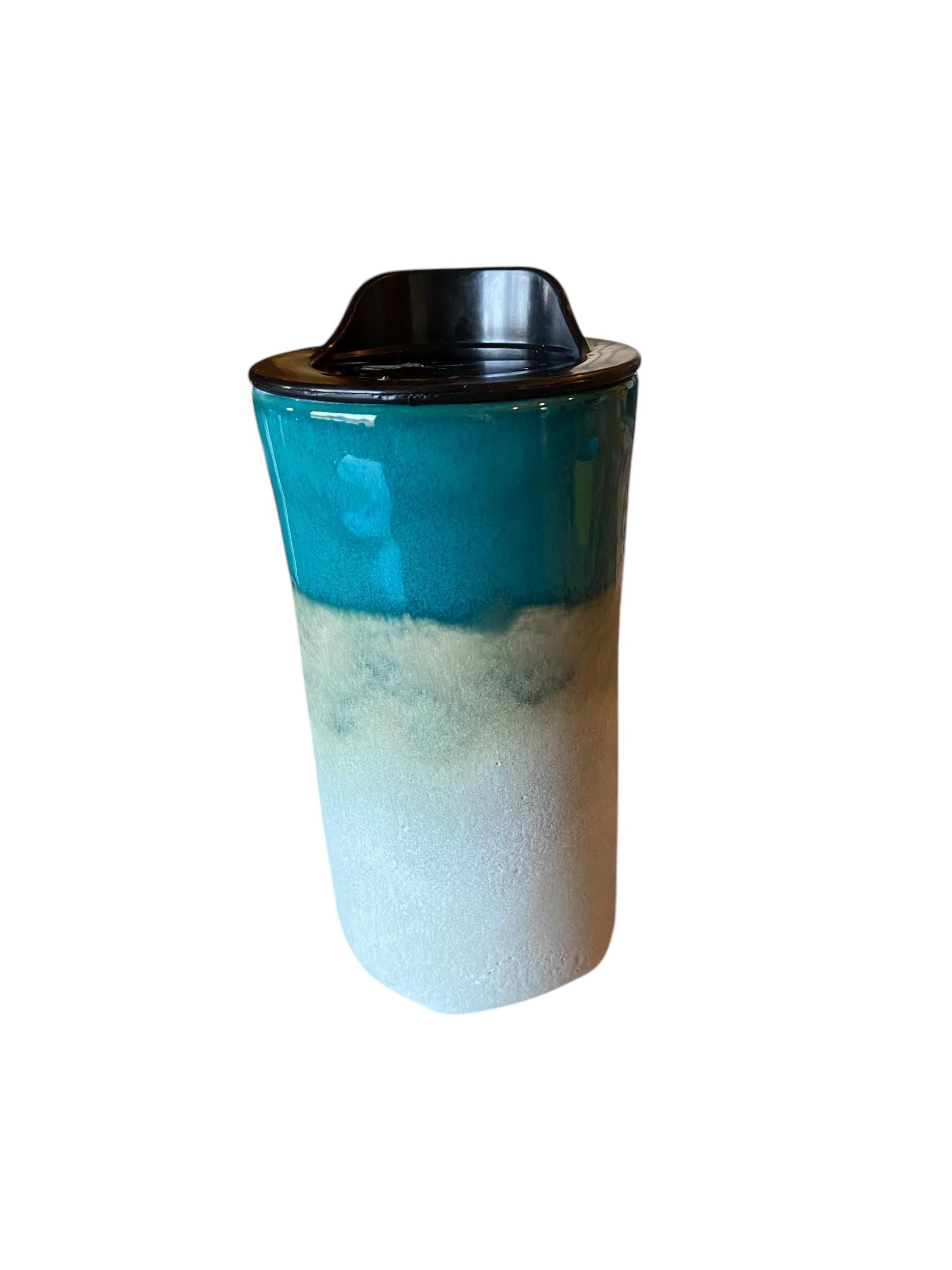 This 16-ounce reactive Turquoise and Sea Blue porcelain travel mug is hand-finished with a reactive blue and purple glaze. The mug is hand-thrown from a porcelain clay. The locking-free lid prevents spills and the mug easily fits in a car cup holder. This is the perfect gift for your coffee or tea lover.