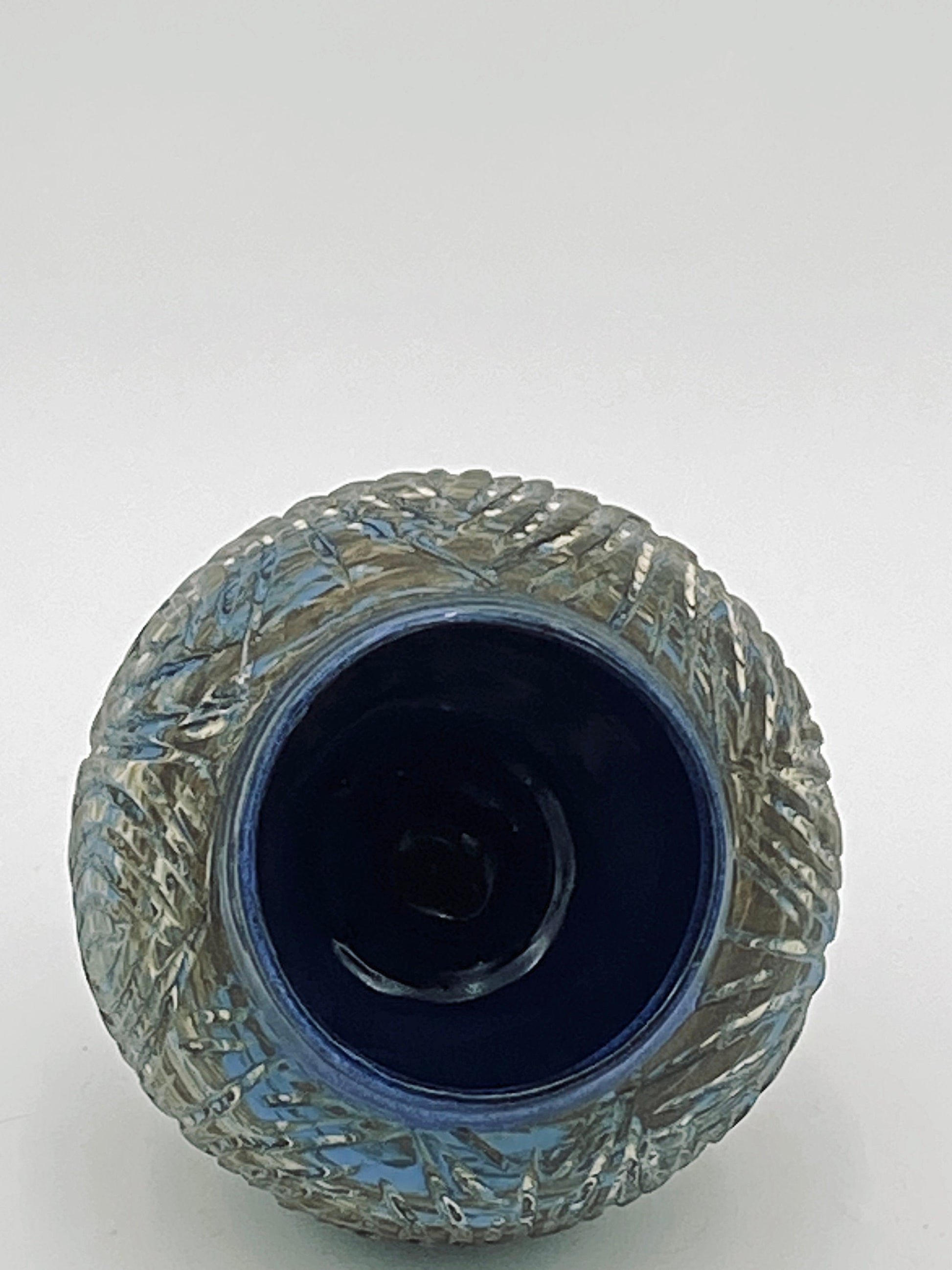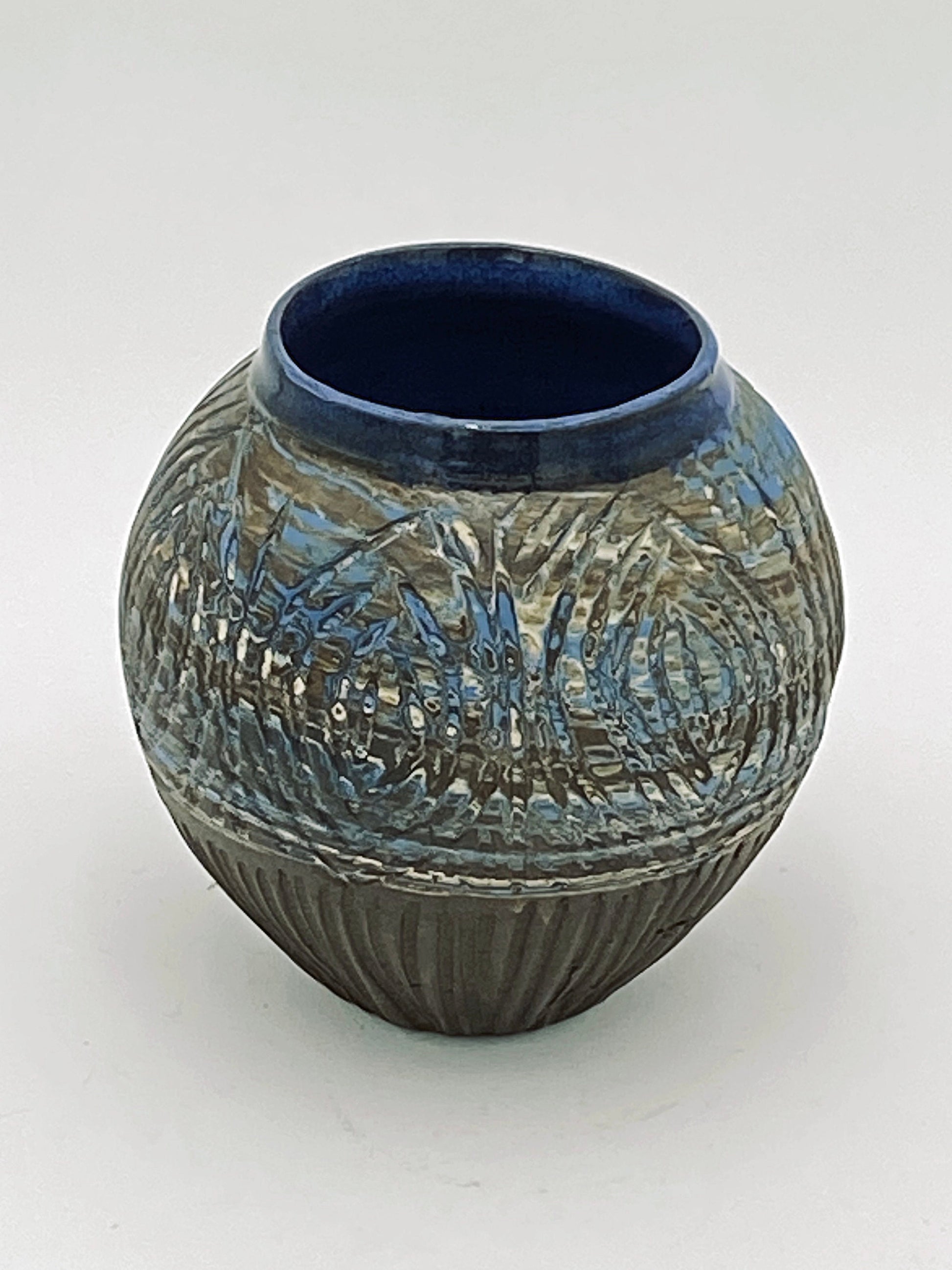 This Carved Agateware Vase is crafted from three colors of clay and features a unique carved pattern pattern that exposes the clay beneath. The interior of the vase is glazed with a bright blue glaze that complements the natural hues of the clay. The exterior has been meticulously sanded with 5 grits of diamond sanding blocks, resulting in a smooth eggshell finish that enhances the intricate pattern. This vase is a perfect addition to any home.
