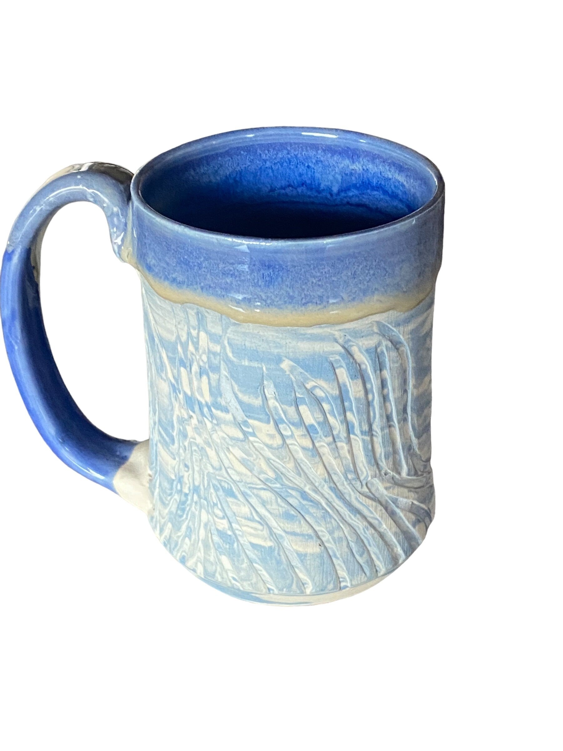Enjoy your morning coffee or afternoon tea in style with this Blue and White Agateware mug. Carefully hand-thrown from two clay colors, this mug features an intricately carved design created at the leather-hard stage. After the initial firing, the mug was glazed with a blue glaze and fired a second time. The exterior was then sanded with five grits of diamond sandpaper to create a smooth, raw surface. The end result is a mug that feels comfortable in your hands, with protective glazes that enhance and preserve the intricate design. This mug is a must-have for any coffee or tea enthusiast, perfect for nature lovers and anyone looking to add a bit of whimsical elegance to their drinkware collection.