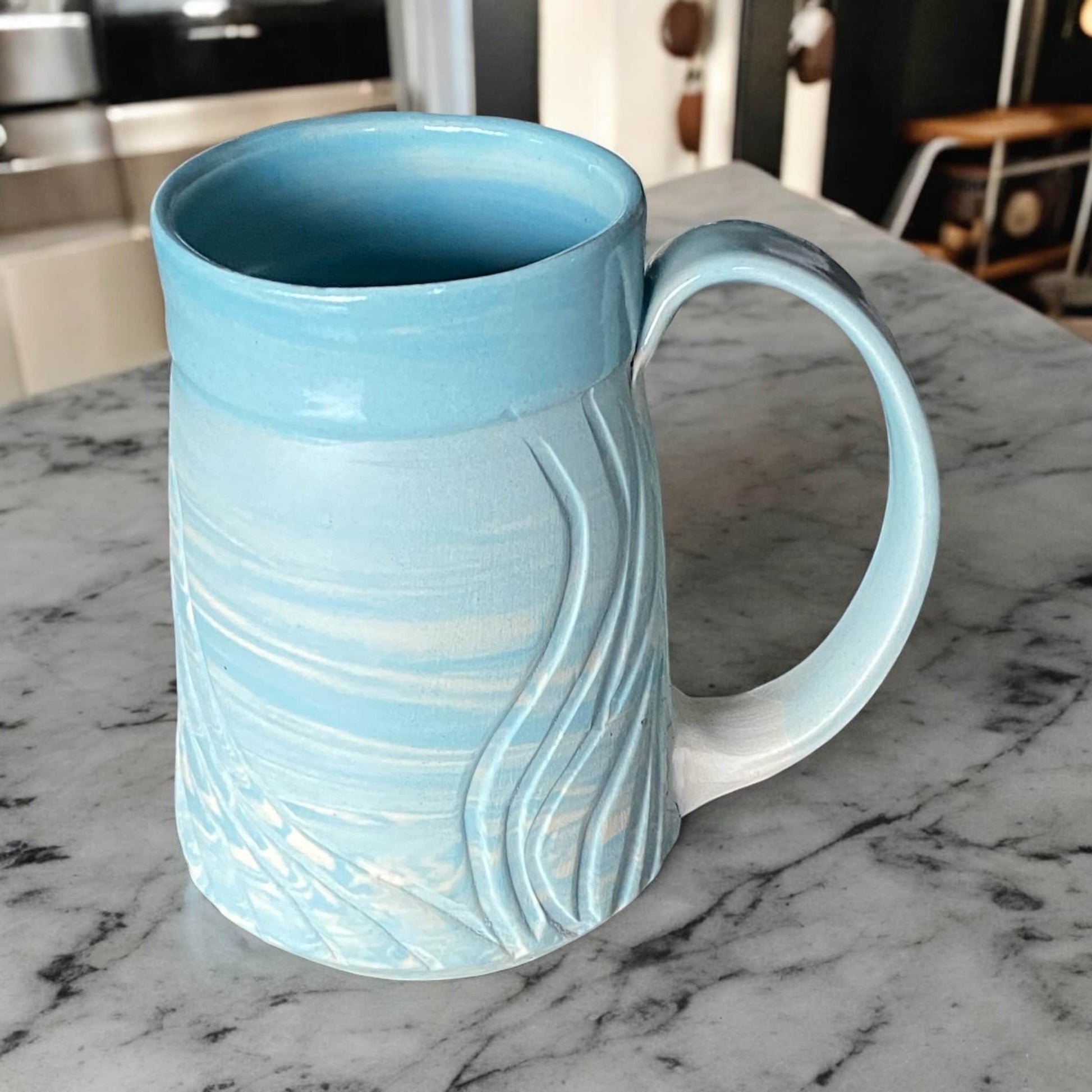 Enjoy your morning coffee or afternoon tea in style with this Robins Egg and White Agateware mug. Carefully hand-thrown from two clay colors, this mug features an intricately carved design created at the leather-hard stage. After the initial firing, the mug was glazed with a blue glaze and fired a second time. The exterior was then sanded with five grits of diamond sandpaper to create a smooth, raw surface. The end result is a mug that feels comfortable in your hands, with protective glazes that enhance and preserve the intricate design. This mug is a must-have for any coffee or tea enthusiast, perfect for nature lovers and anyone looking to add a bit of whimsical elegance to their drinkware collection.