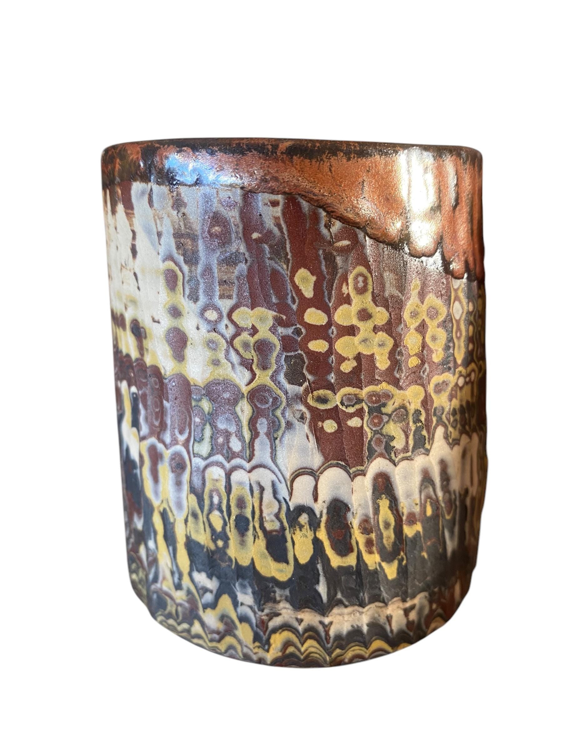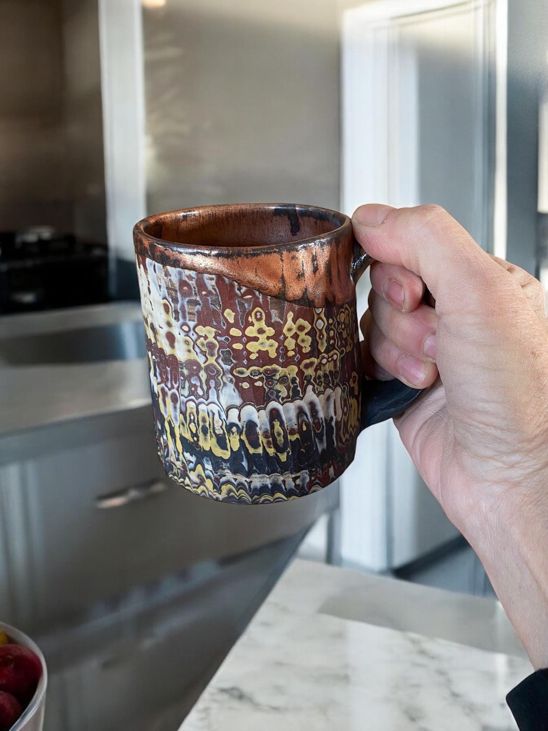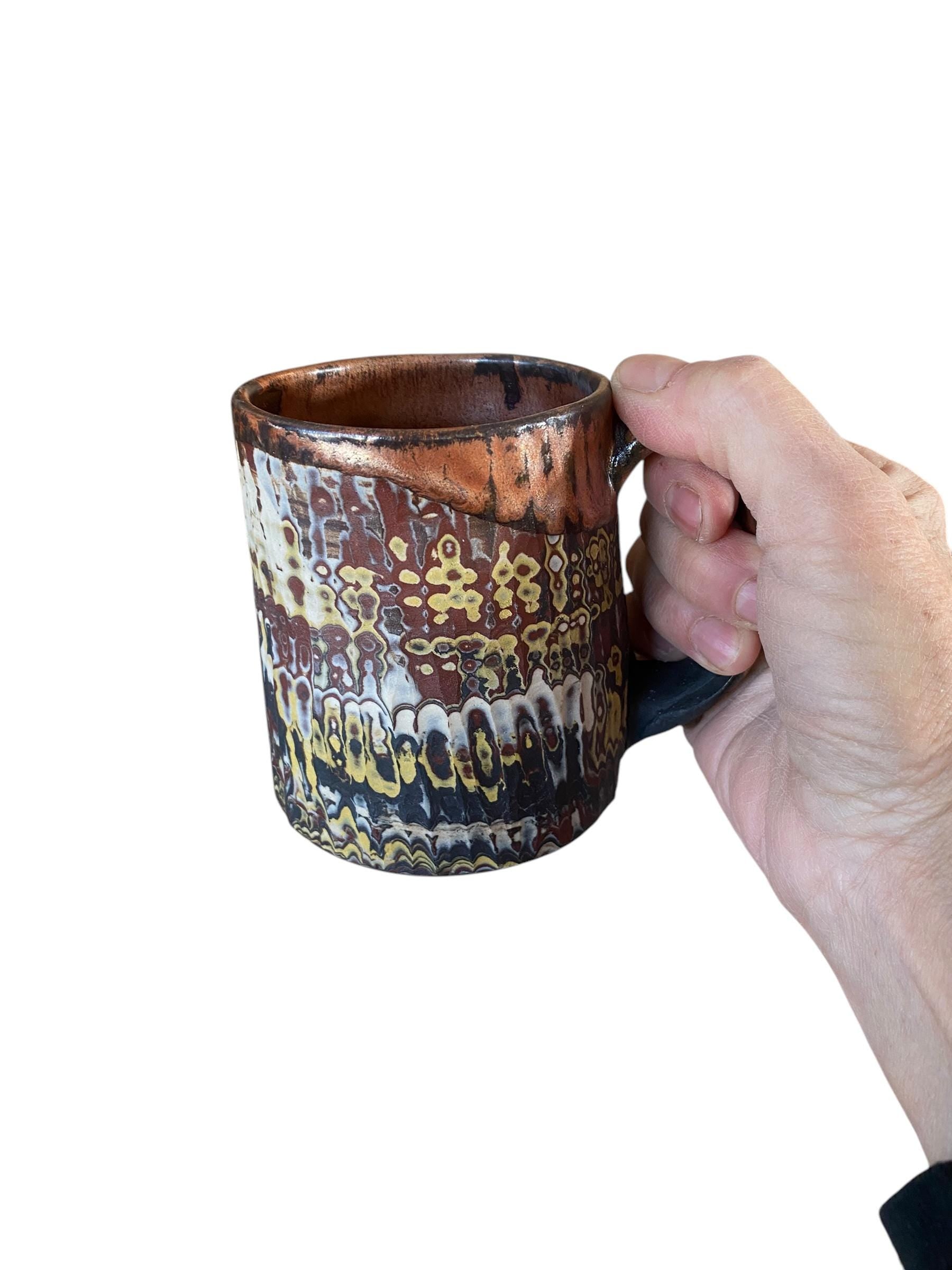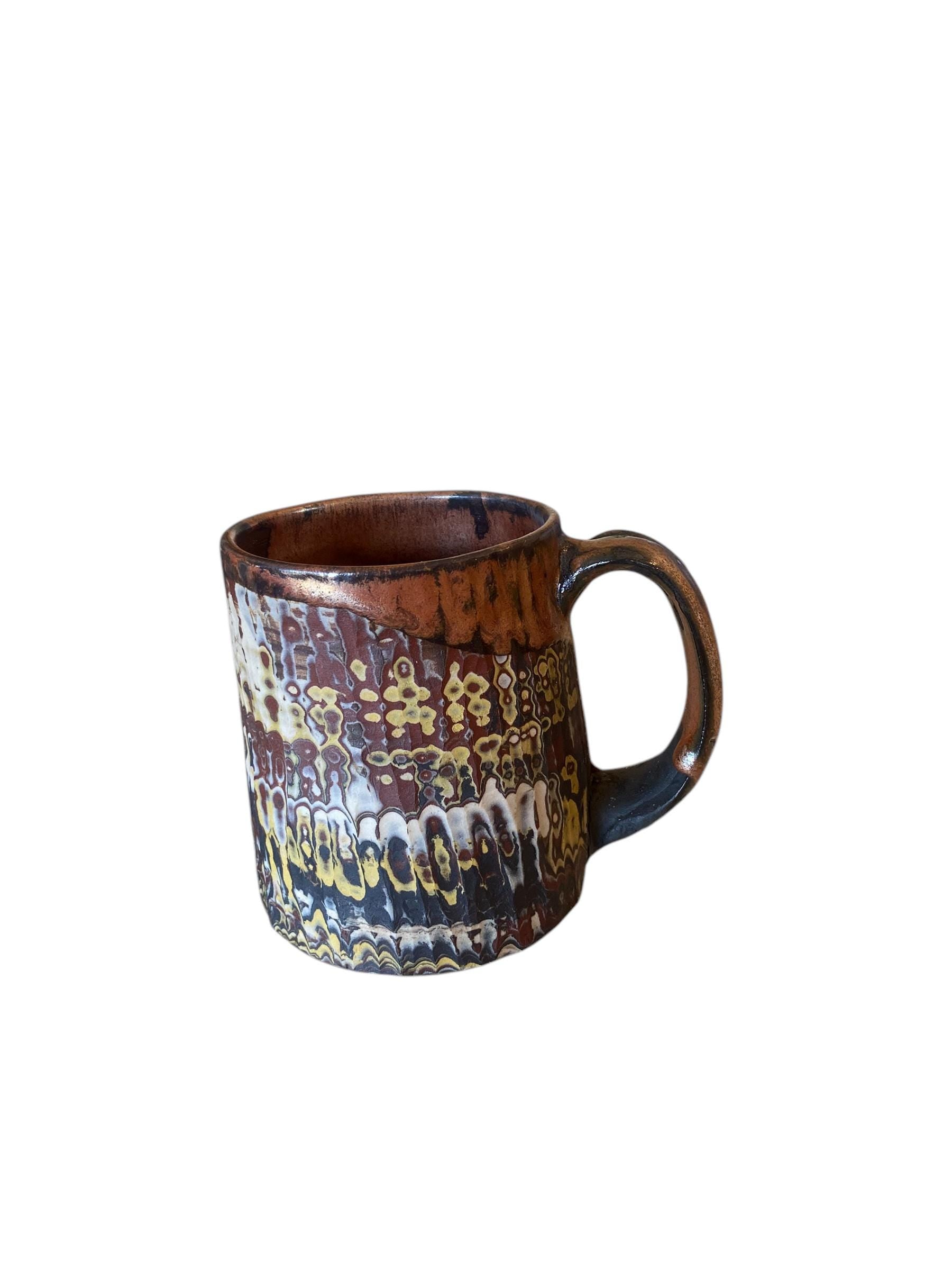 Enjoy your morning coffee or afternoon tea in style with this Agateware mug. Carefully hand-thrown from four clay colors, this mug features an intricately carved design created at the leather-hard stage. After the initial firing, the mug was glazed with a Copper glaze and fired a second time. The exterior was then sanded with five grits of diamond sandpaper to create a smooth, raw surface. The result is a mug that feels comfortable in your hands, with protective glazes that enhance and preserve the intricate design. This mug is a must-have for any coffee or tea enthusiast, perfect for nature lovers and anyone looking to add a bit of whimsical elegance to their drinkware collection.