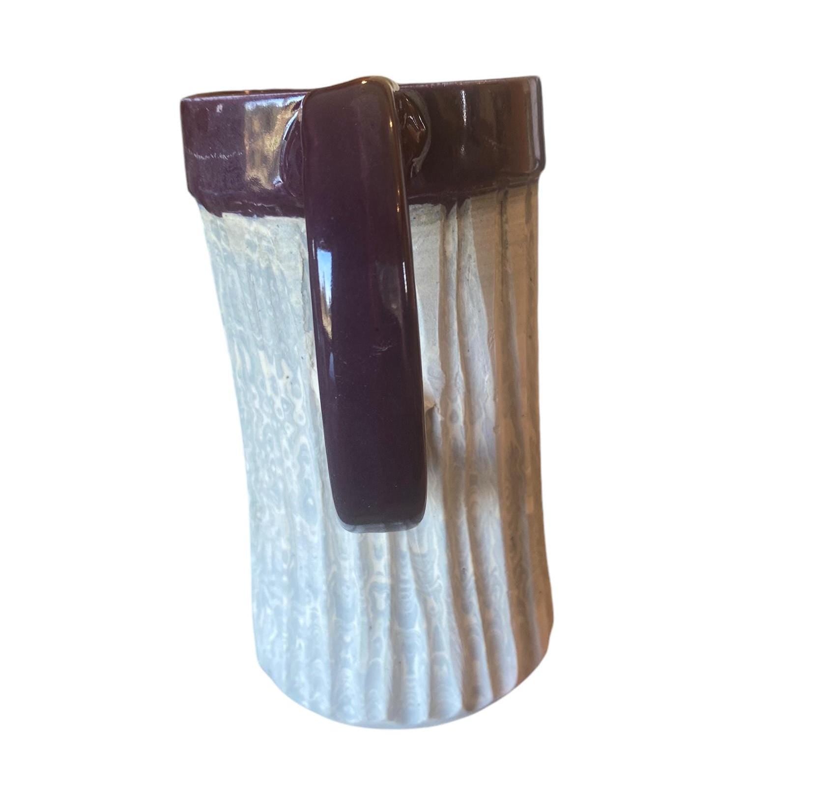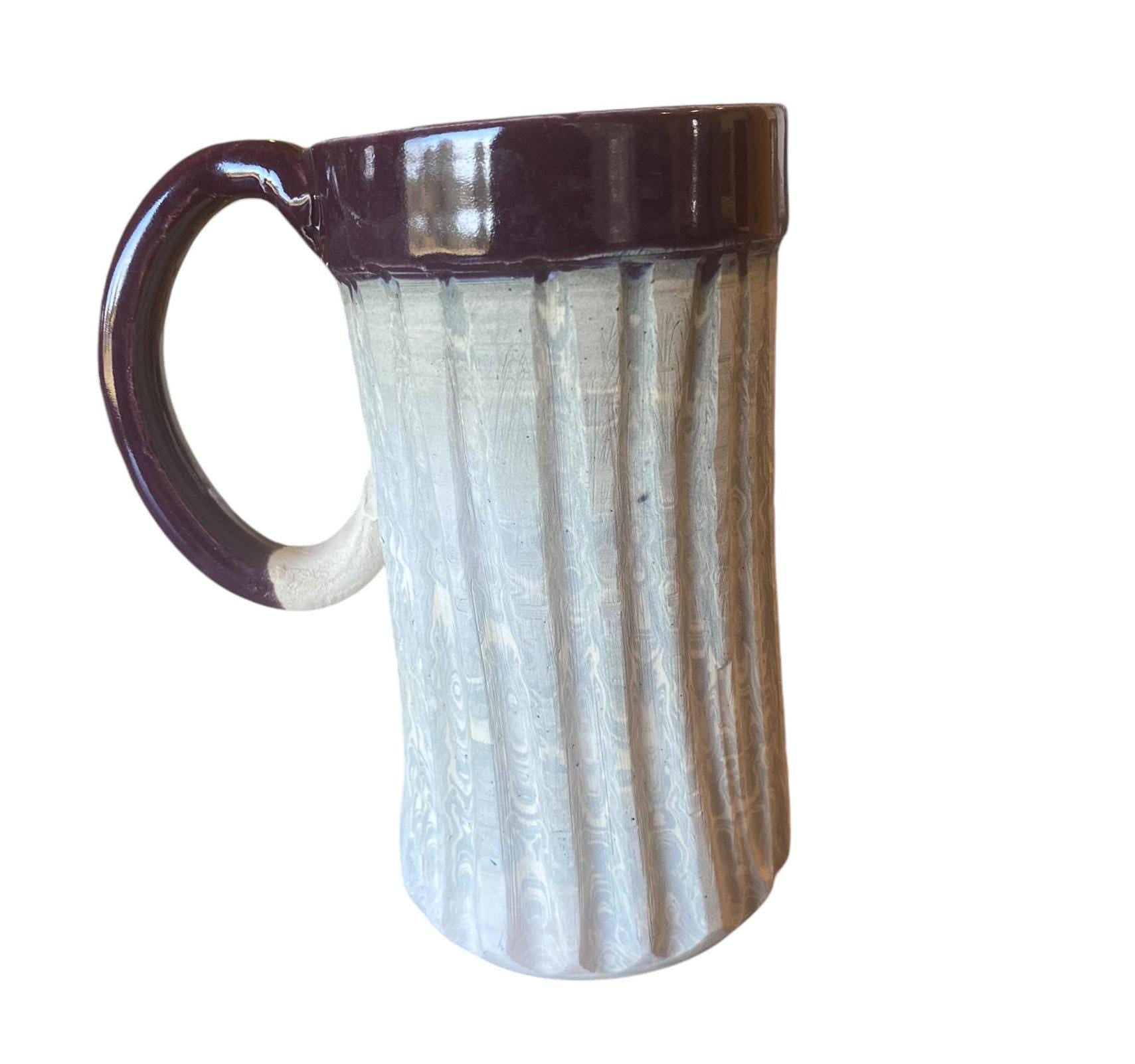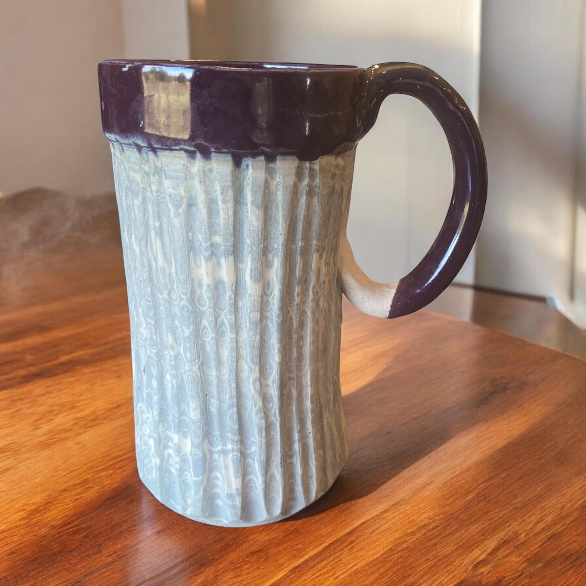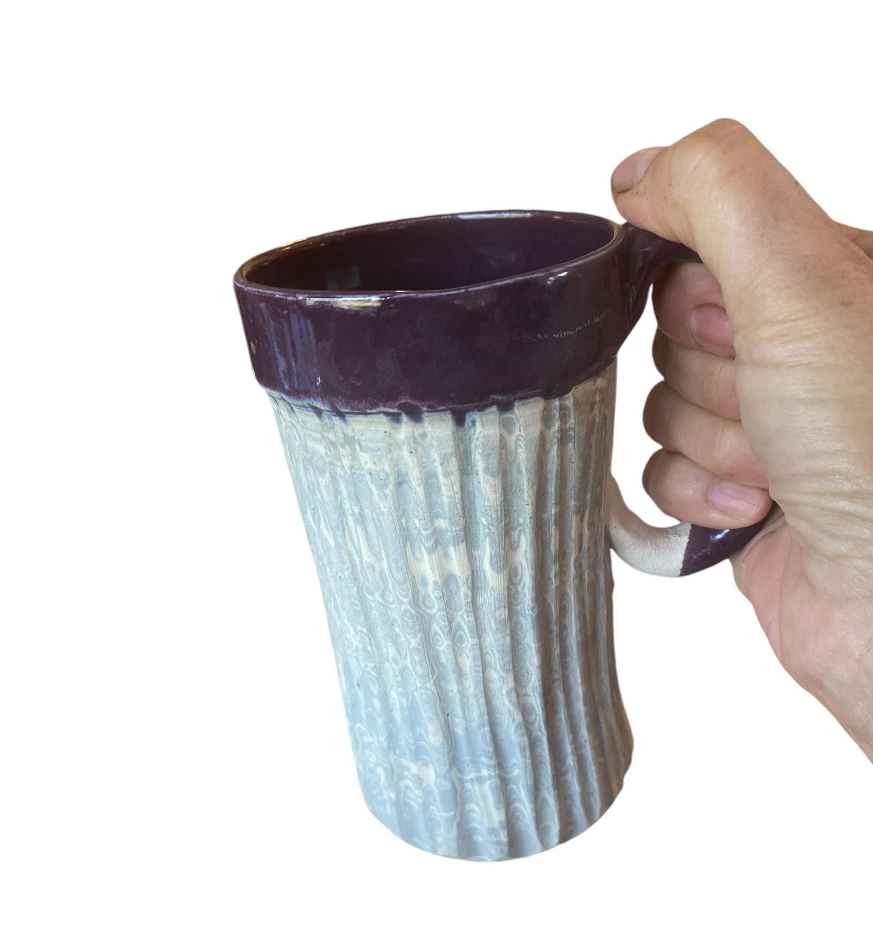 Enjoy your morning coffee or afternoon tea in style with this Gray and White Agateware mug. Carefully hand-thrown from two clay colors, this mug features an intricately carved design created at the leather-hard stage. After the initial firing, the mug was glazed with a lavender glaze and fired a second time. The exterior was then sanded with five grits of diamond sandpaper to create a smooth, raw surface. The end result is a mug that feels comfortable in your hands, with protective glazes that enhance and preserve the intricate design. This mug is a must-have for any coffee or tea enthusiast, perfect for nature lovers and anyone looking to add a bit of whimsical elegance to their drinkware collection.