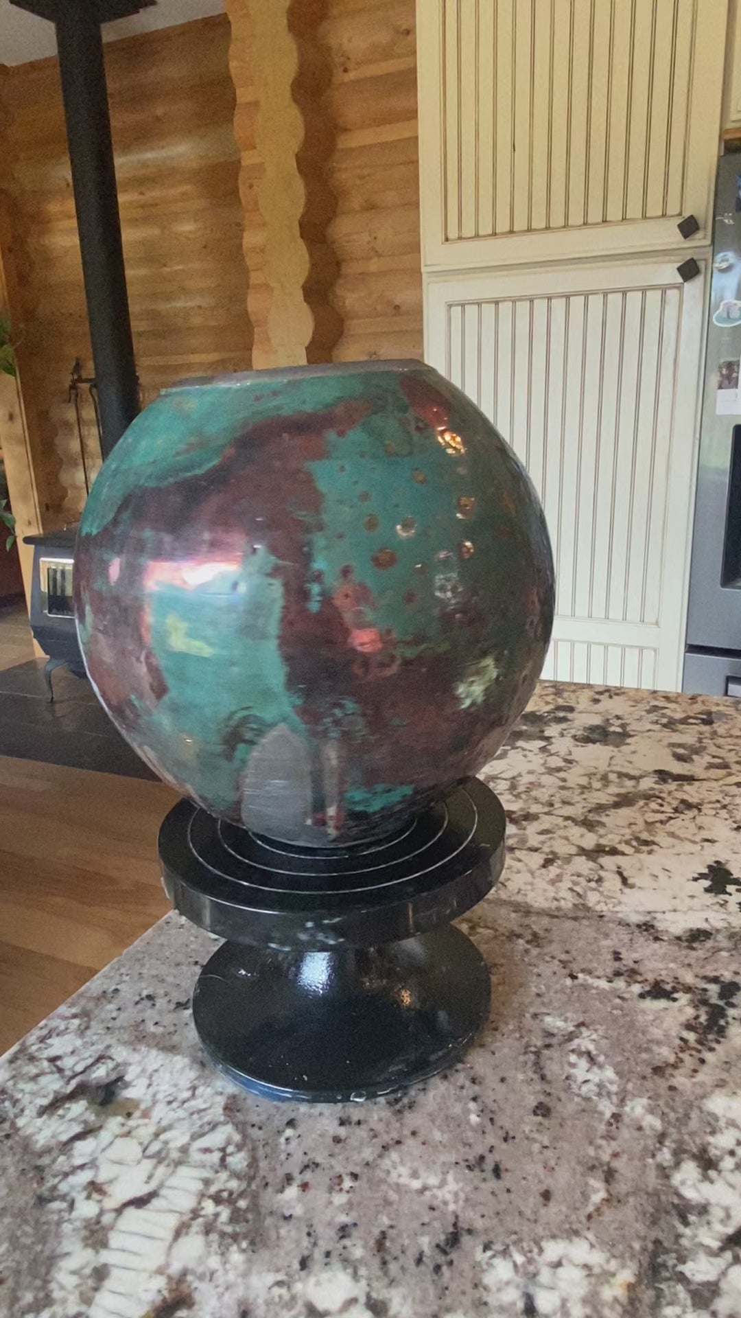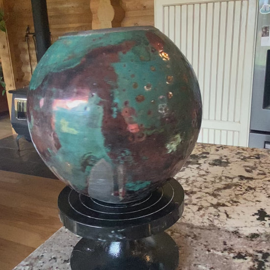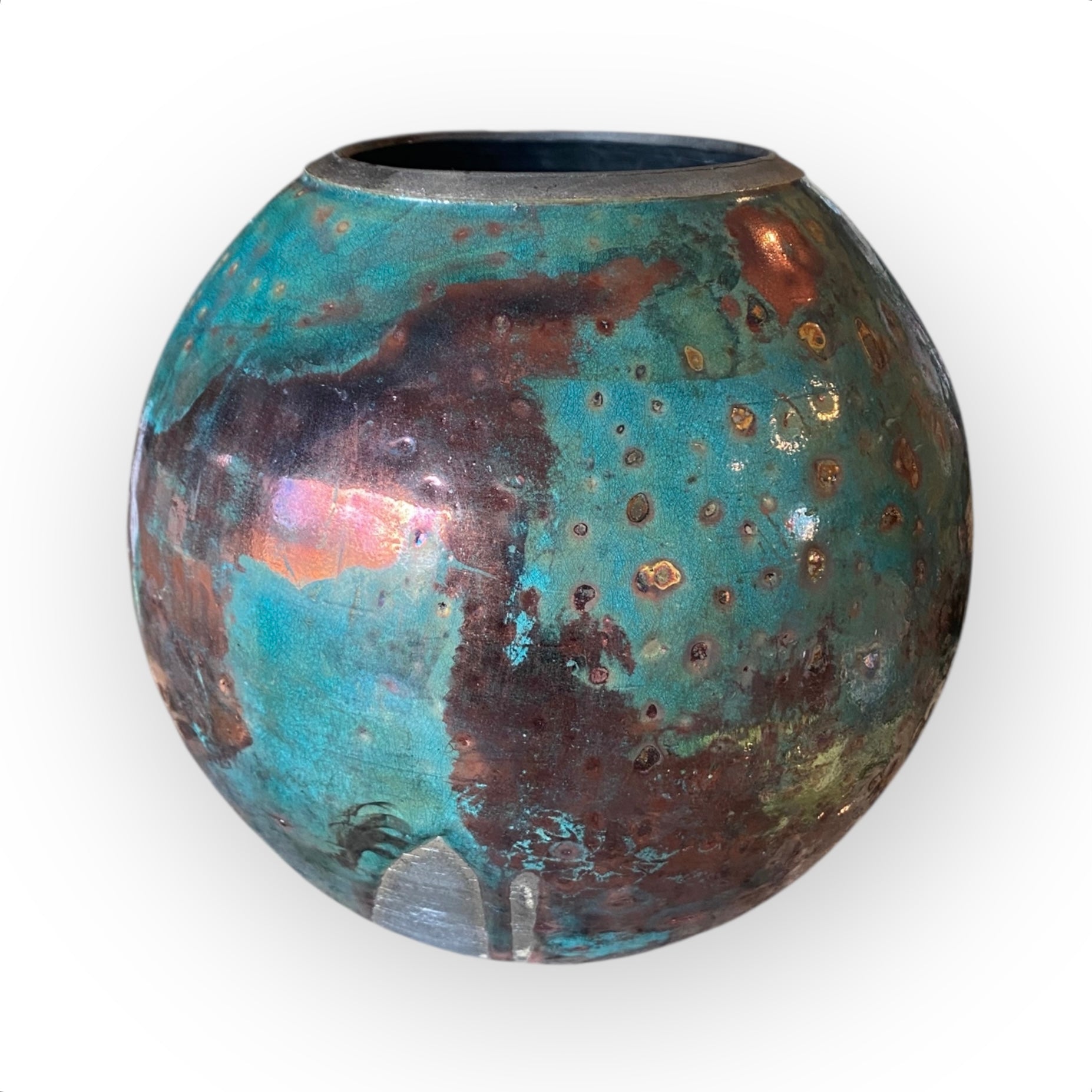 I created this Raku-fired moon jar on an electric pottery wheel from white Raku clay. After a first firing, I did a raku firing on this piece to create a one-of-a-kind piece of art.