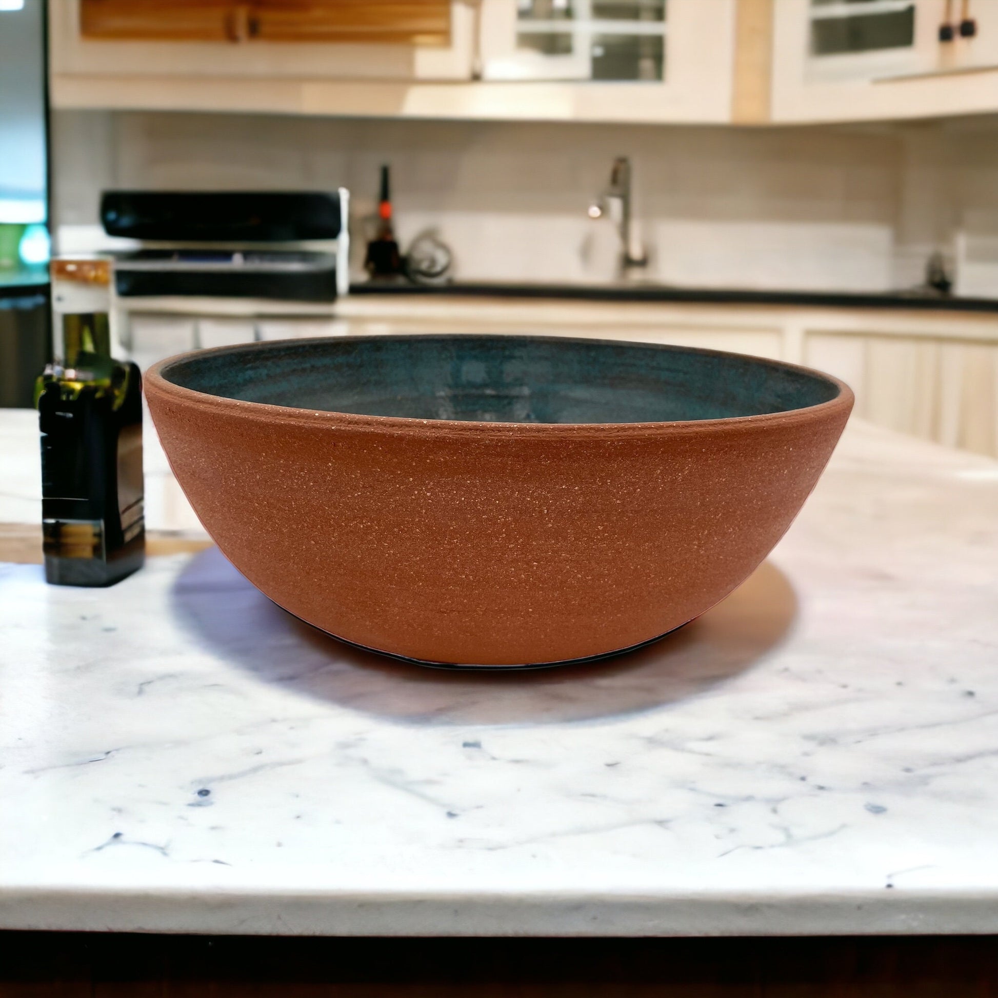 I threw this bowl on an electric pottery wheel out of earthenware mica clay. After a first firing, the interior of the pot was glazed with a turquoise glaze and the exterior was burnished and left bare. The end result is a bowl to compliment food while letting the beauty of the clay show through.