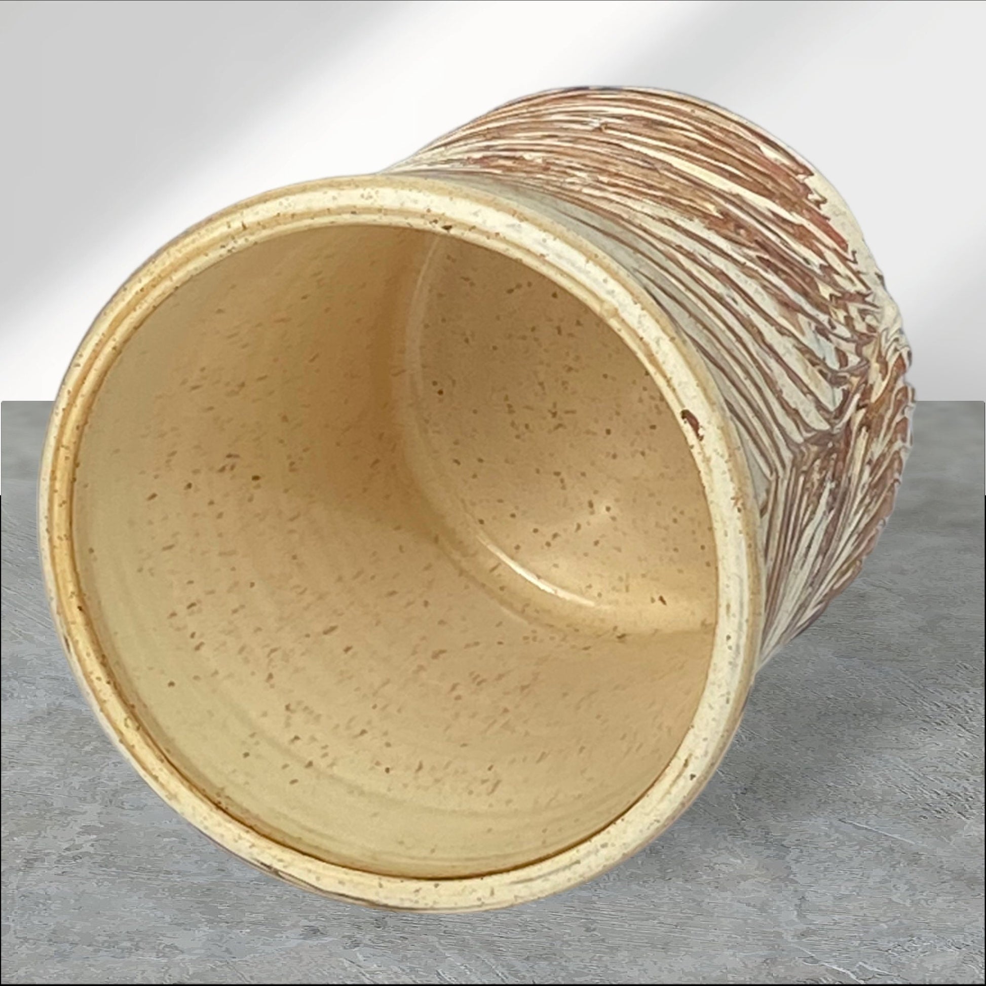 The exterior is hand-carved and diamond sanded for a smooth, tactile finish, while the interior and rim are glazed in a warm reactive butter glaze, creating a golden contrast with the raw clay body.