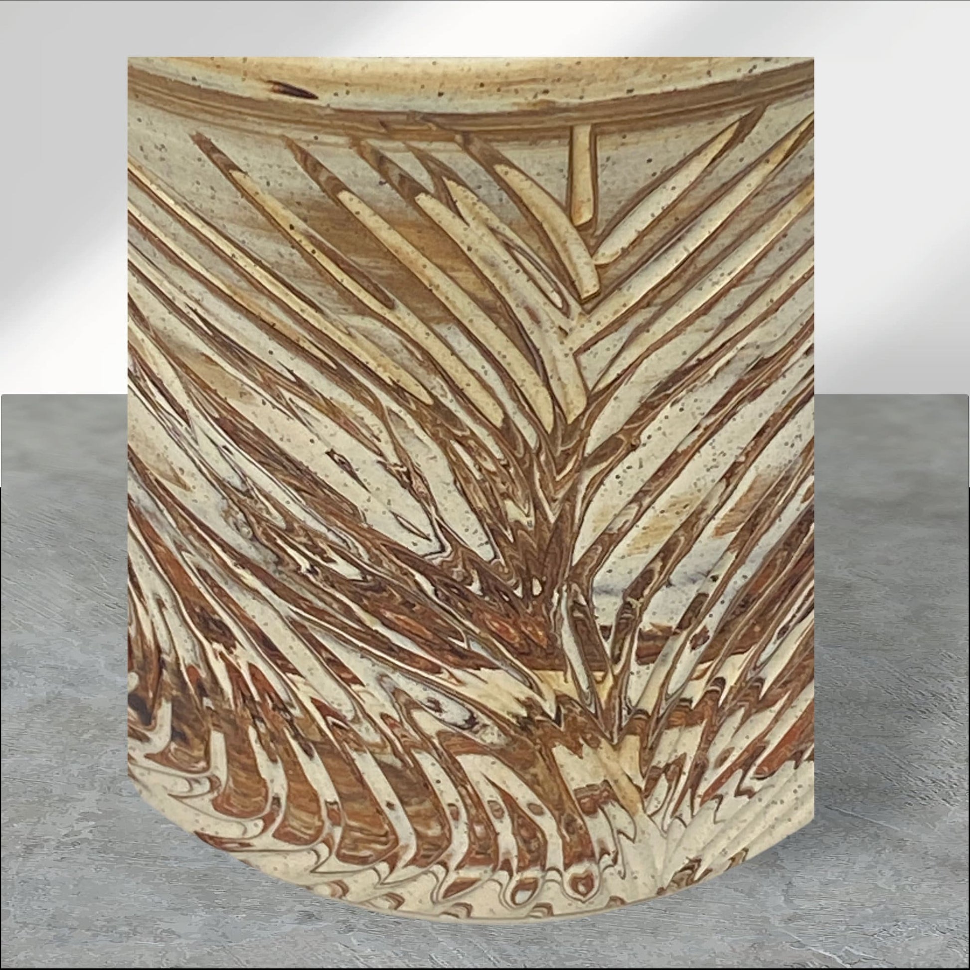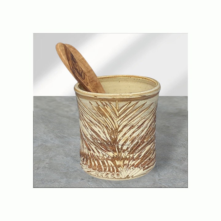 Bring handcrafted elegance and everyday function to your kitchen with this handmade carved agateware utensil crock. Thrown on the pottery wheel from three layers of marbled stoneware clay, this ceramic kitchen crock features a beautiful natural pattern, highlighted by a fluid carved design that makes each piece truly one of a kind.