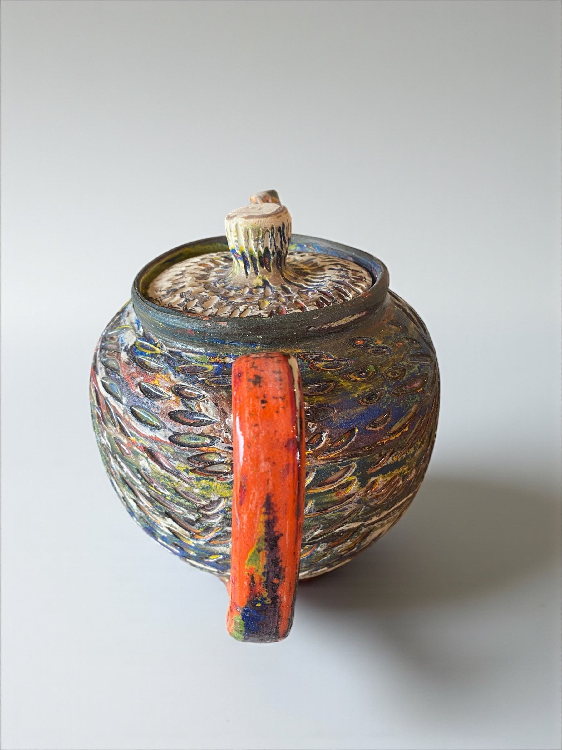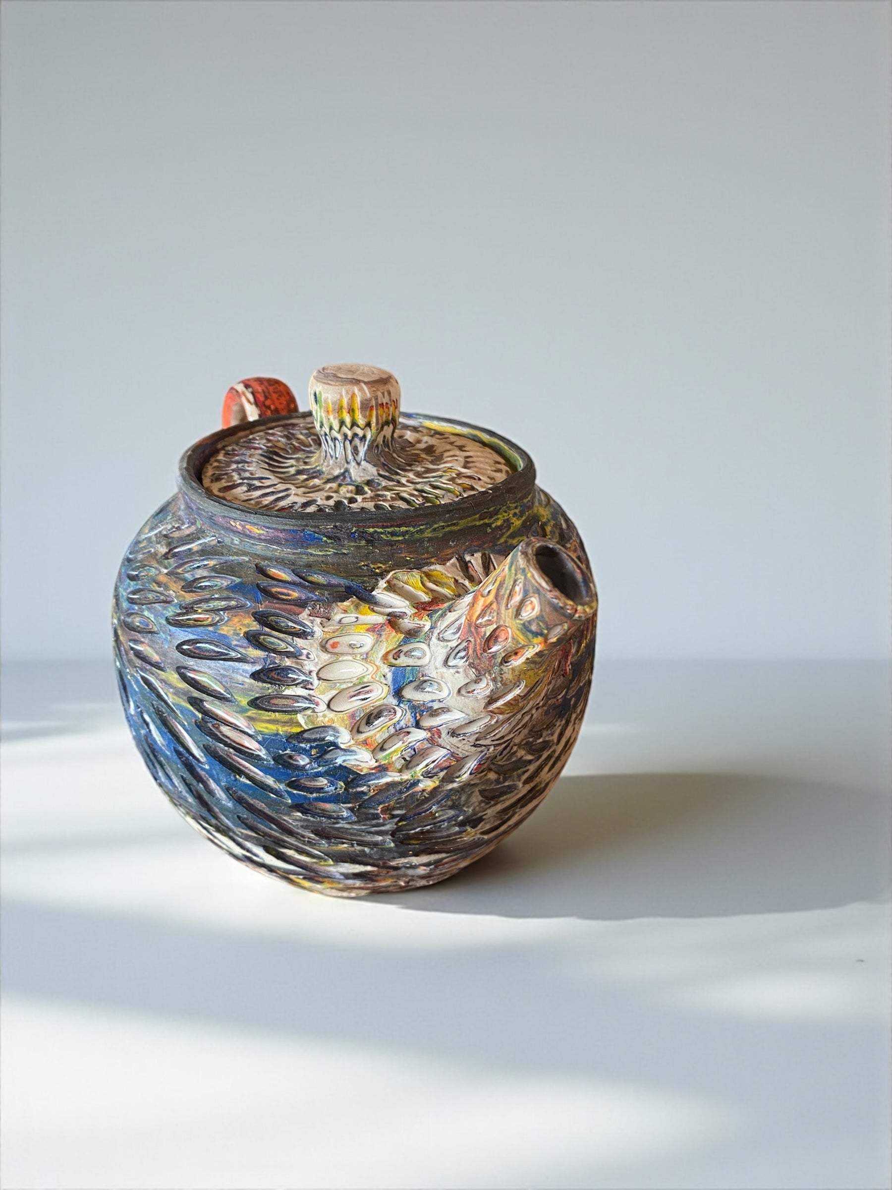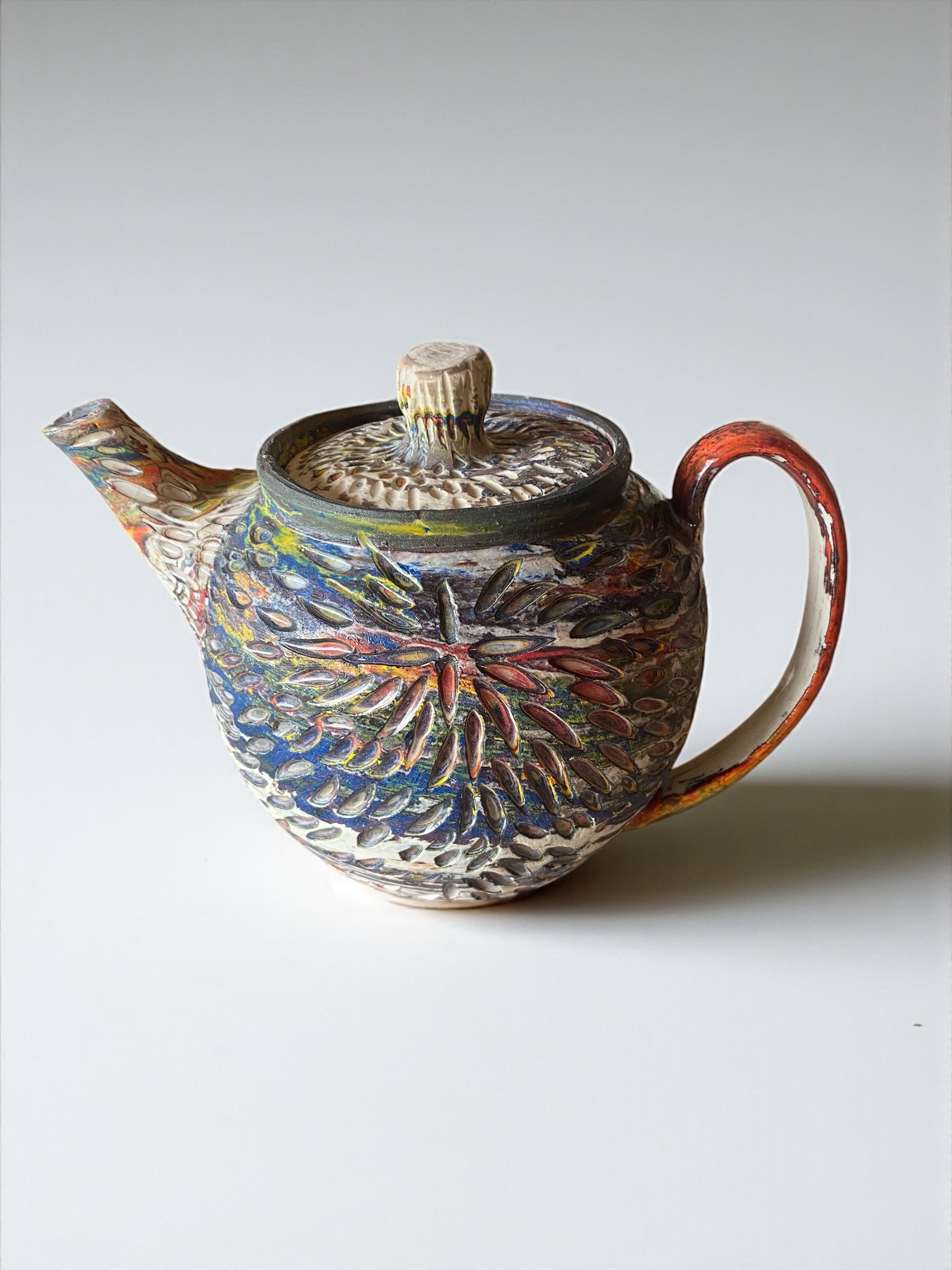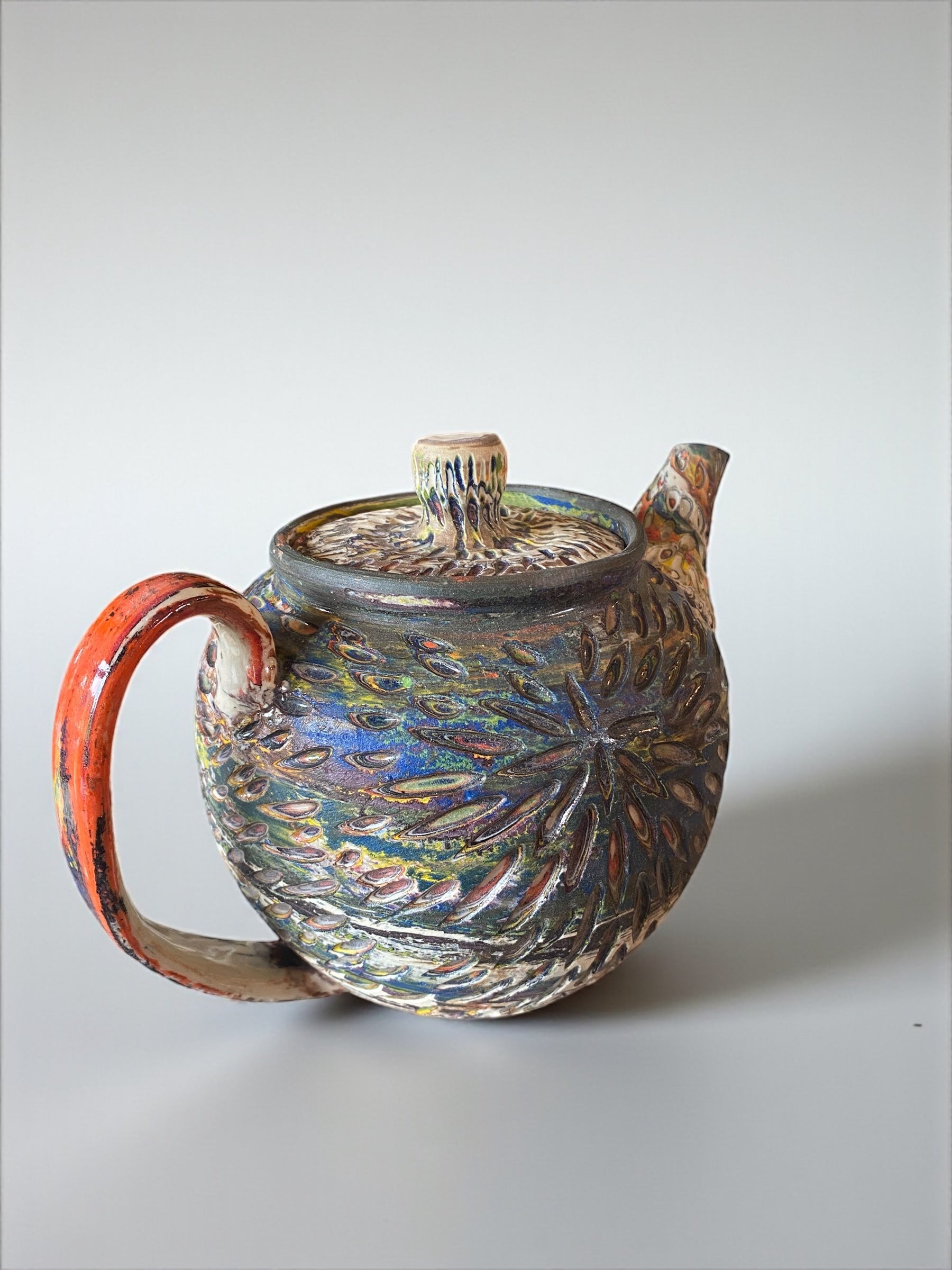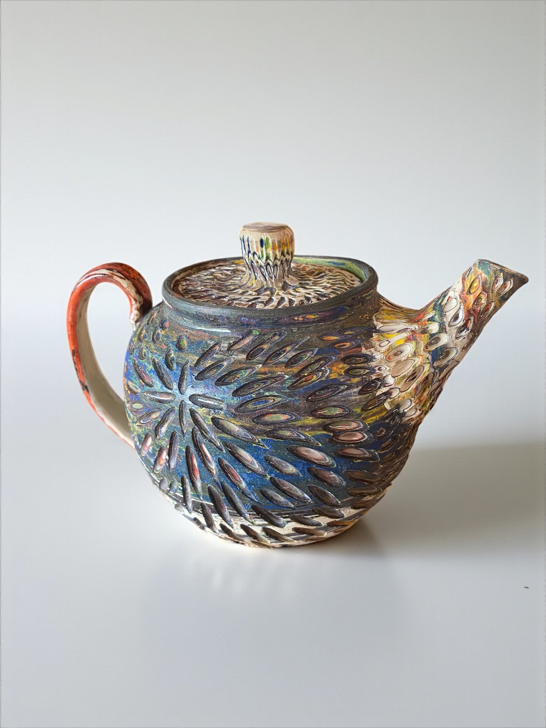 This handcrafted porcelain teapot is created using a unique process that makes the clay itself part of the design. I begin by coloring porcelain clay with pigments, then carefully layer the different colors together. Once the form is thrown and trimmed, I carve through these layers to reveal intricate, one-of-a-kind patterns that make every teapot a work of art.