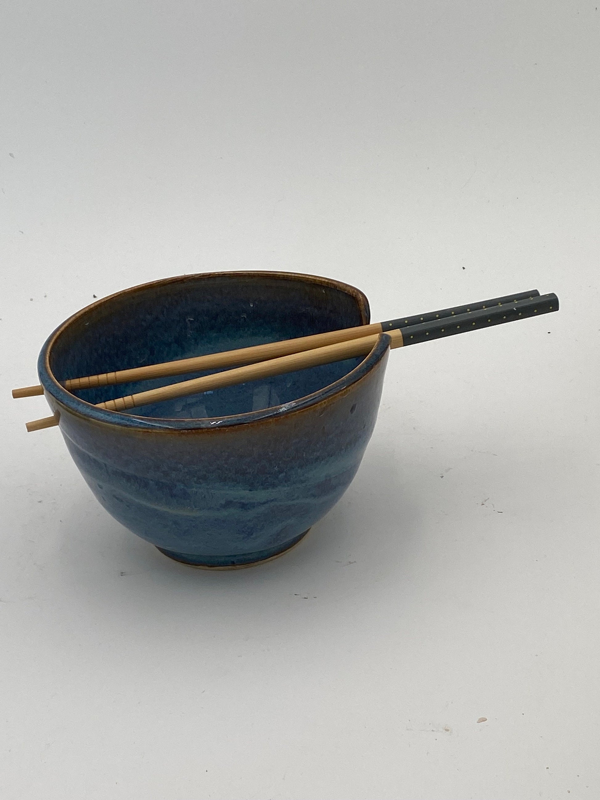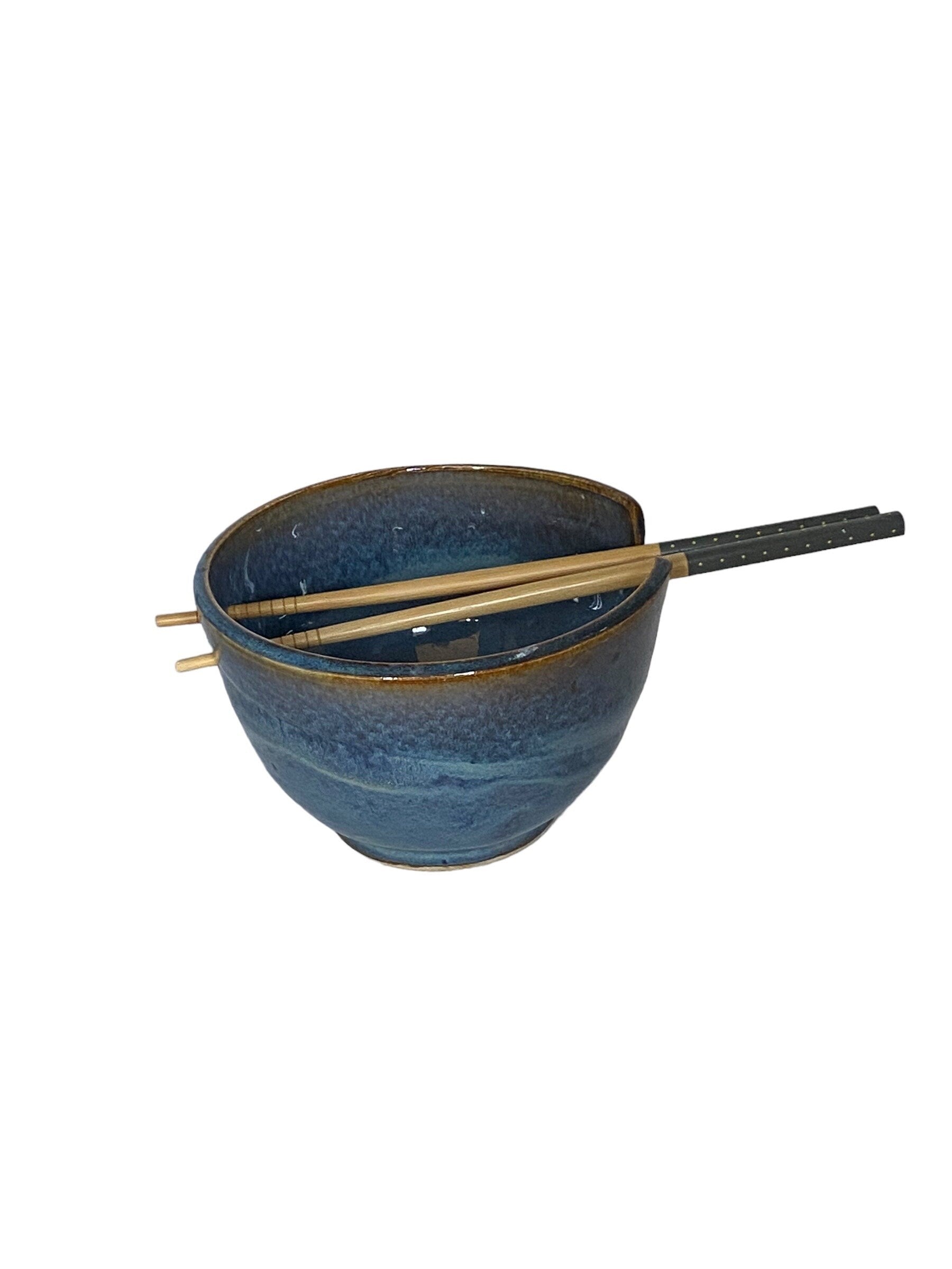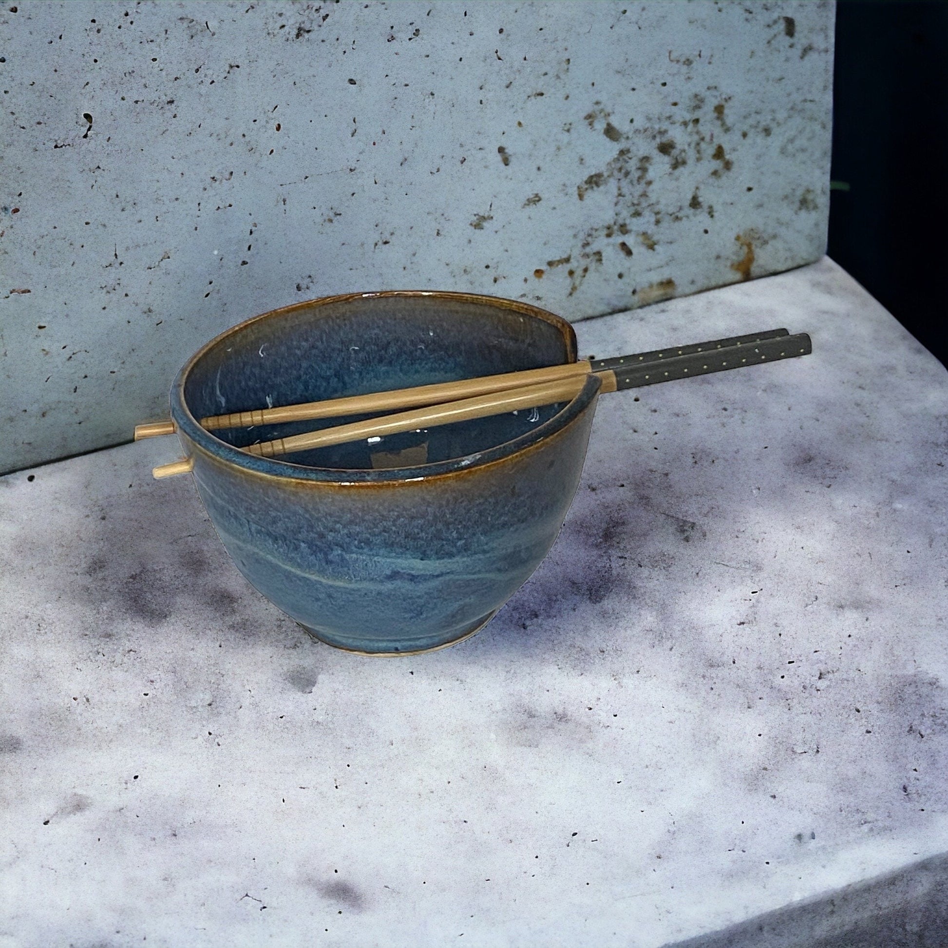 Petite Blue Ramen Bowl Set with Matching Chopsticks - Handmade Pottery Stoneware for Noodles & Soup