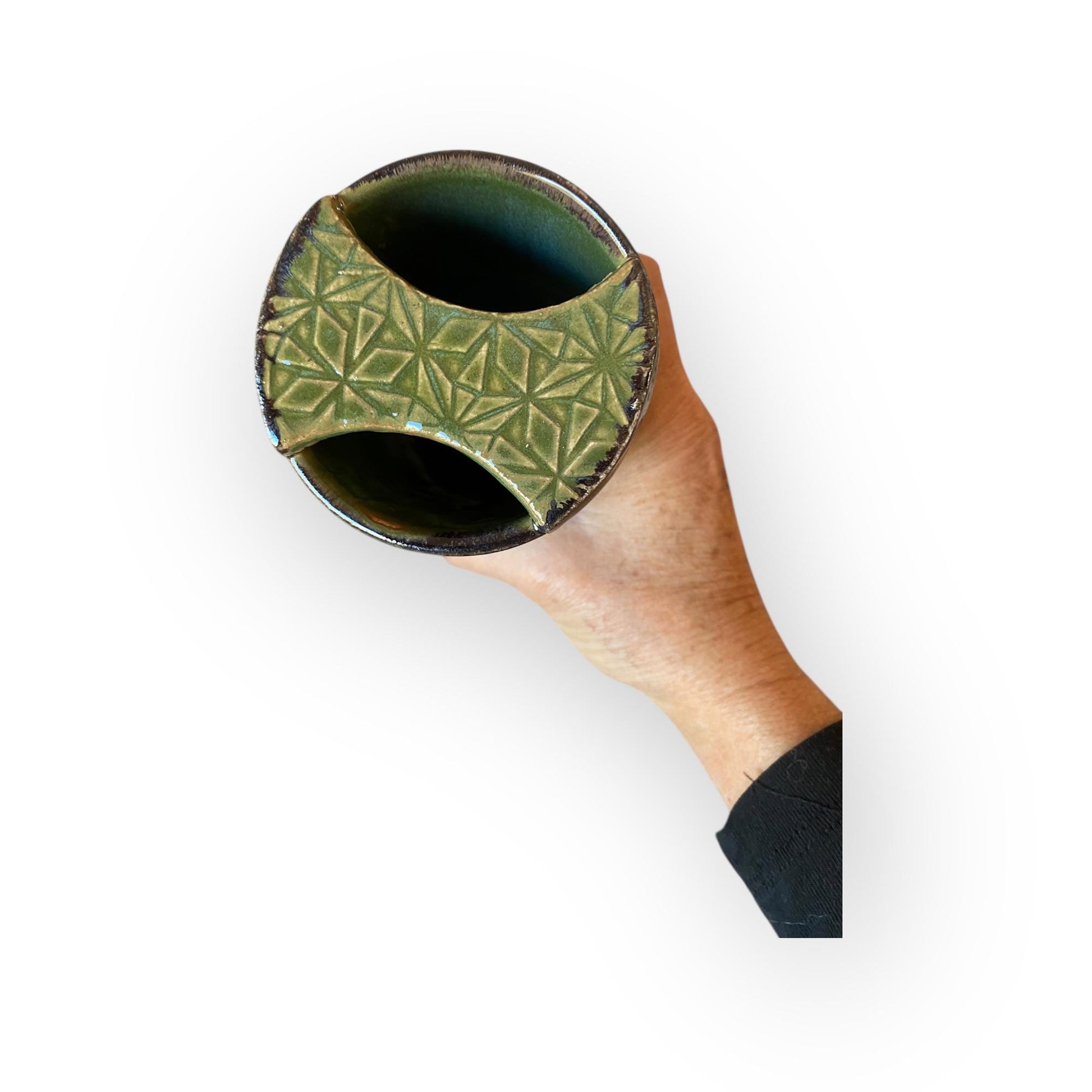 Take your favorite drink anywhere with this plastic-free ceramic travel mug. Handmade from sturdy stoneware clay and glazed in a reactive green finish, this 16 oz tumbler features an attached ceramic locking lid with a distinctive geometric pattern—no plastic parts needed. Perfect for coffee, tea, or any hot beverage, this eco-friendly travel mug is great for nature lovers, pottery fans, and those who prioritize sustainable living.