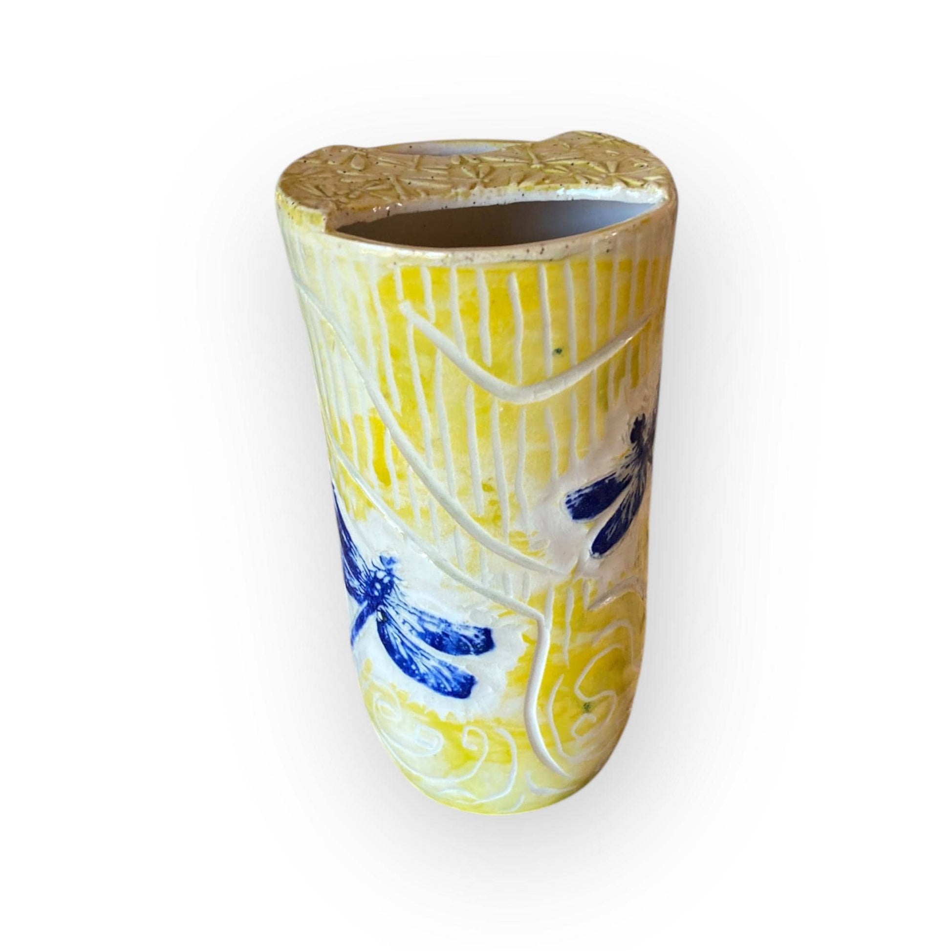 Take your favorite drink anywhere with this plastic-free ceramic travel mug. The mug is handmade, silkscreened, and carved with a dragonfly theme. This 16 oz tumbler features an attached ceramic lid with a distinctive sea life pattern—no plastic parts needed. Perfect for coffee, tea, or any hot beverage, this eco-friendly travel mug is great for nature lovers, pottery fans, and those who prioritize sustainable living.