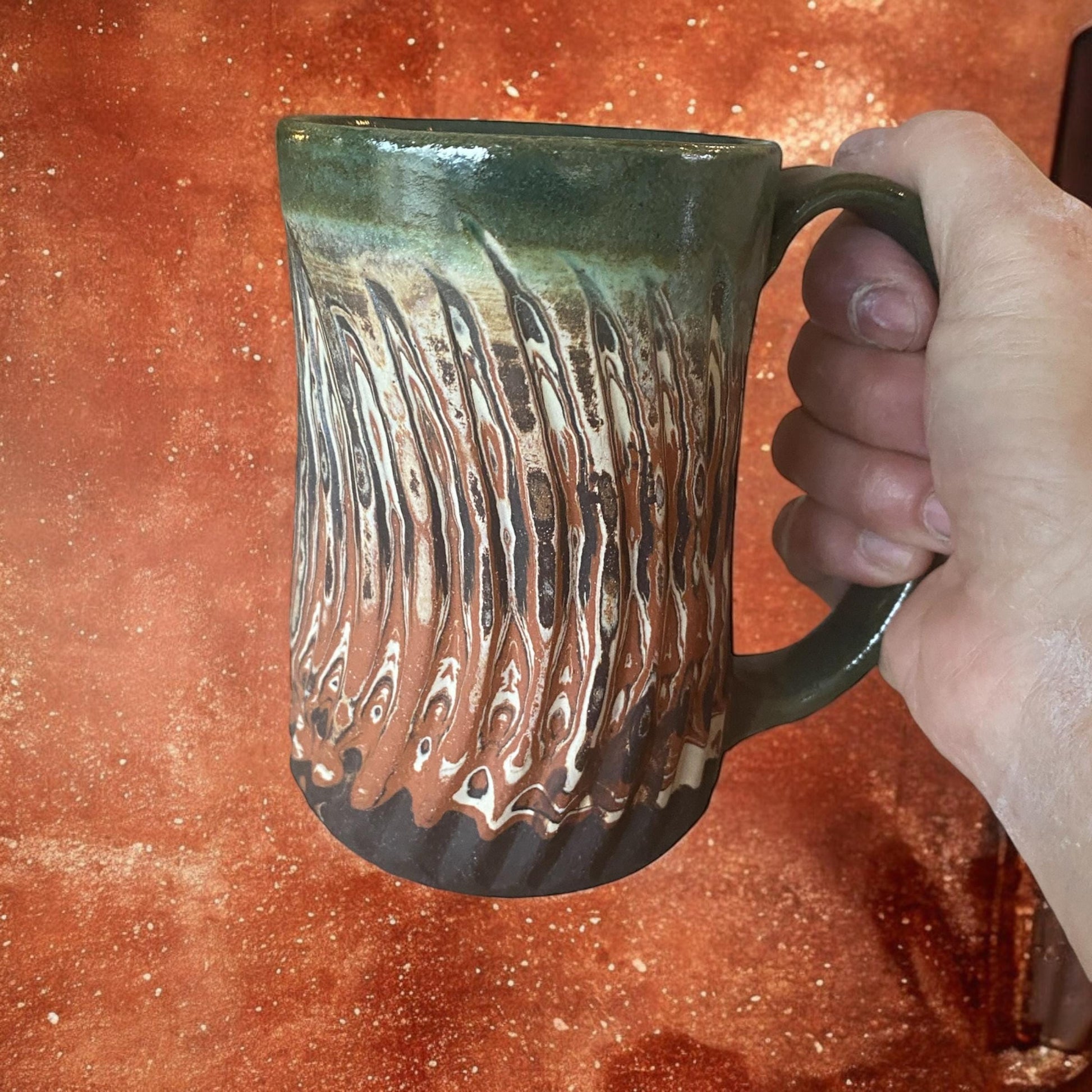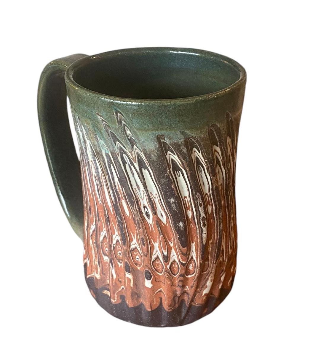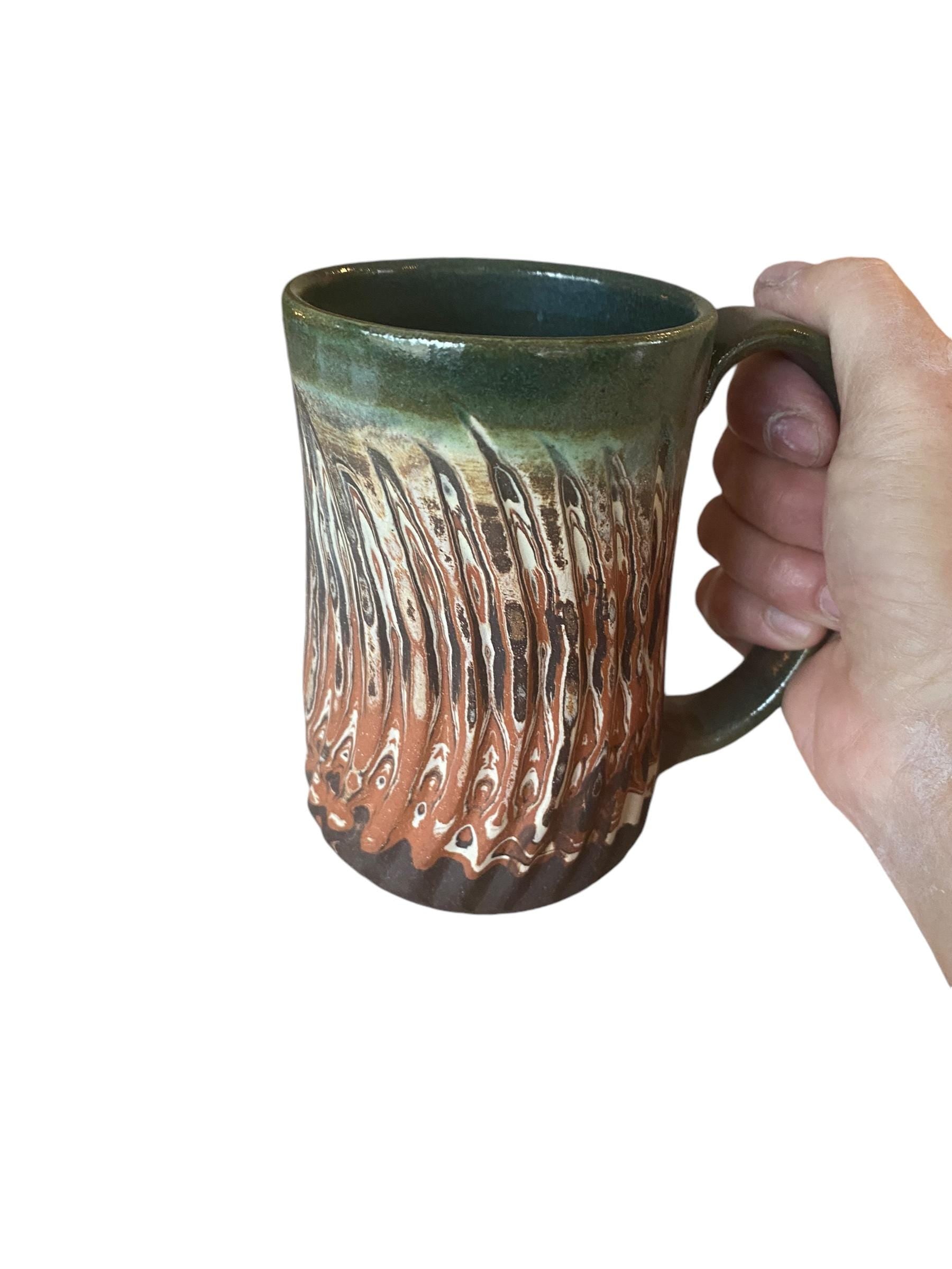 Indulge in a stylish coffee or tea experience with my Red, White, and Black Agateware Carved Coffee Mug, part of my handmade pottery collection. Crafted from red, white, and black stoneware, this mug features a captivating and distinctive design. Hand-thrown with care, it offers a comfortable grip for your hands, while the sage reactive glaze accentuates the intricate layers of clay. Whether it's your morning ritual or an afternoon pick-me-up, this mug adds an elegant touch to any moment. Elevate your daily routine with this essential piece for coffee and tea enthusiasts alike.