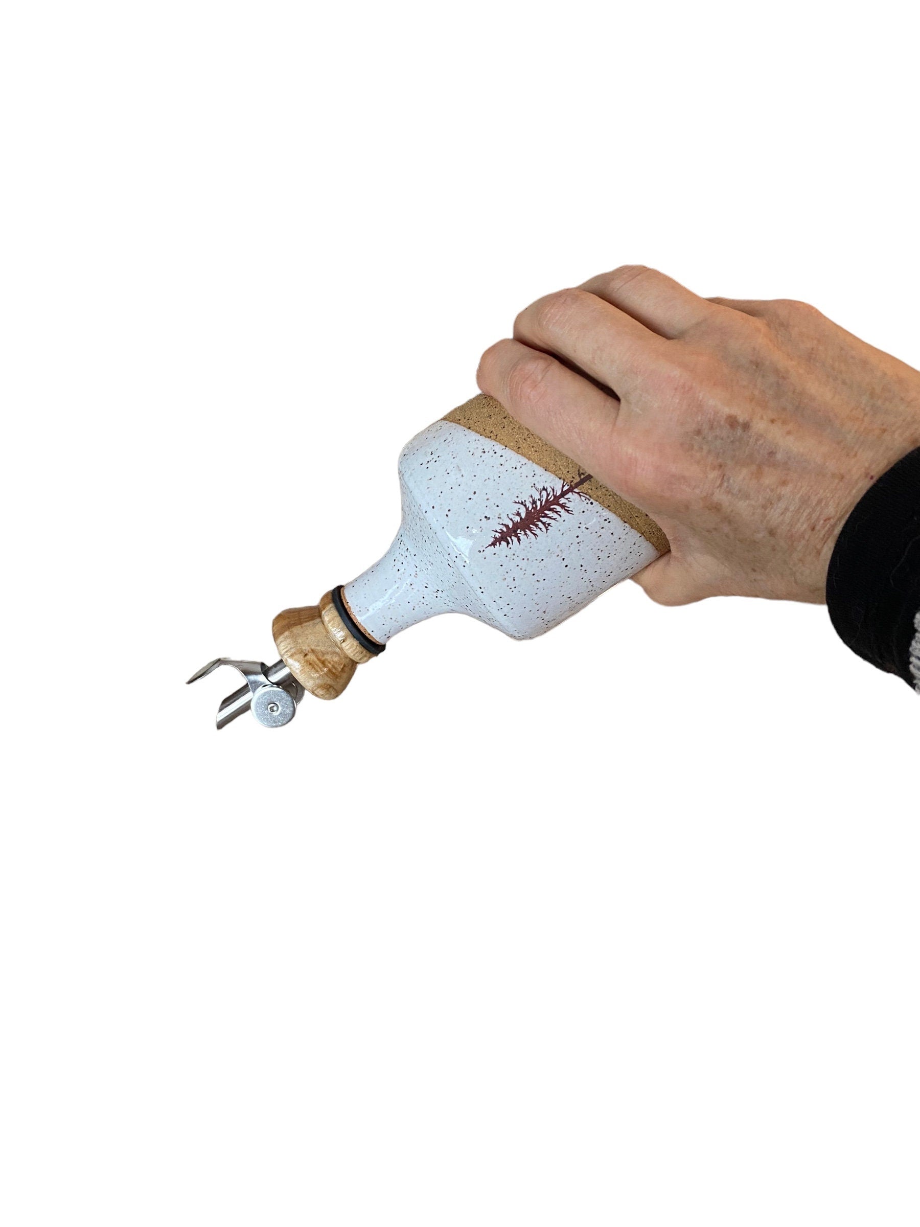 My hand thrown Speckled White Oil Bottle is ready to elevate your kitchen aesthetics. With Douglass Fir Tree art adorning its surface and a wooden pour spout, this oil bottle is crafted with precision to enhance both your culinary experience and kitchen decor.